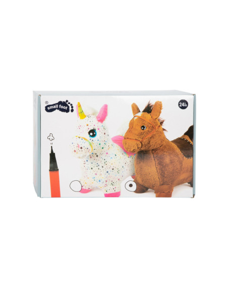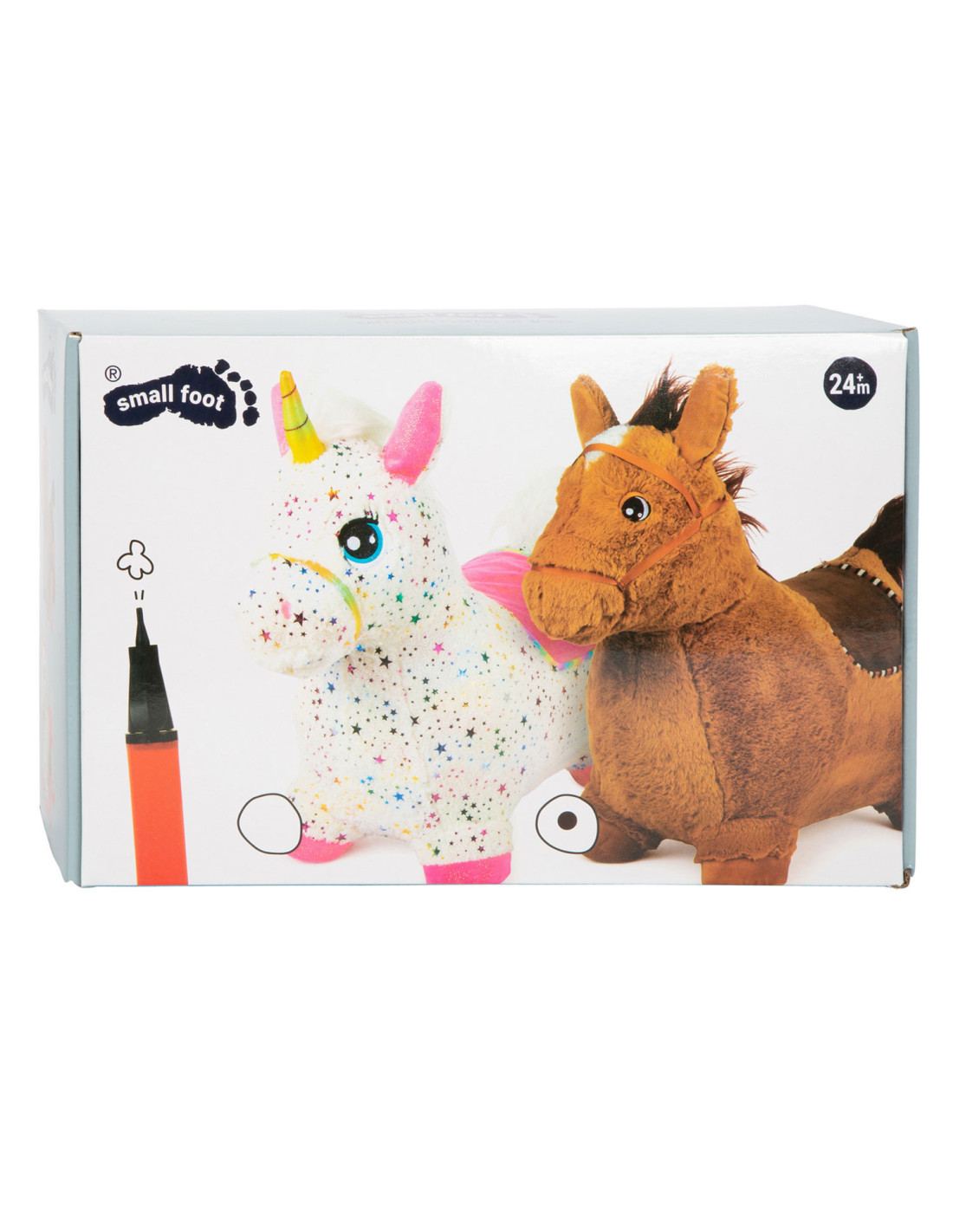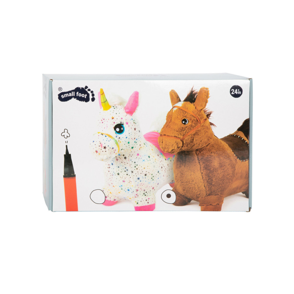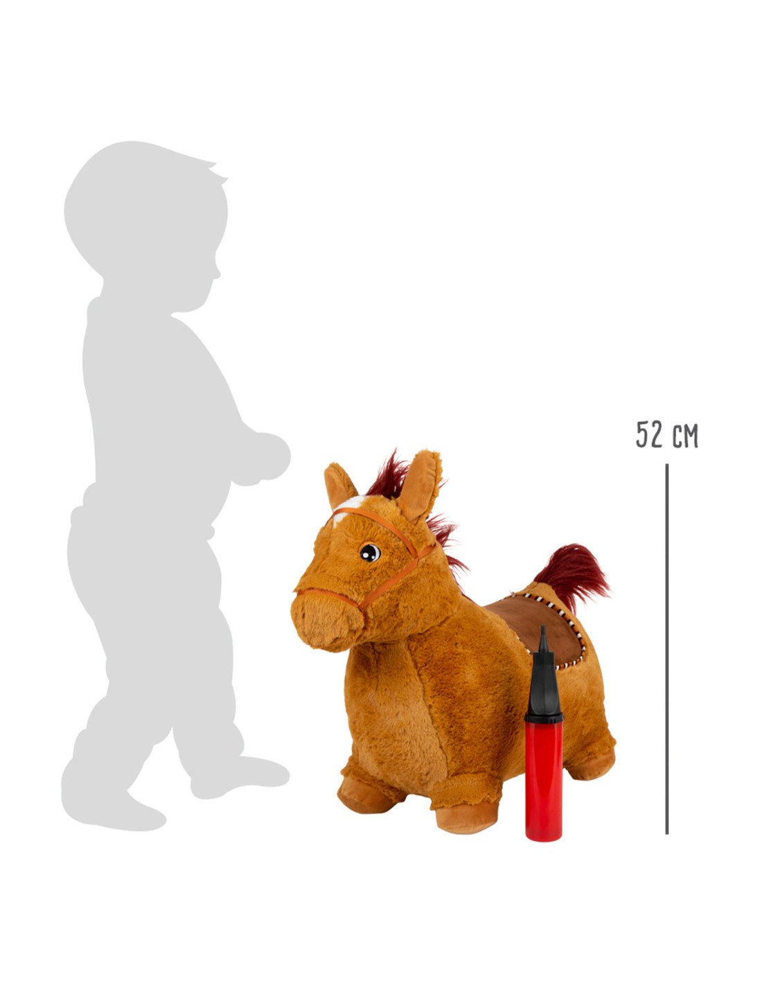 Dit knuffelzachte huppelpaard combineert een robuust rubberen lijf met pluizig zachte pluche vacht. Dat maakt het rijden op je favoriete huppeldier nog leuker! De zachte manen, staart, halster en zadel van het kleine huppelpaard zorgen voor realistisch speelplezier. Compatibele luchtpomp inbegrepen.