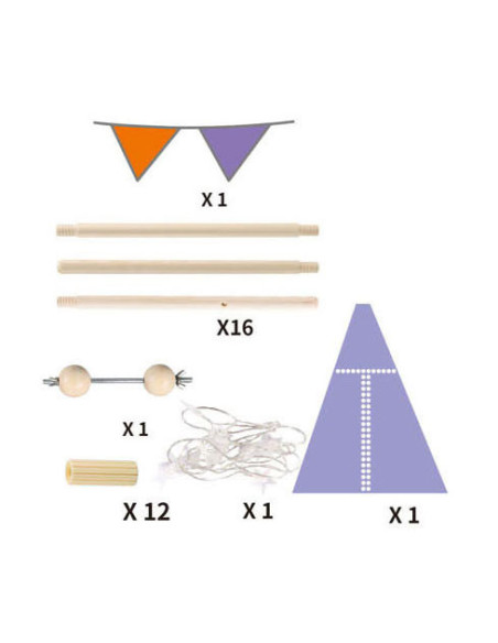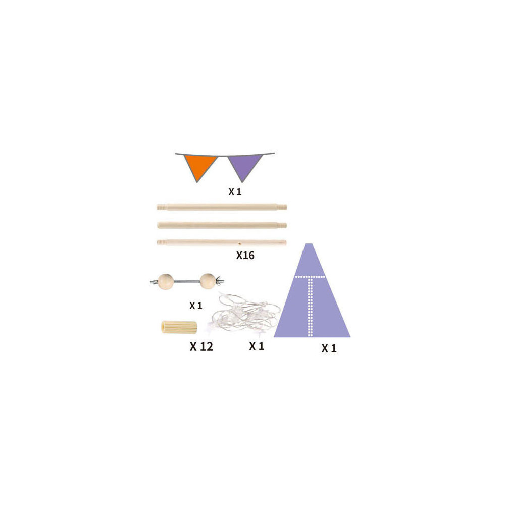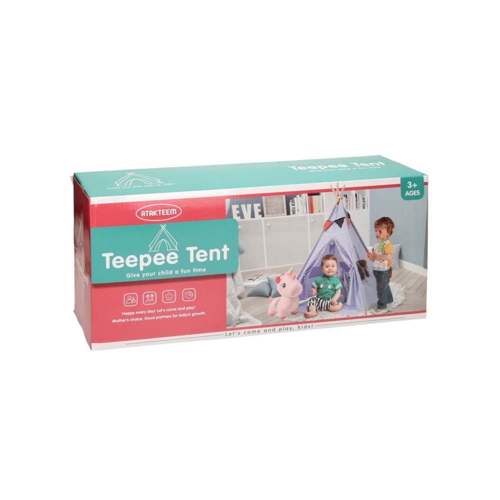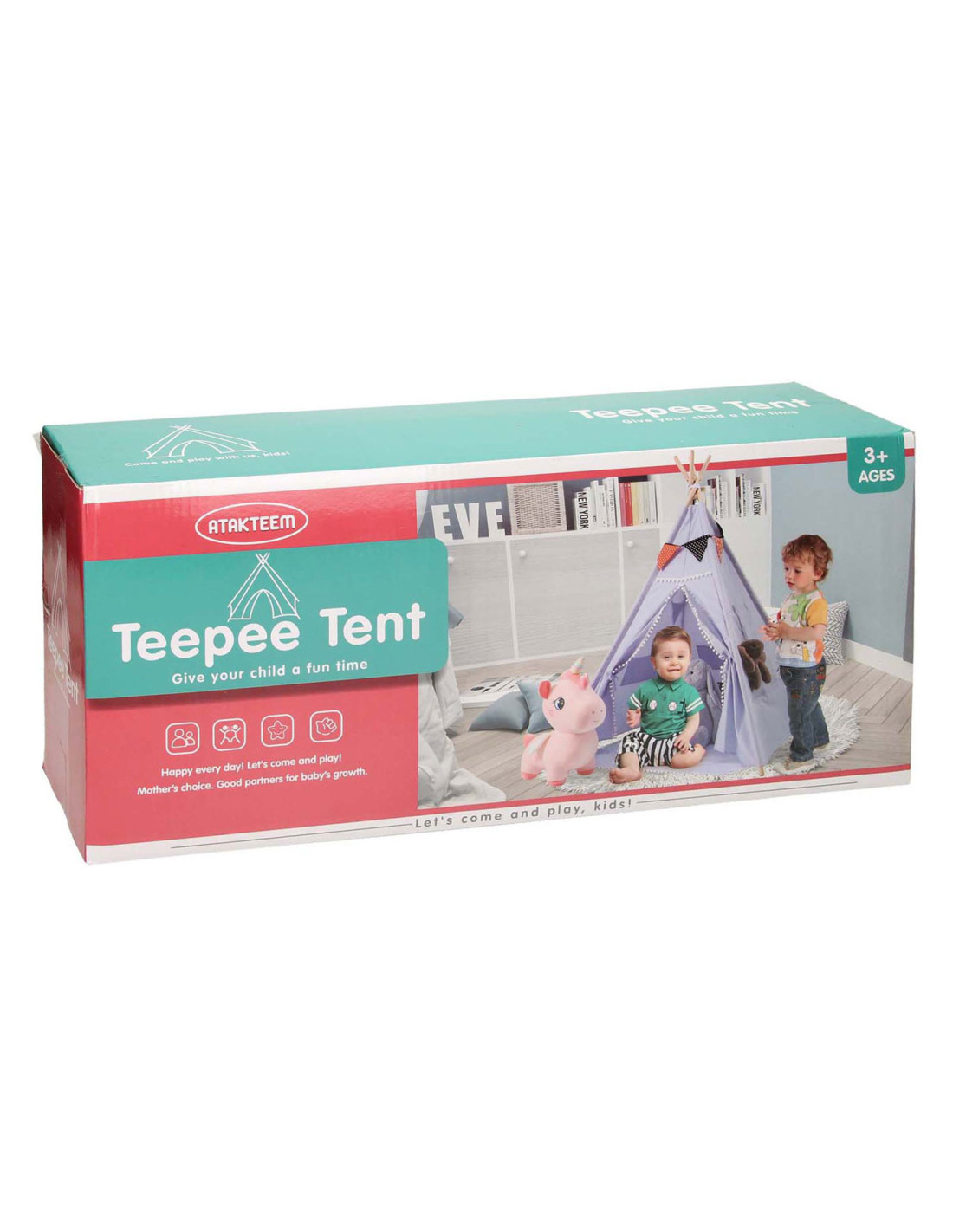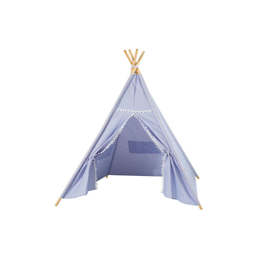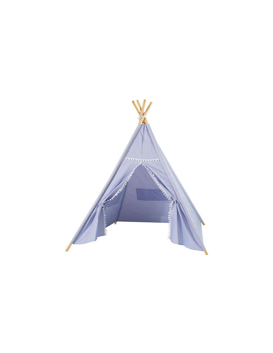 Kleine luxe tipitent. De tent is blauw en heeft witte pompons aan de tentdoeken. Bij de tent komen ook vlaggetjes en lampjes. De tent is geschikt voor kinderen vanaf 3 jaar. Lichtjes werken op 3 AA batterijen (niet inbegrepen). Afmeting tent: 90 x 90 x 128 centimeter