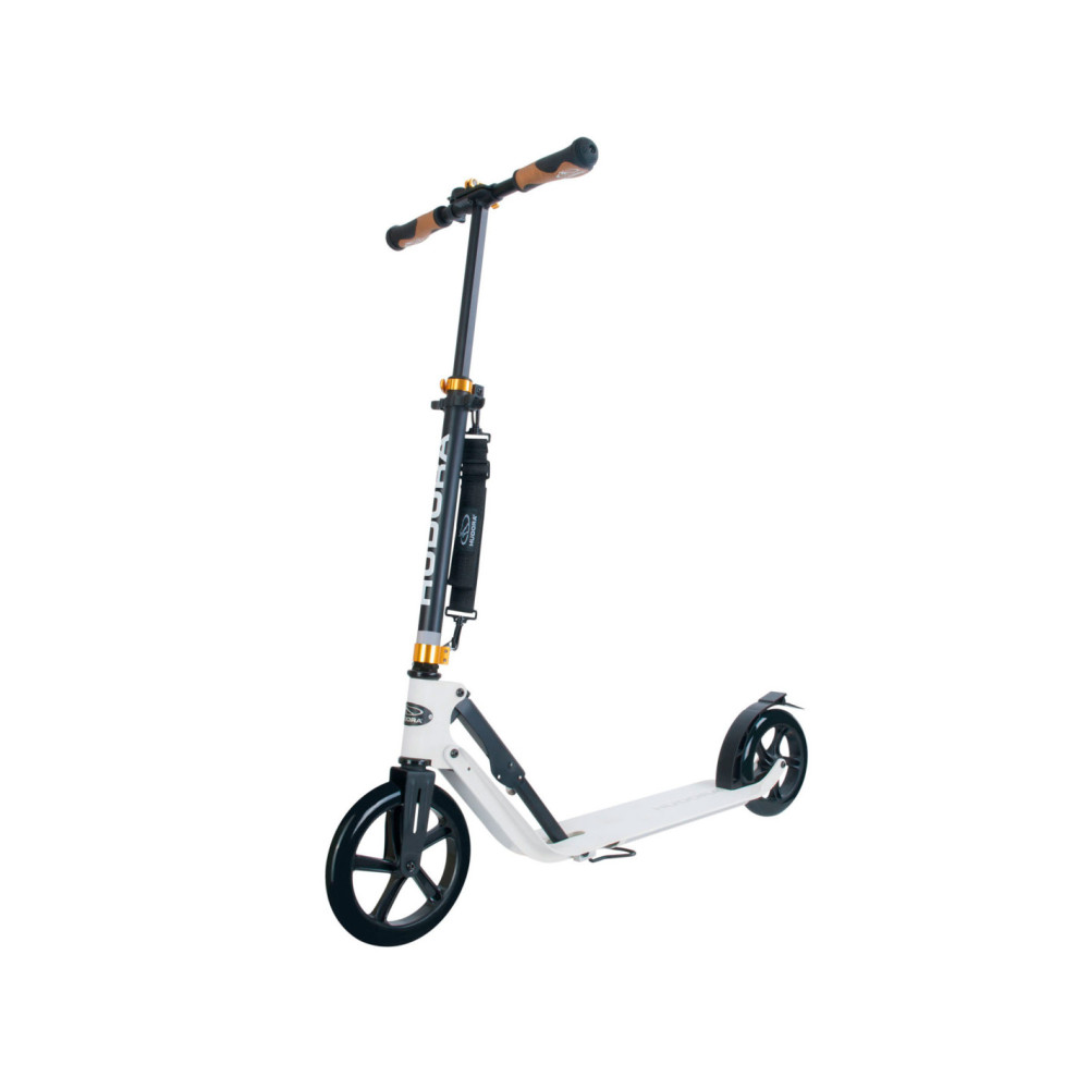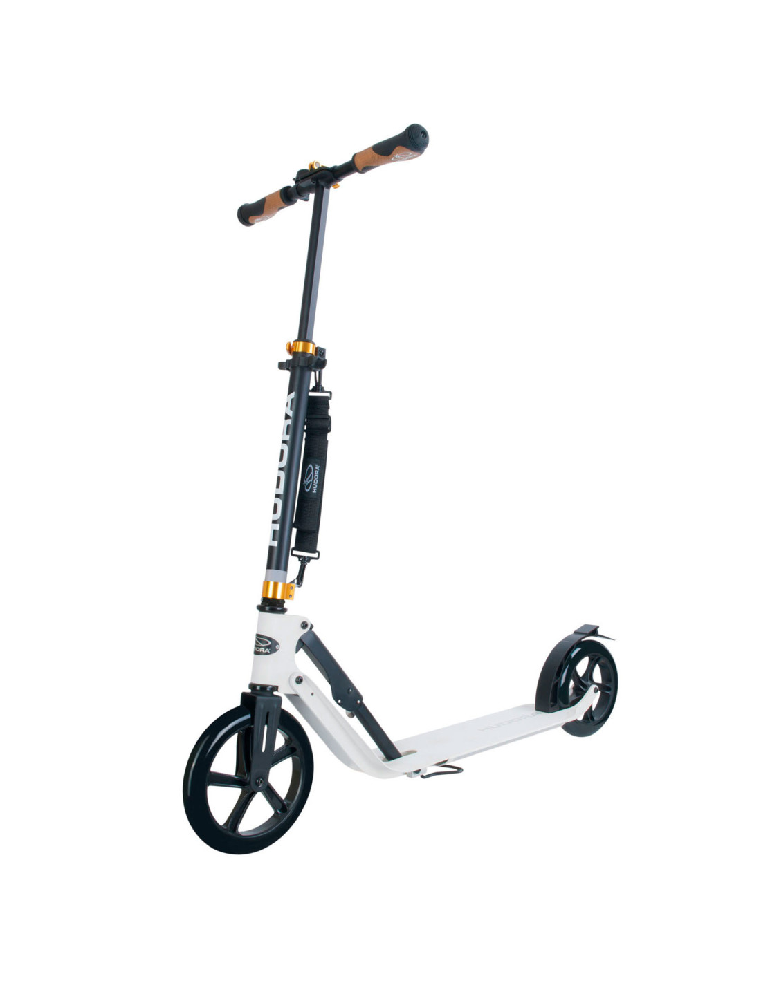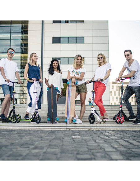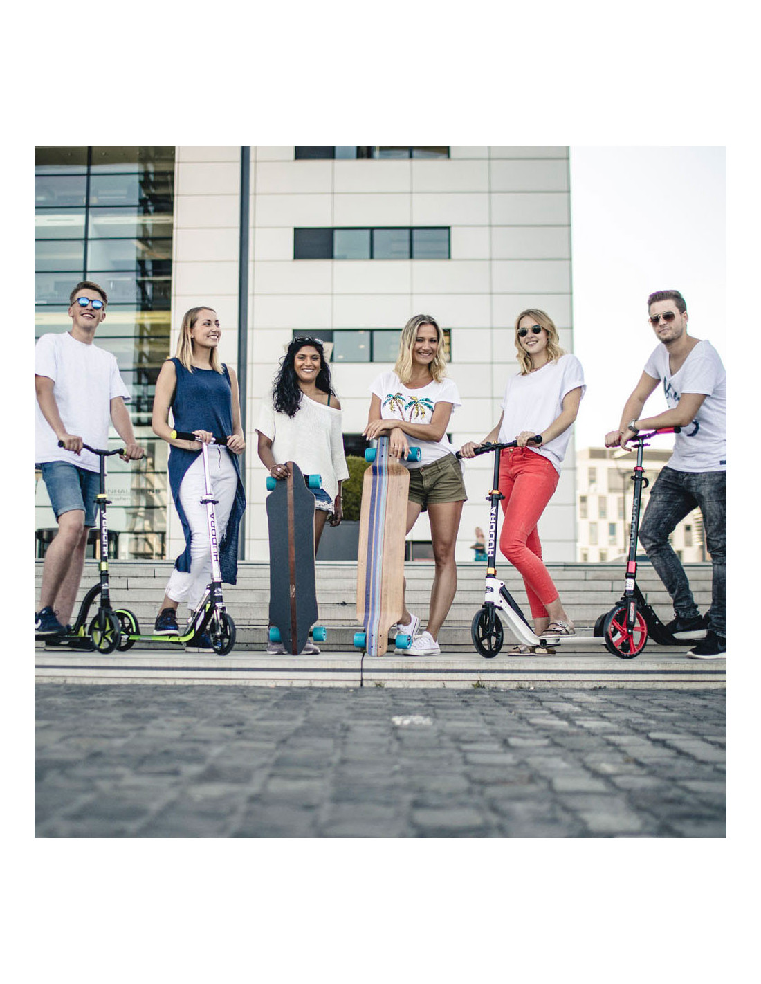 De Style 230 staat voor hoge snelheid met geweldig rijcomfort en maximale veiligheid. Hij overtuigt dankzij anti-shock comfort handgrepen, waarschuwingsbel en versterkt aluminium dek. Volwassen ruiters hebben ook voldoende ruimte op het supergrote opstapoppervlak. Een ander hoogtepunt is de geextrudeerde wrijvingsrem op het achterwiel, speciaal ontwikkeld voor de Style 230. Dankzij het functionele ontwerp wordt het niet zo snel warm en slijt het minder. De geïntegreerde vuilvanger houdt de benen schoon. De scooter is gewoon praktisch - voor het rijden naar kantoor, voor sport of voor kleine boodschappen. Eenmaal op uw bestemming aangekomen, kan de Style 230 eenvoudig worden ingeklapt en met de verstelbare schouderriem worden gedragen.
