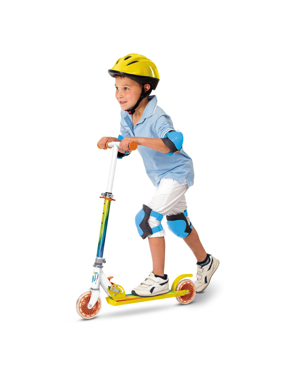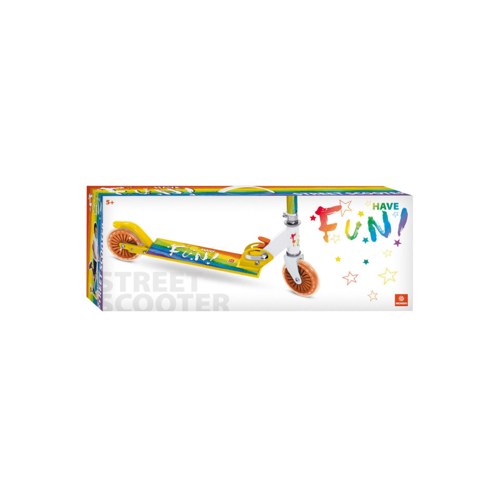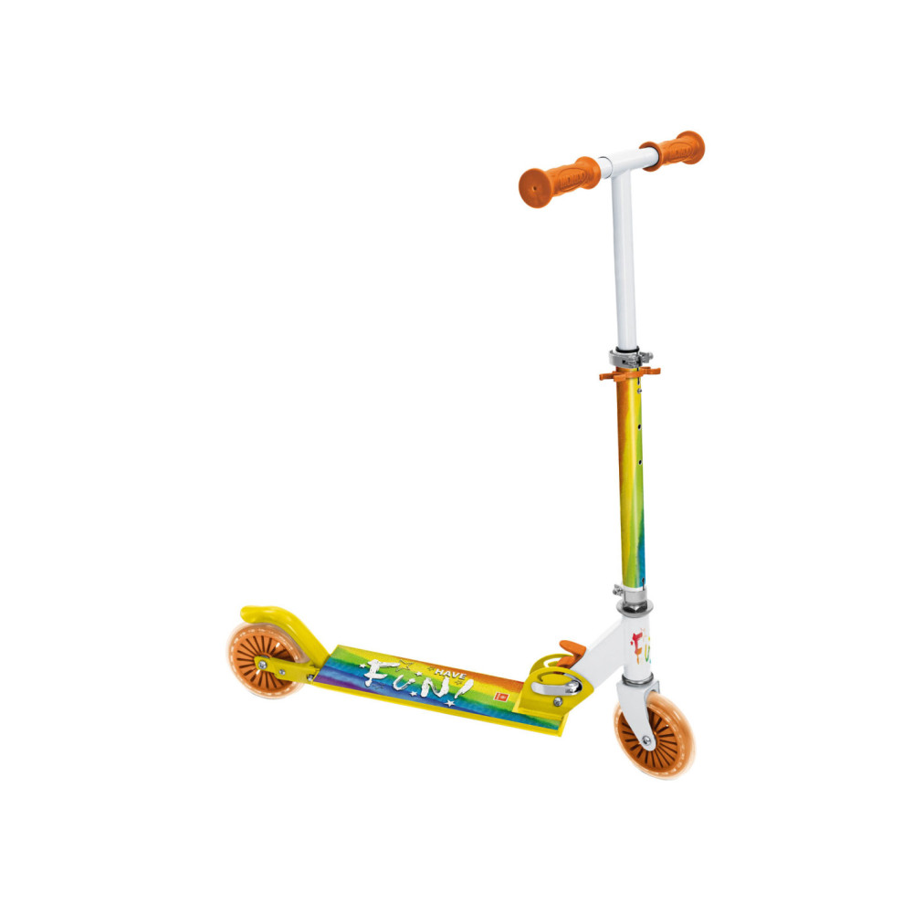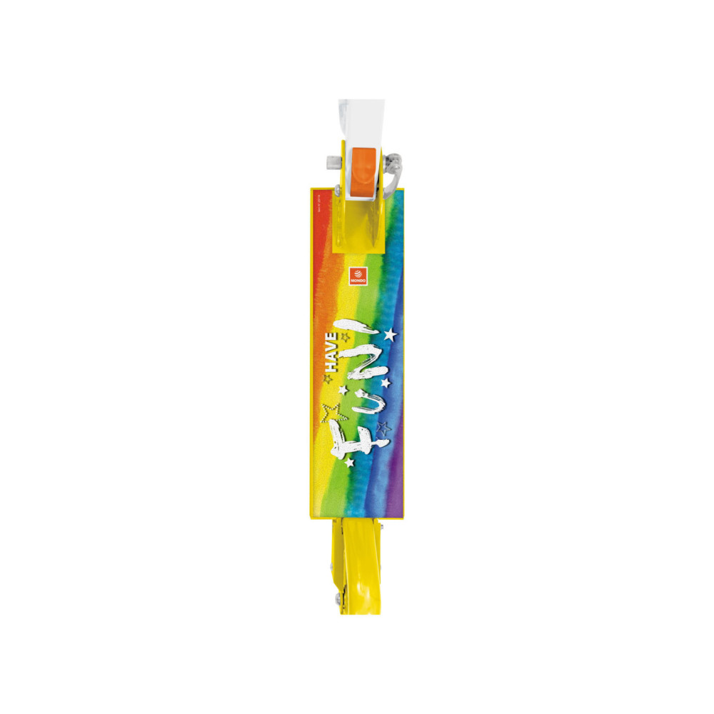 Kinderstep met wielen in regenboogdesign. De step heeft een rem, een in hoogte verstelbaar stuur en een eenvoudig vouwsysteem voor opbergen en vervoeren. Geschikt voor kinderen vanaf 5 jaar oud met een maximaal gewicht van 50 kg.