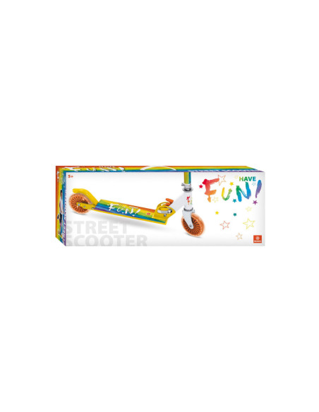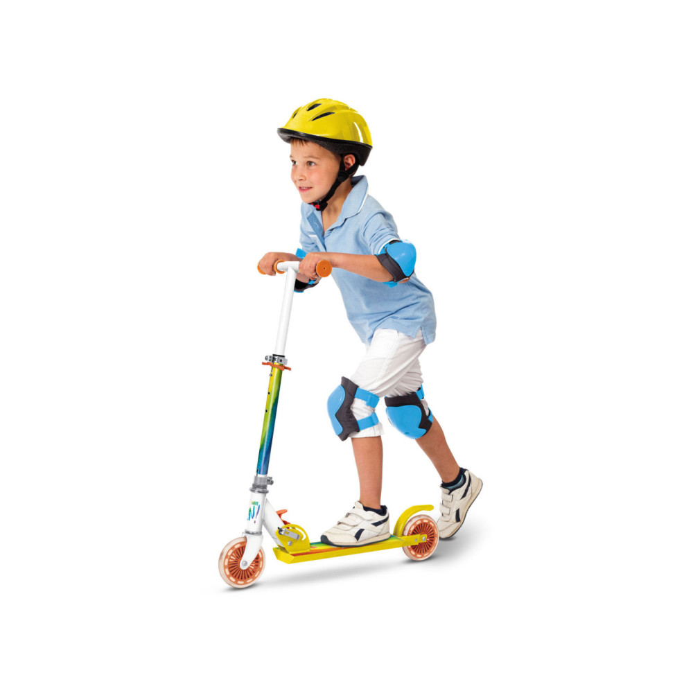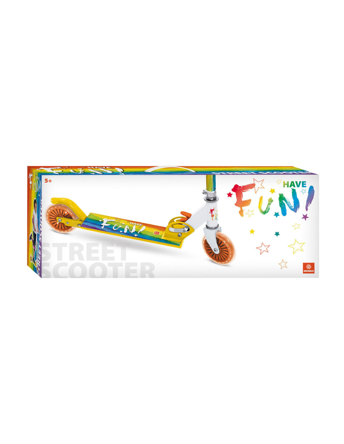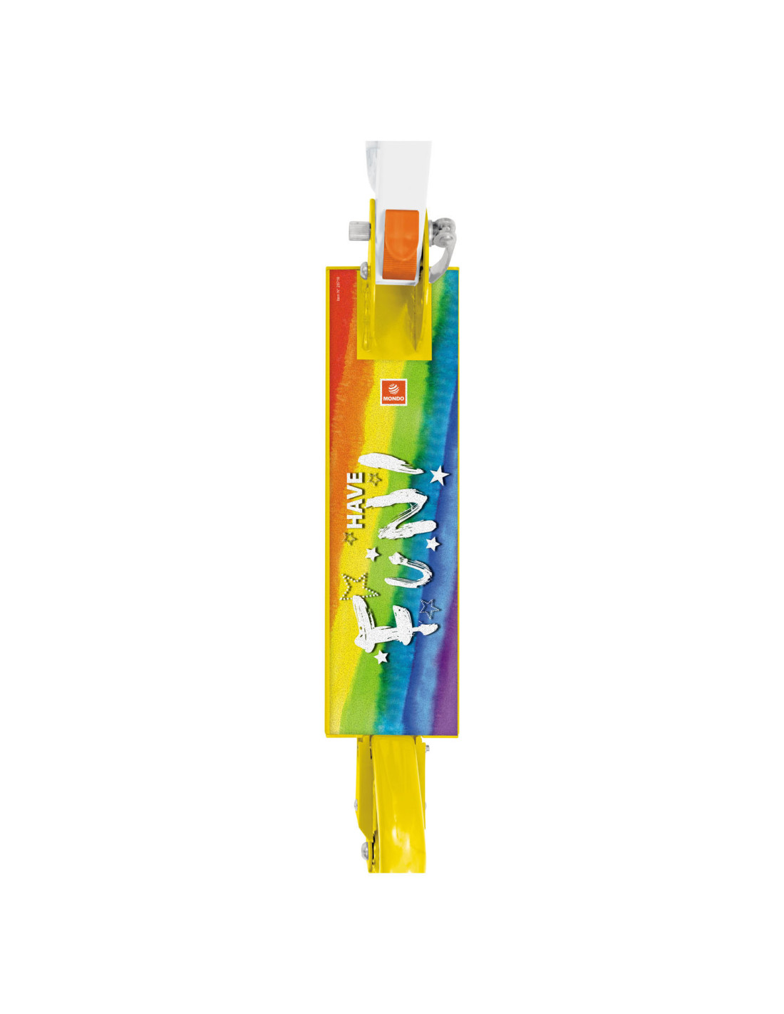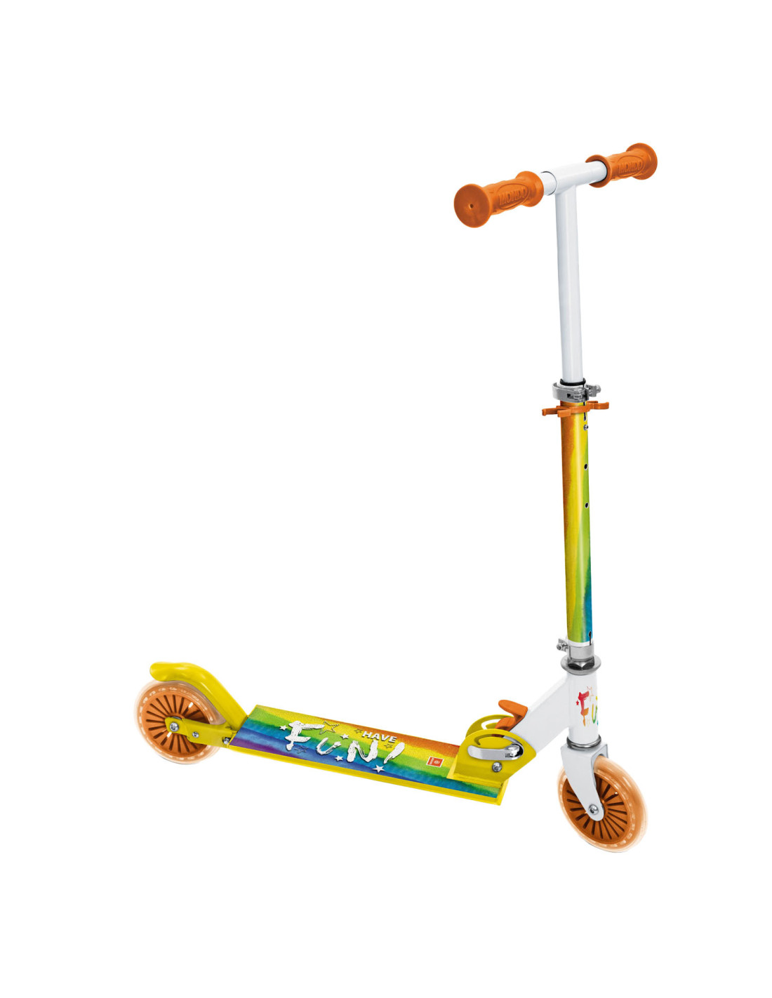 Kinderstep met wielen in regenboogdesign. De step heeft een rem, een in hoogte verstelbaar stuur en een eenvoudig vouwsysteem voor opbergen en vervoeren. Geschikt voor kinderen vanaf 5 jaar oud met een maximaal gewicht van 50 kg.