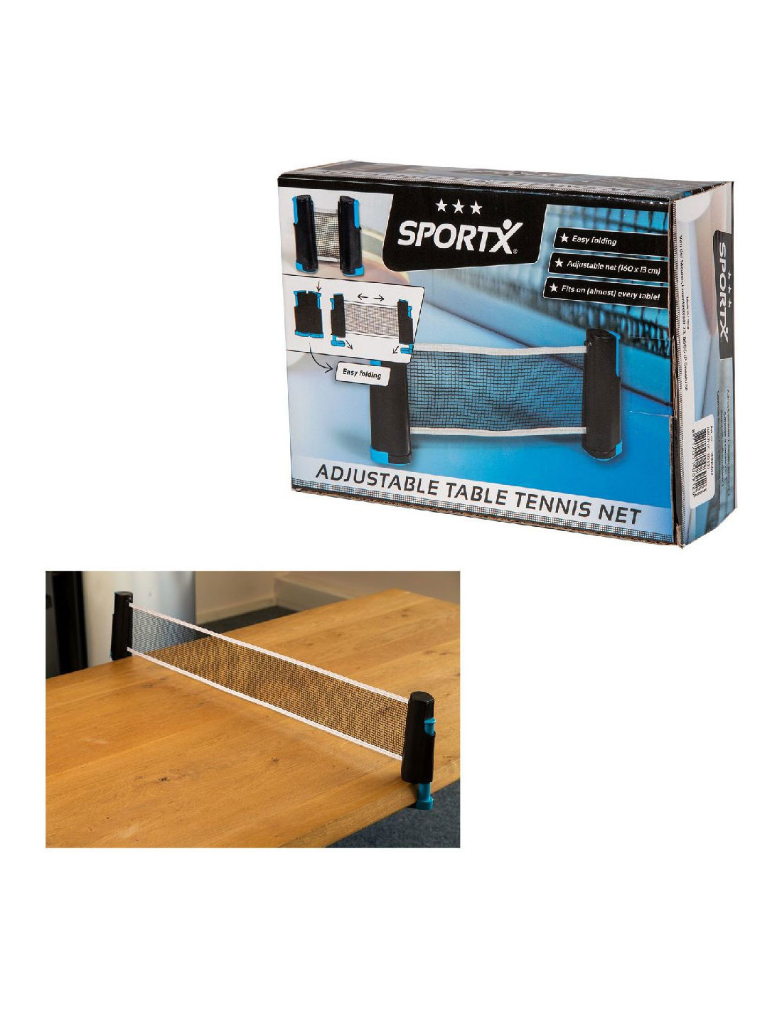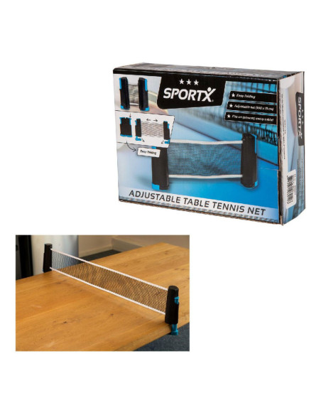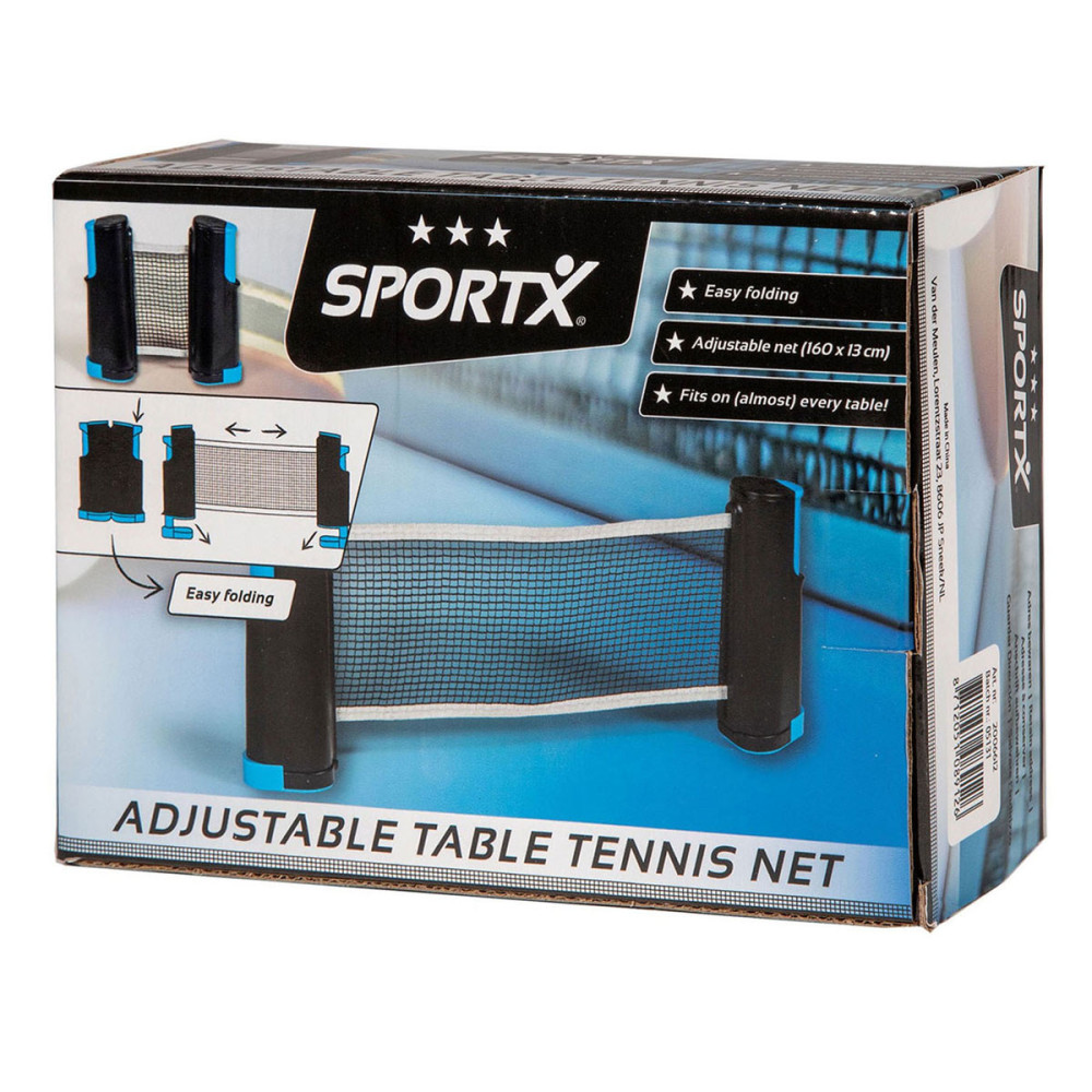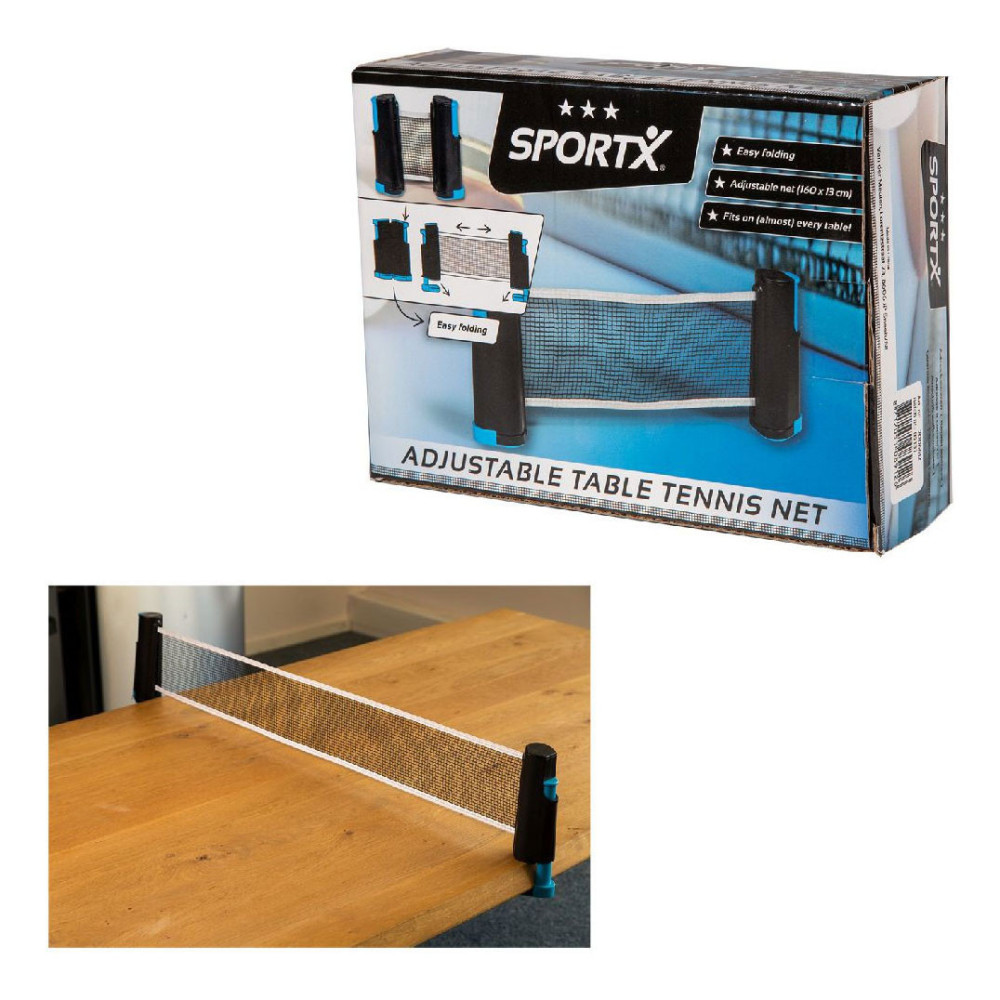 SportX tafeltennisnet, dat je gemakkelijk uit kunt schuiven en op een tafel kunt klemmen. Zo kun je overal een potje tafeltennis spelen! Nethoogte: 13 cm. Maximale breedte: 160 cm. Verpakt in full-colour doos.