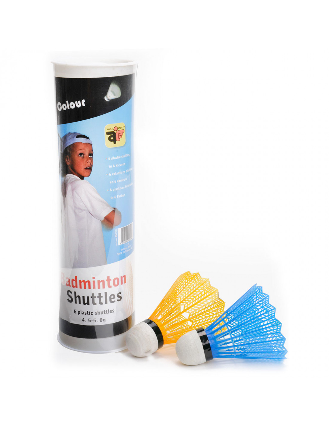Set van 6 kunststof neon shuttels in een koker. A-kwaliteit.