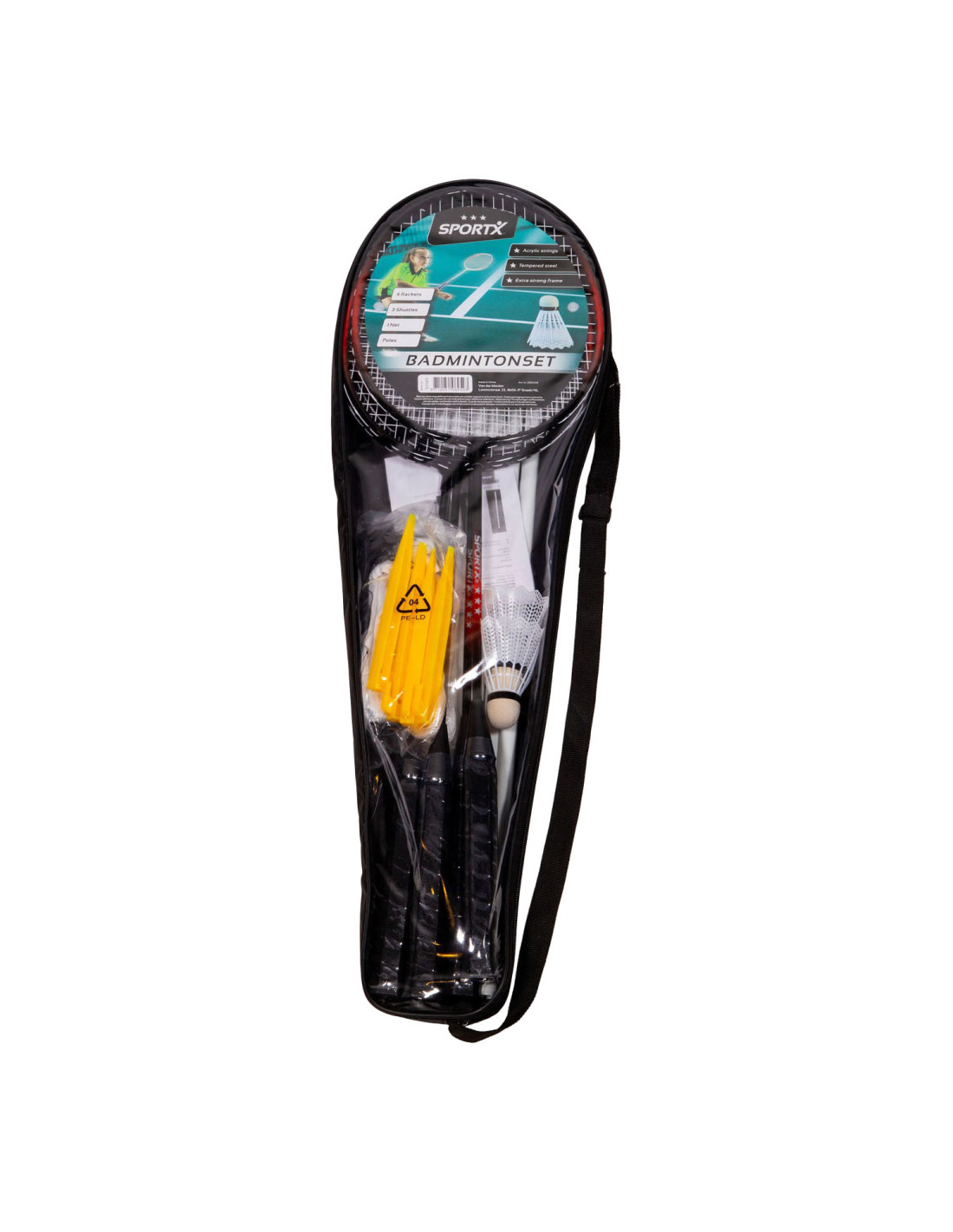 SportX badmintonset, inclusief 3 shuttles in een koker, 4 rackets, net (609 x 45 cm), 4 haringen en twee palen, bestaande uit 3 delen (totaal 155 cm hoog). De rackets zijn voorzien van snaren van acryl en een extra sterk frame van gehard staal. Wordt geleverd in tas, die de set bij elkaar houdt en opruimmogelijkheid biedt.