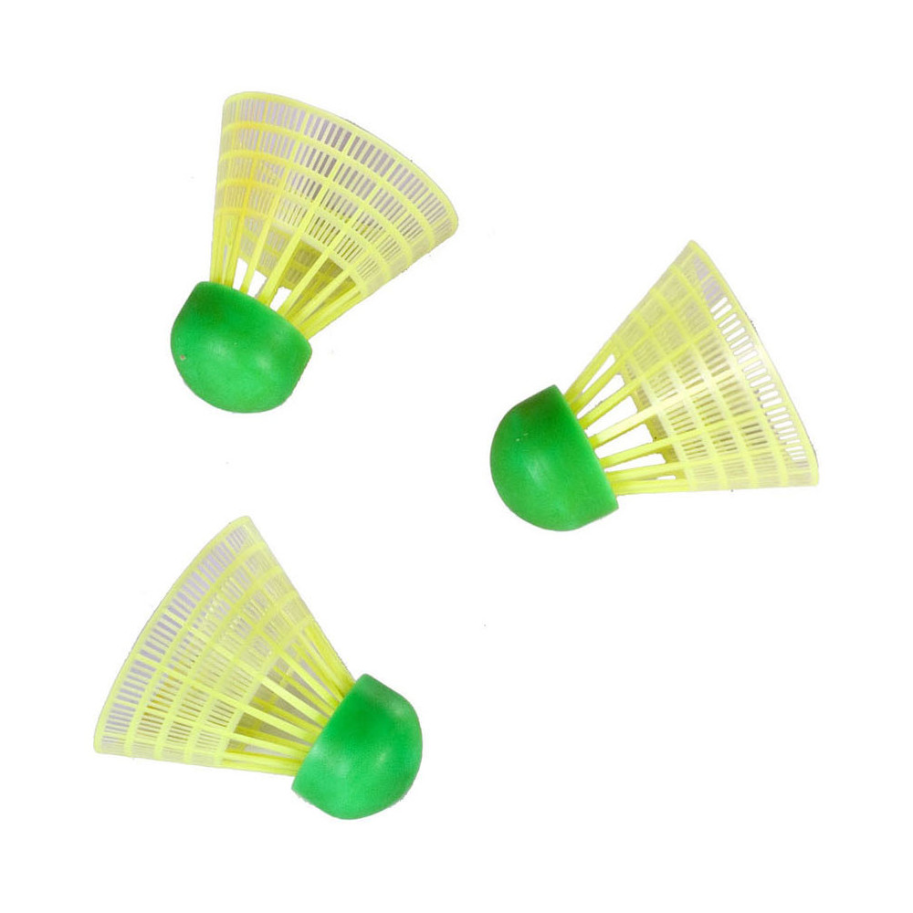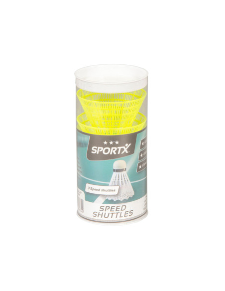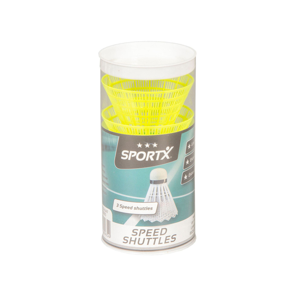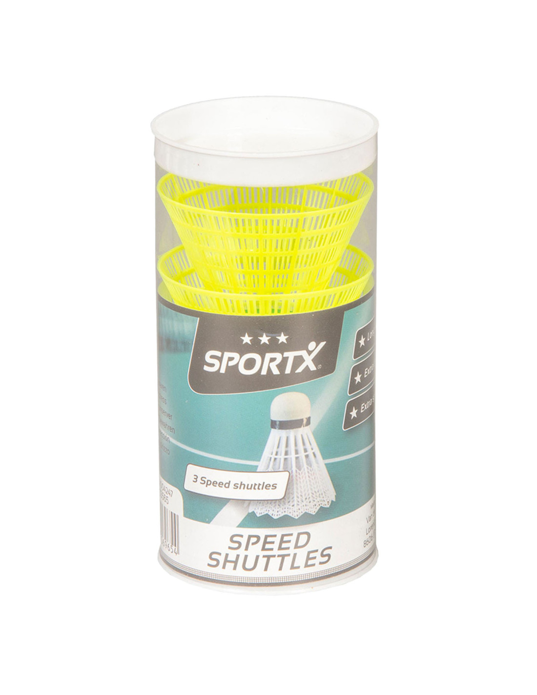 SportX speedbadminton shuttles in kleurencombinatie neon geel en groen. Deze shuttles gaan lang mee en je kunt ze met veel snelheid wegslaan! Drie stuks verpakt in koker.