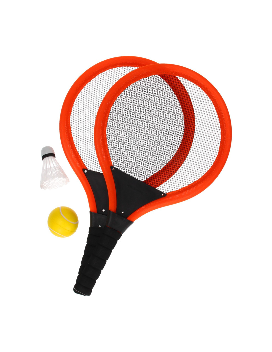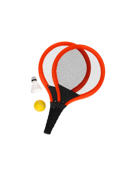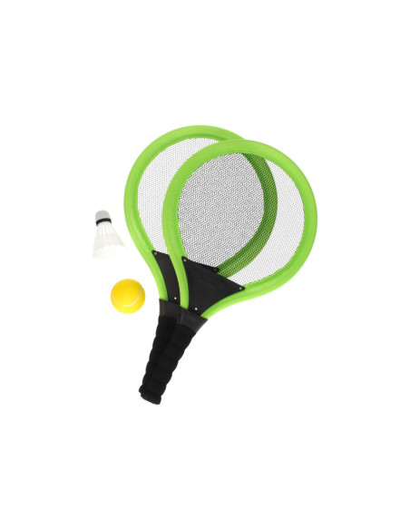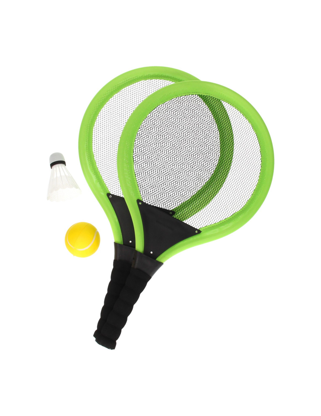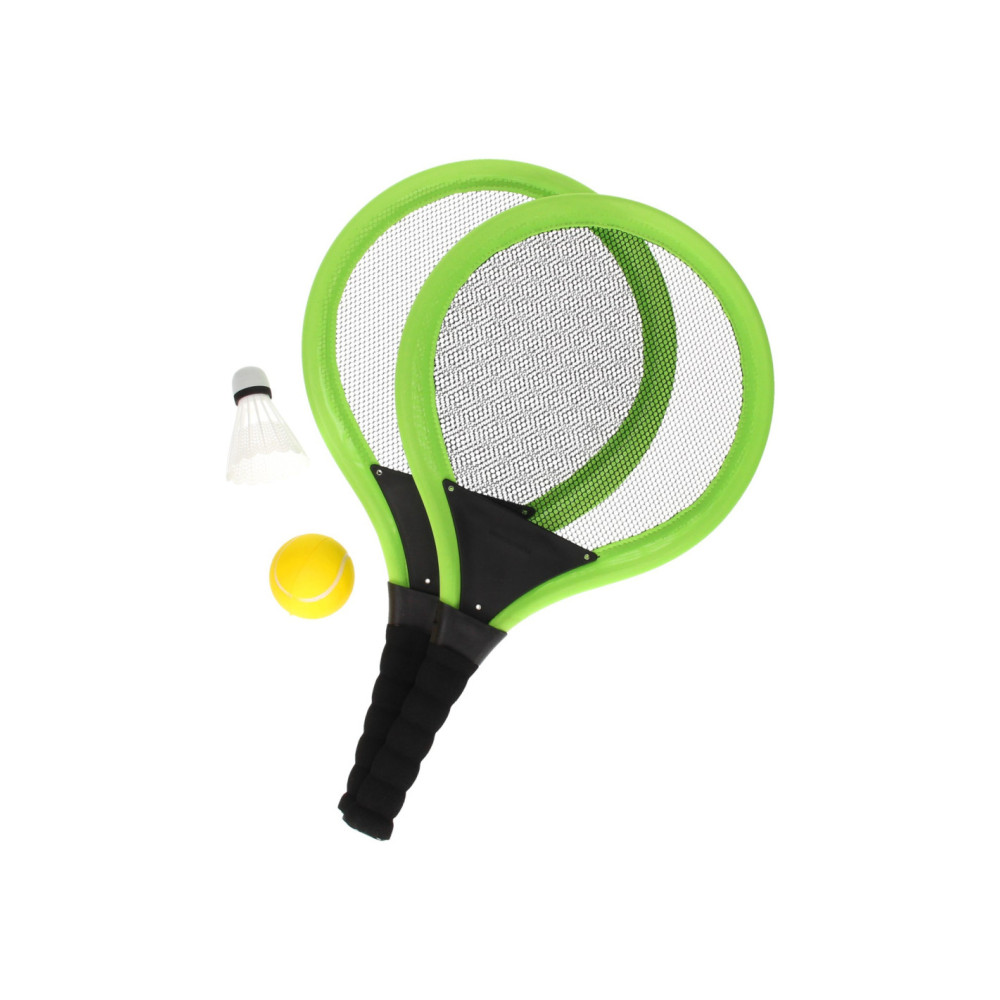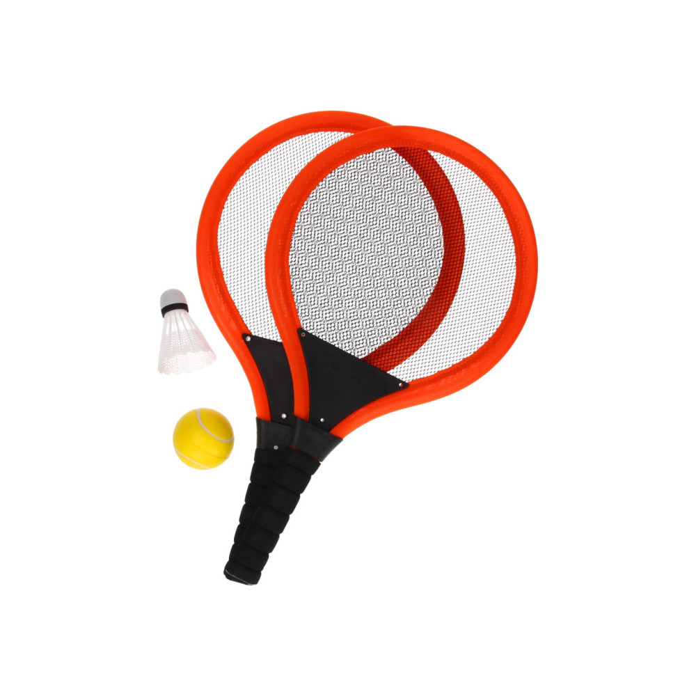 Kunststof tennis set bestaande uit 2 rackets, 1 shuttle en een zachte tennisbal. Leuk voor op de camping of op het strand!