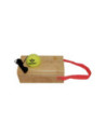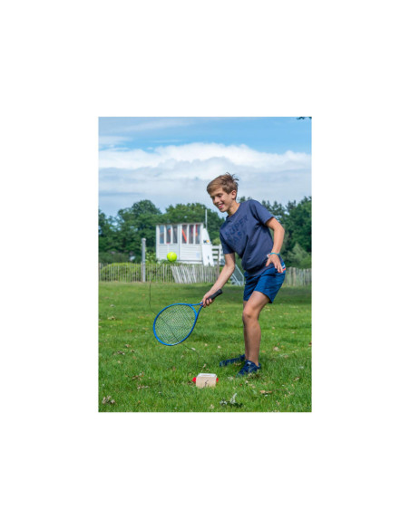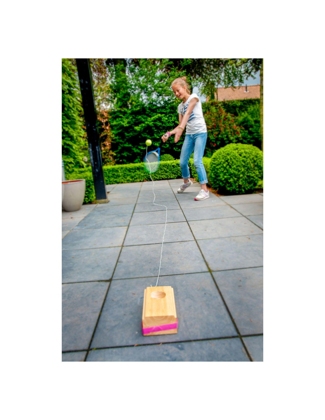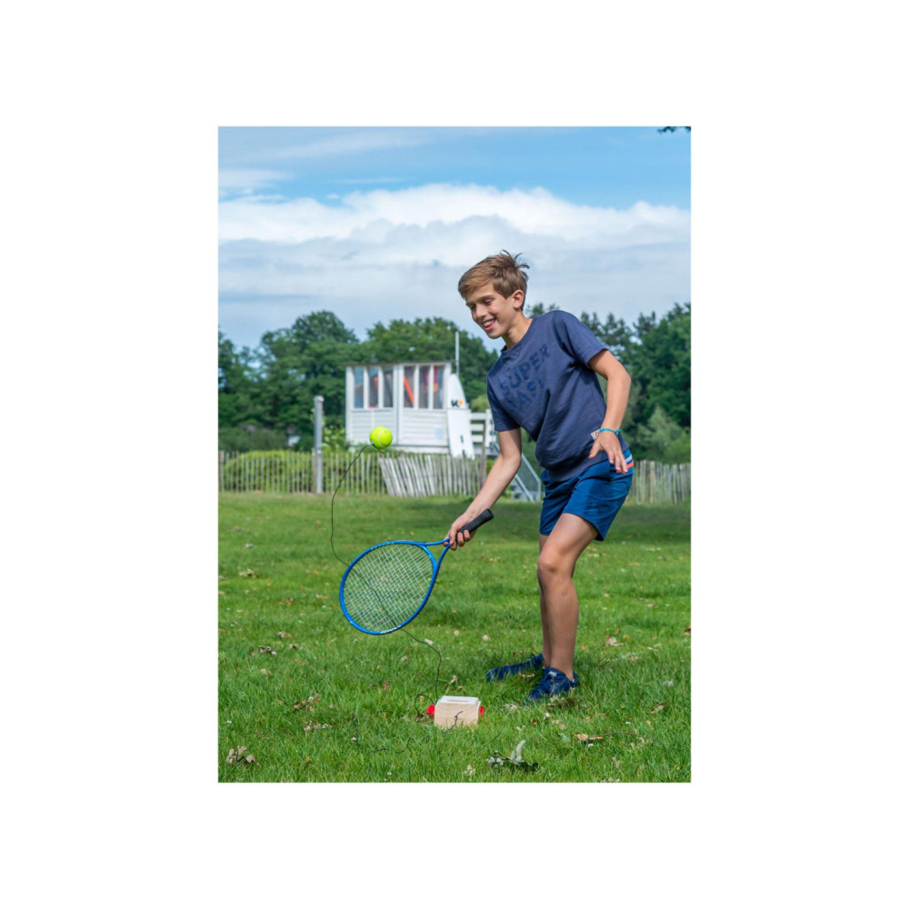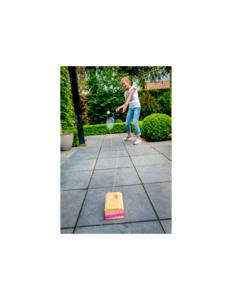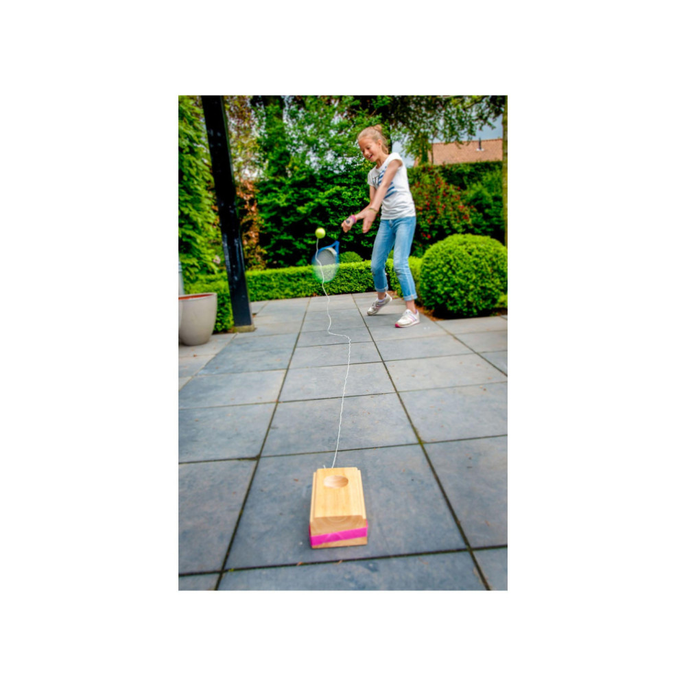Luxe tennistrainer. Rubberhouten blok van 1,2 kilo zwaar, 21 bij 12 bij 8 cm groot. Met een tennisbal aan een elastiek eraan. Exclusief tennisracket.