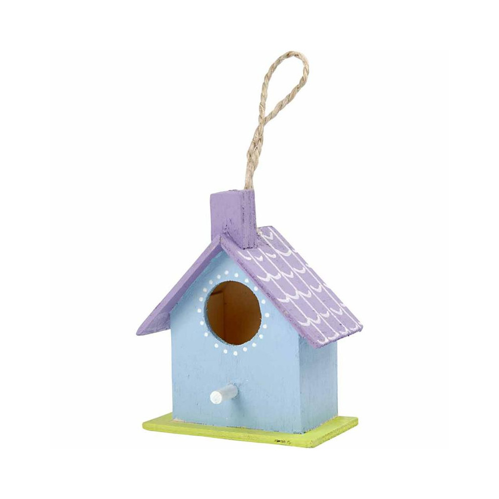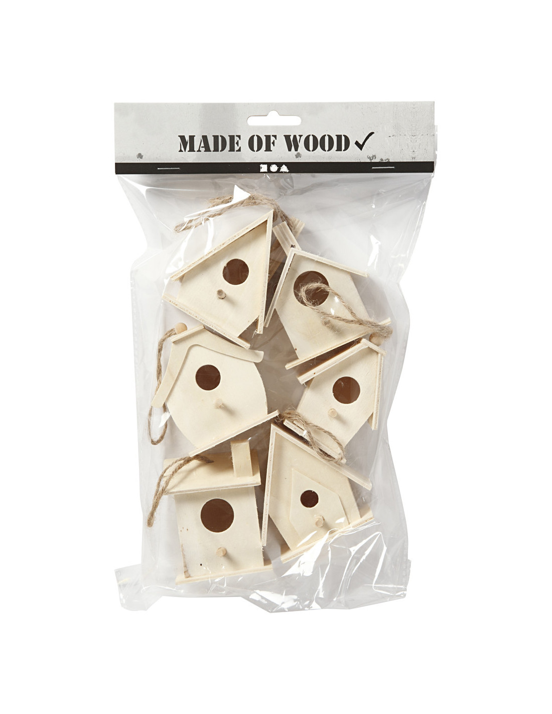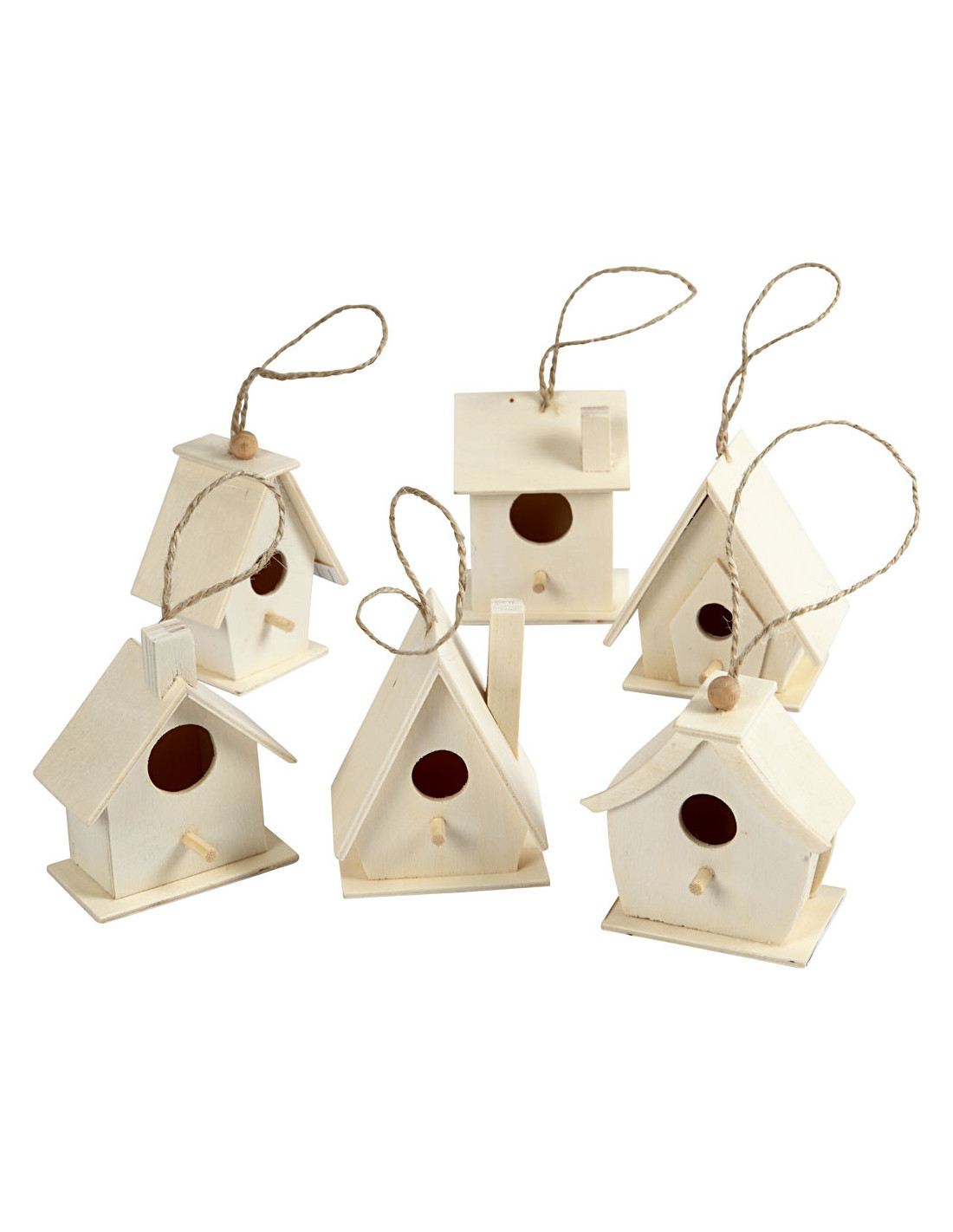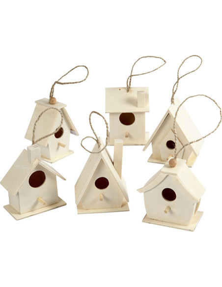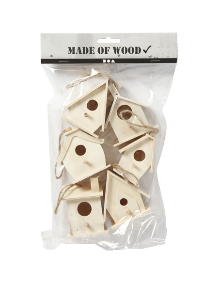 Houten vogelhuishanger, hoogte 7 cm, 6 verschillende huisjes per set.
