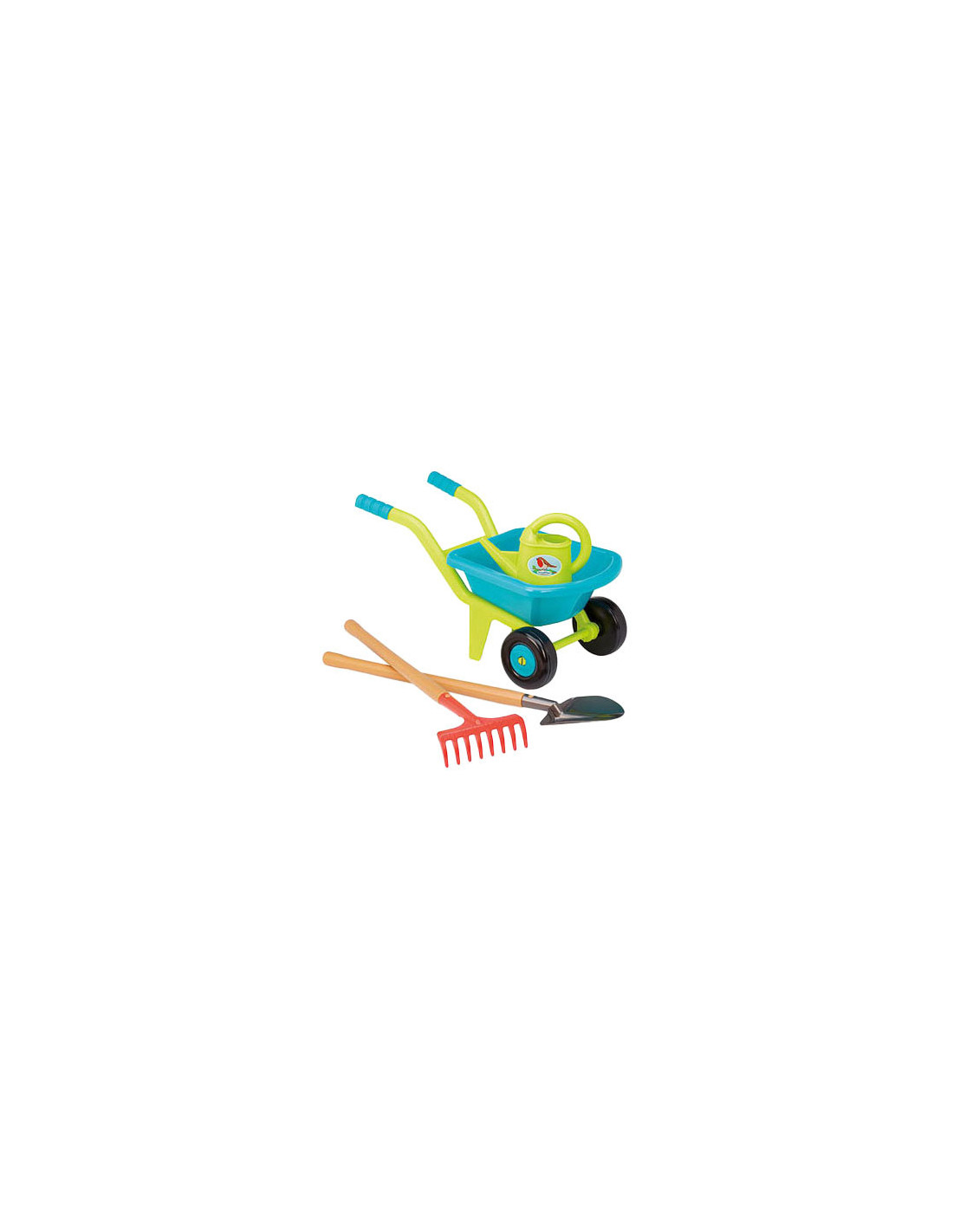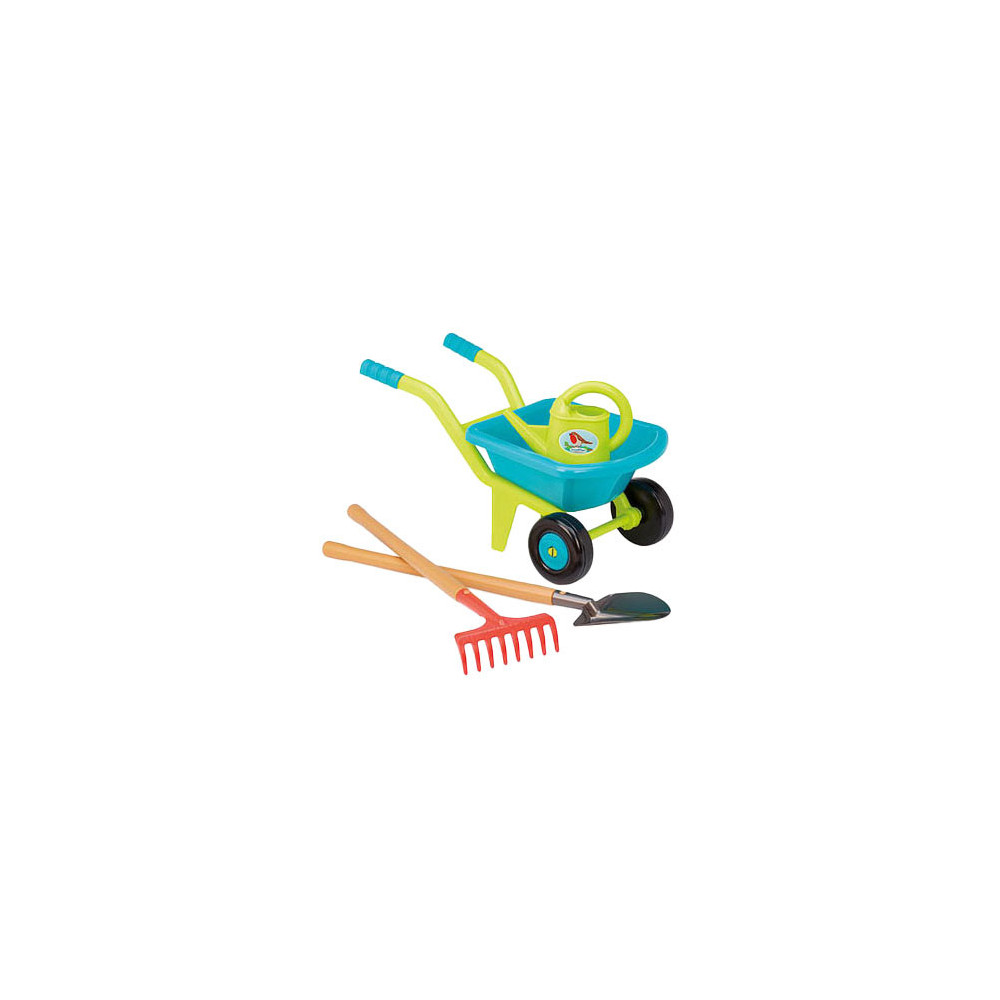 Ecoiffier tuinset voor kinderen, met een kruiwagen, gieter en twee stukken tuingereedschap van 70 centimeter lang. Geschikt voor kinderen vanaf 18 maanden oud.