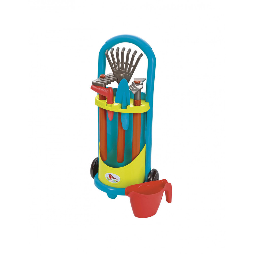 Met deze tuinierskar in vrolijke kleuren ben je helemaal klaar om aan de slag te gaan in de tuin! Dankzij de wieltjes en het handige handvat neem je de kar overal mee naartoe. In de kar zit een hark, een schoffel, een bladhark, een schepje, een spuit en een gieter. Het gereedschap is gemaakt van kunststof. Laat het mooie weer maar komen!
