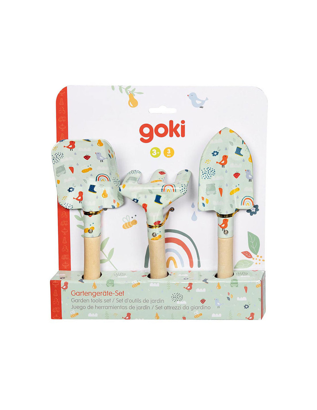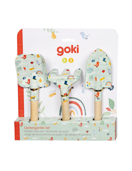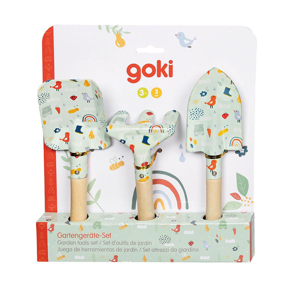 Driedelige tuinset voor kinderen, in schattig design: iedereen met twee scheppen en een hark kan in de lente en zomer ijverig meehelpen op het balkon of in de tuin. Met houten handvat en geen scherpe randen.