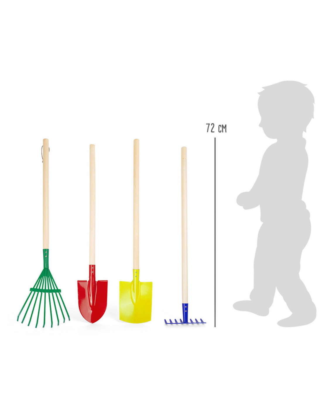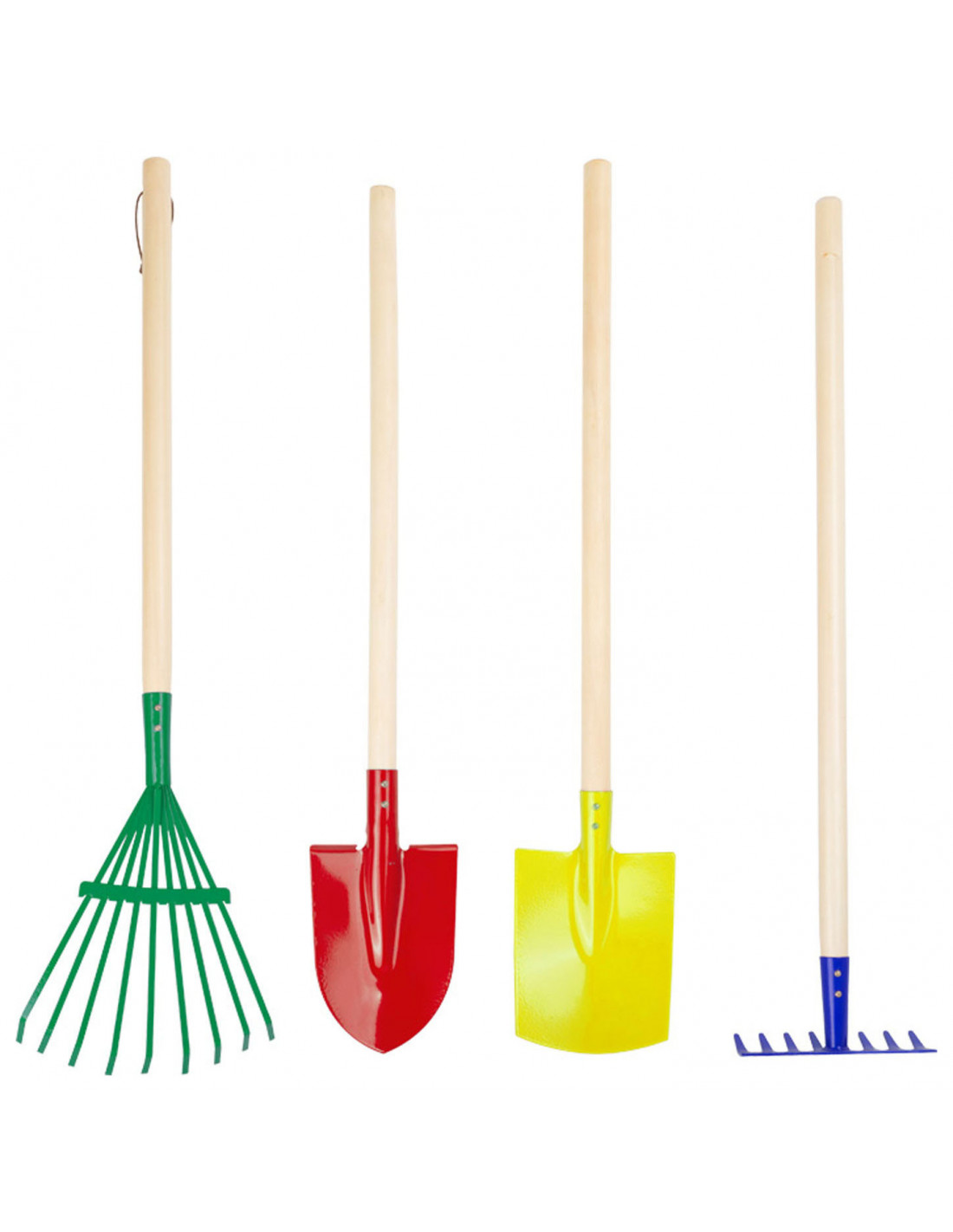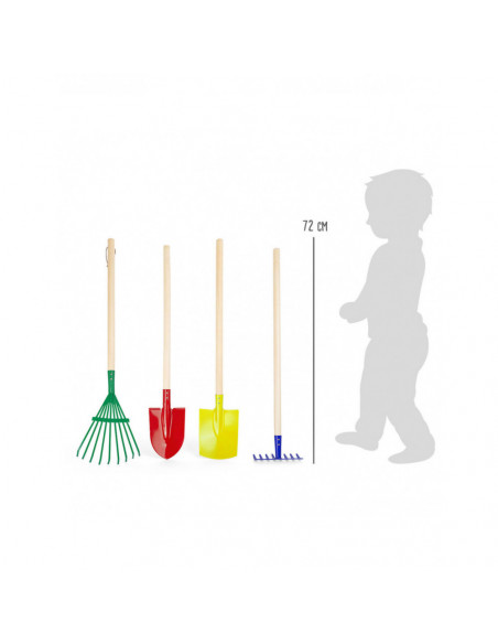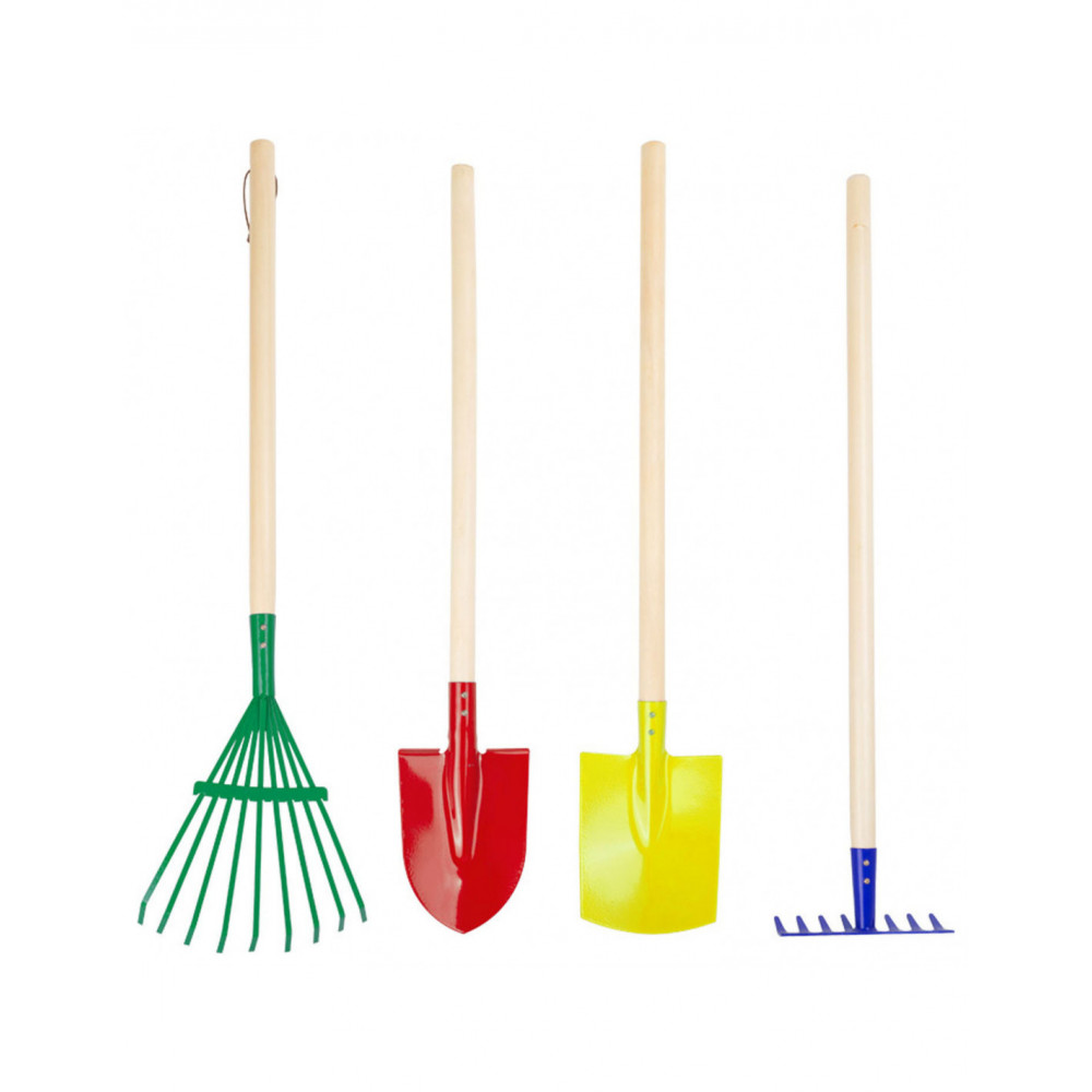 Tuingereedschapset met een groene bladhark, een rode en gele schep en een blauwe tuinhark, 72 cm lang.