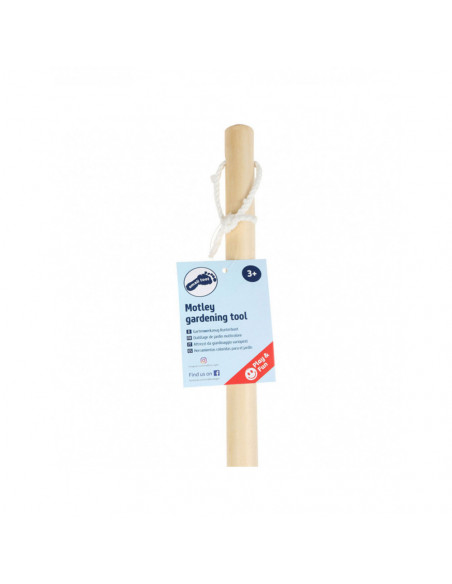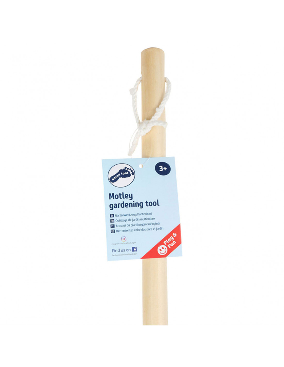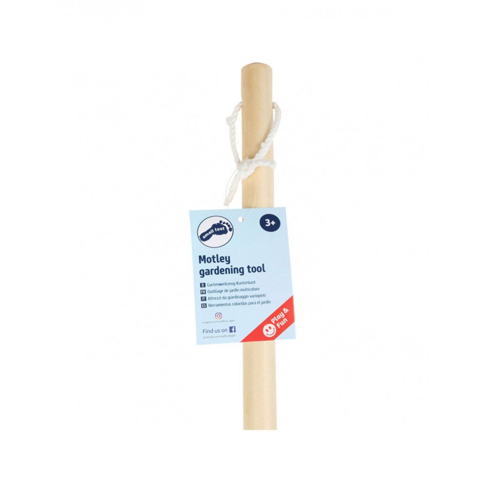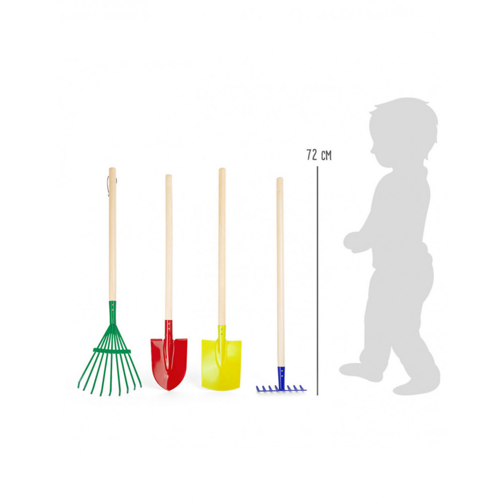 Tuingereedschapset met een groene bladhark, een rode en gele schep en een blauwe tuinhark, 72 cm lang.