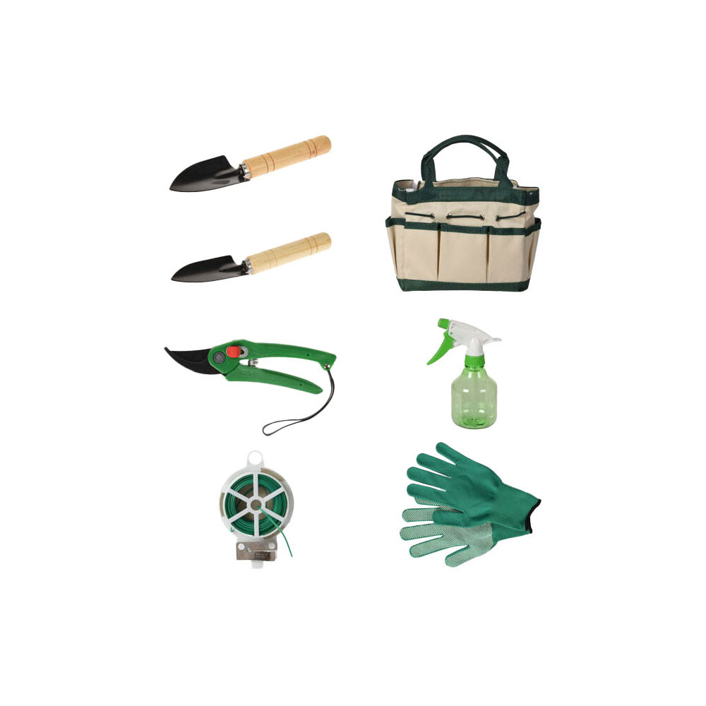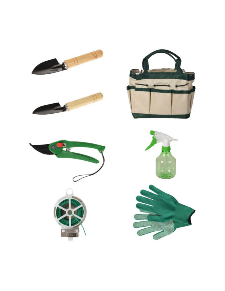 Tuingereedschapset met 8 stuks in een handige opbergtas. Inhoud: 2 schepjes, snoeischaar, tuinhandschoenen, waterspuit, bloembinddraad en opbergtas.