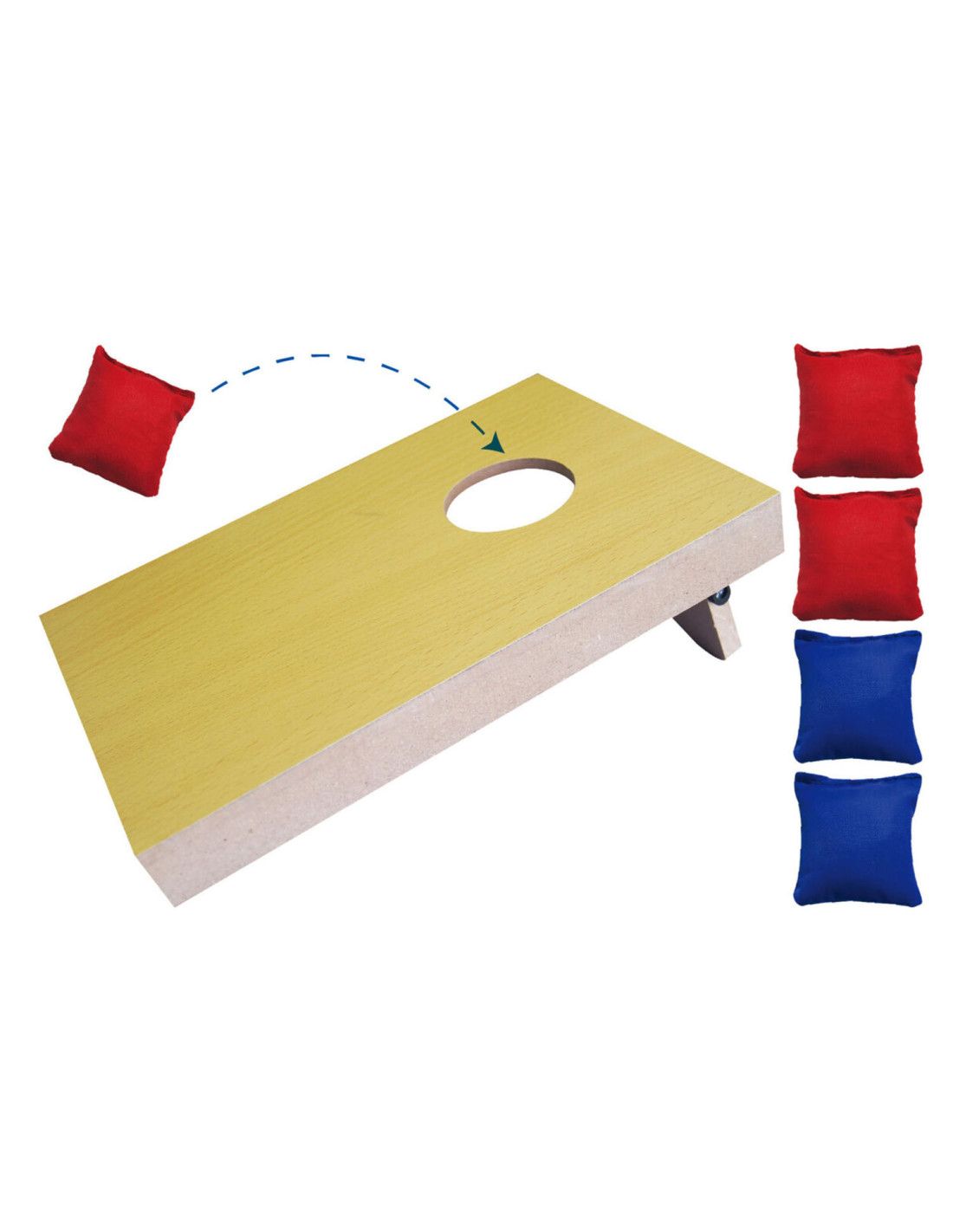 Een klassiek pittenzak familiespel voor iedereen. Gooi je in één keer door het gat? Dat betekent 3 punten. Op de plank is 1 punt, naast de plank is nul punten. De speler die als eerste 21 punten scoort, wint het potje. Inhoud: 1 spelbord en vier pittenzakken.