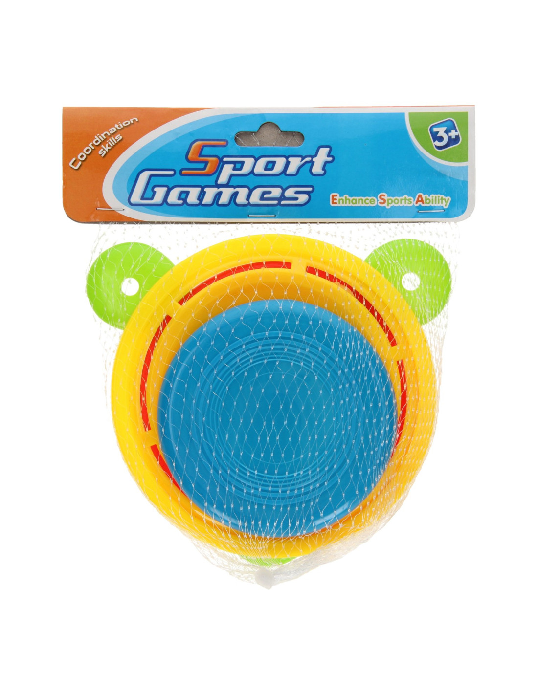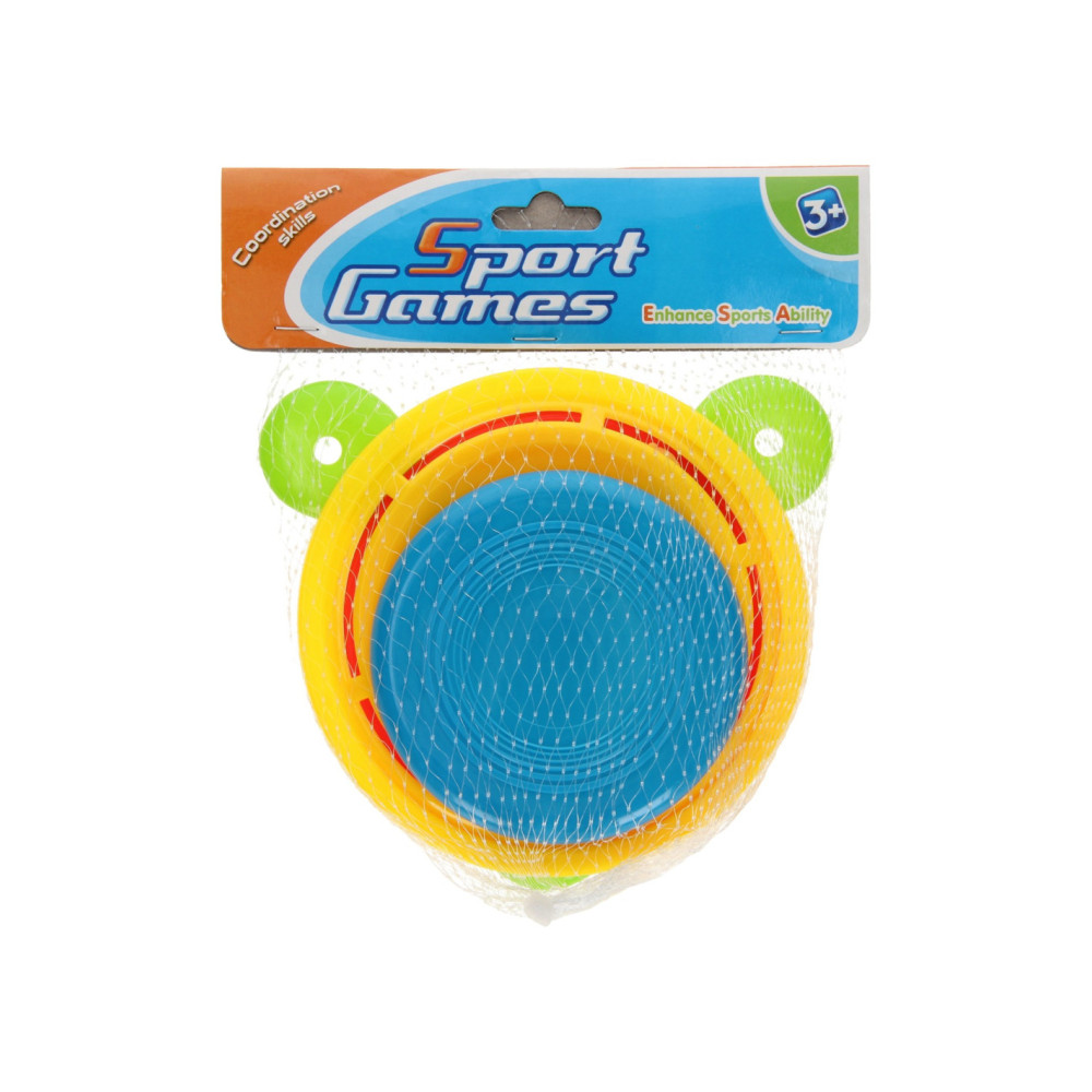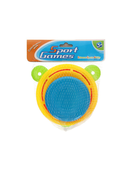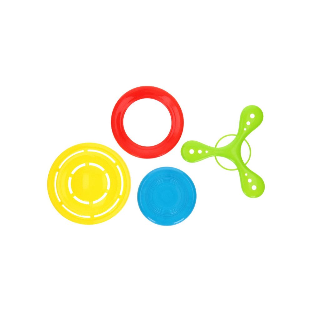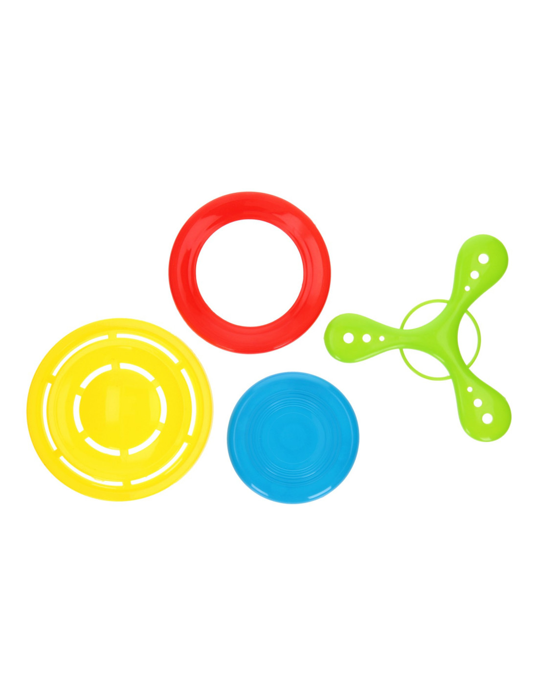 Welke van de 4 zweeft het verst door de lucht: de blauwe, gele, rode of groene frisbee van de Frisbee-set? De 4 kunststoffen frisbees hebben allemaal een unieke kleur. Ze hebben een diameter van 10 tot 14 centimeter.