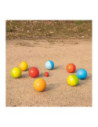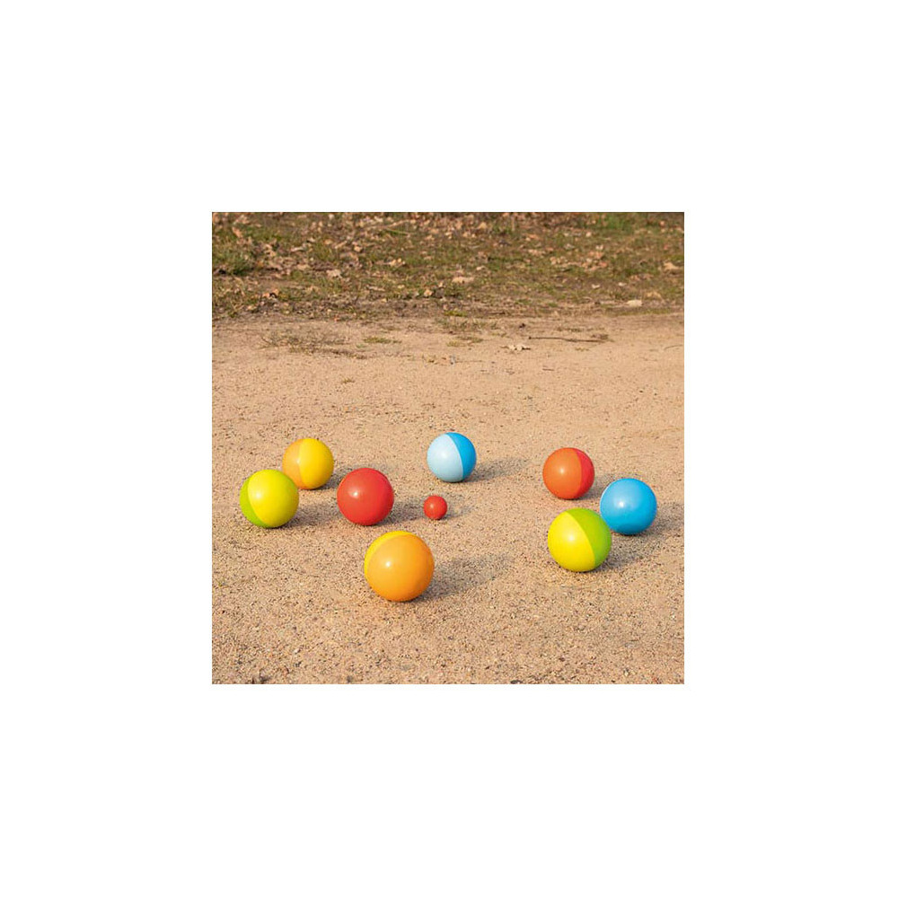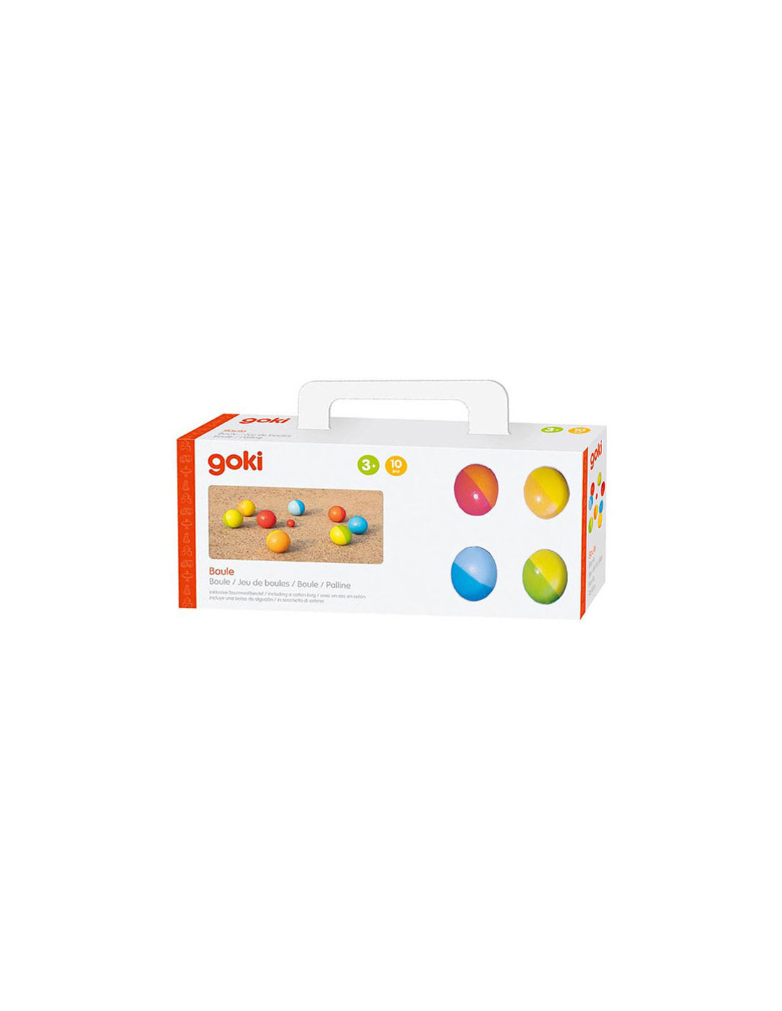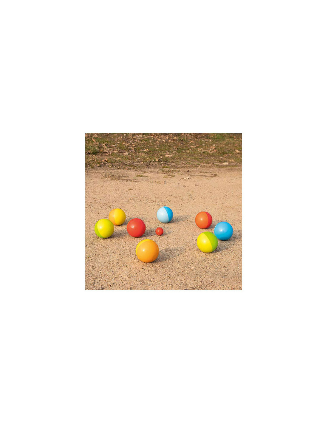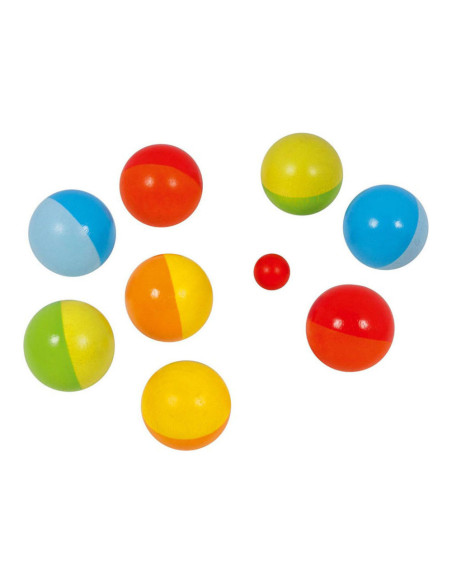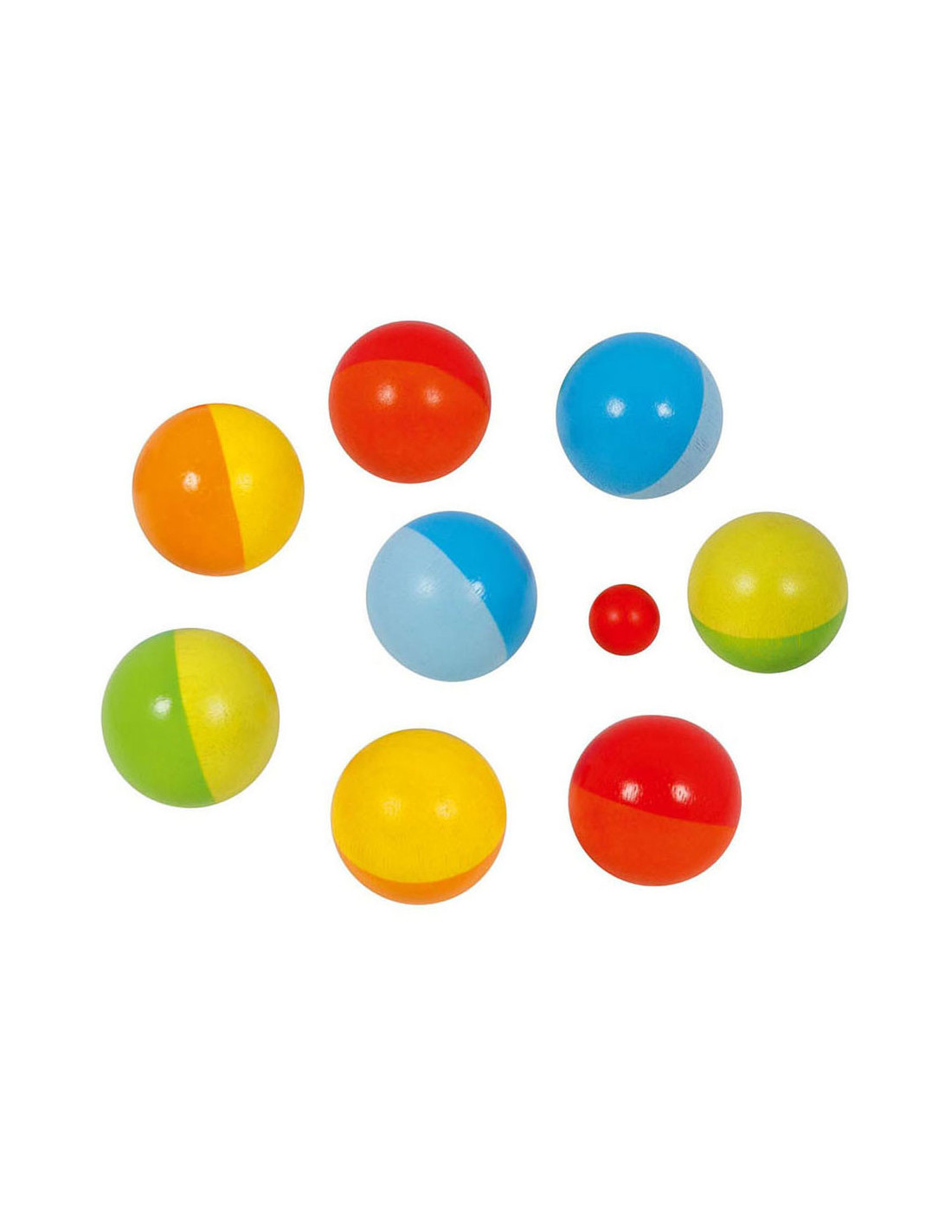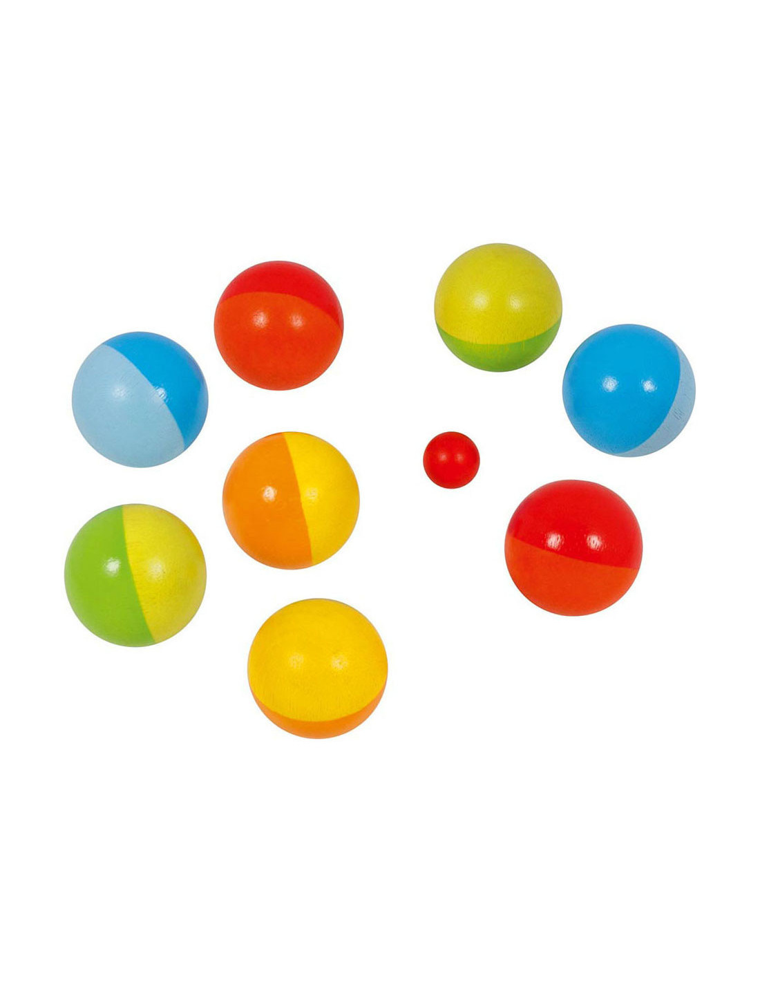 Kleurrijk houten jeu de boules spel in een katoenen zakje. Kenmerken • Aanbevolen leeftijd: 3+ • Materiaal: hout • Aantal onderdelen: 9
