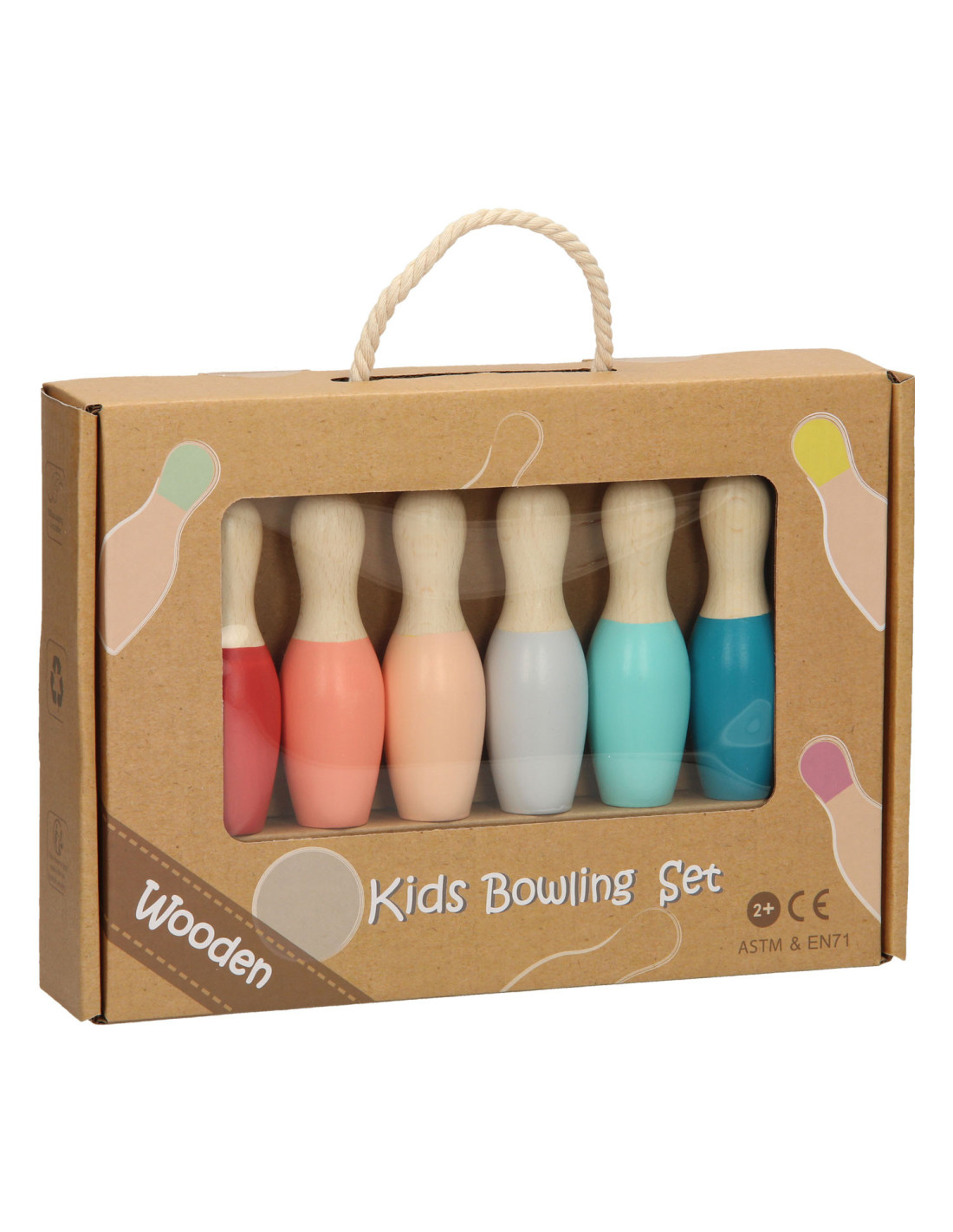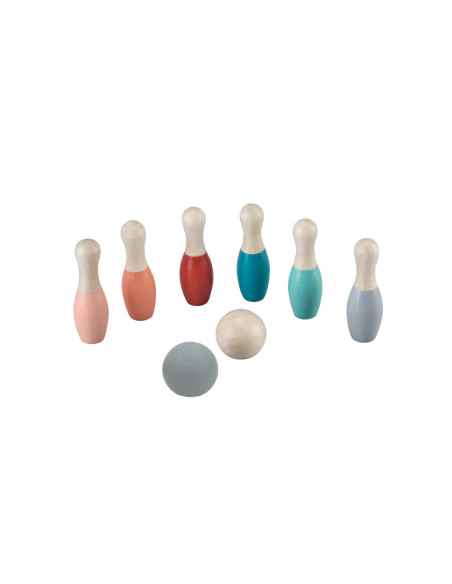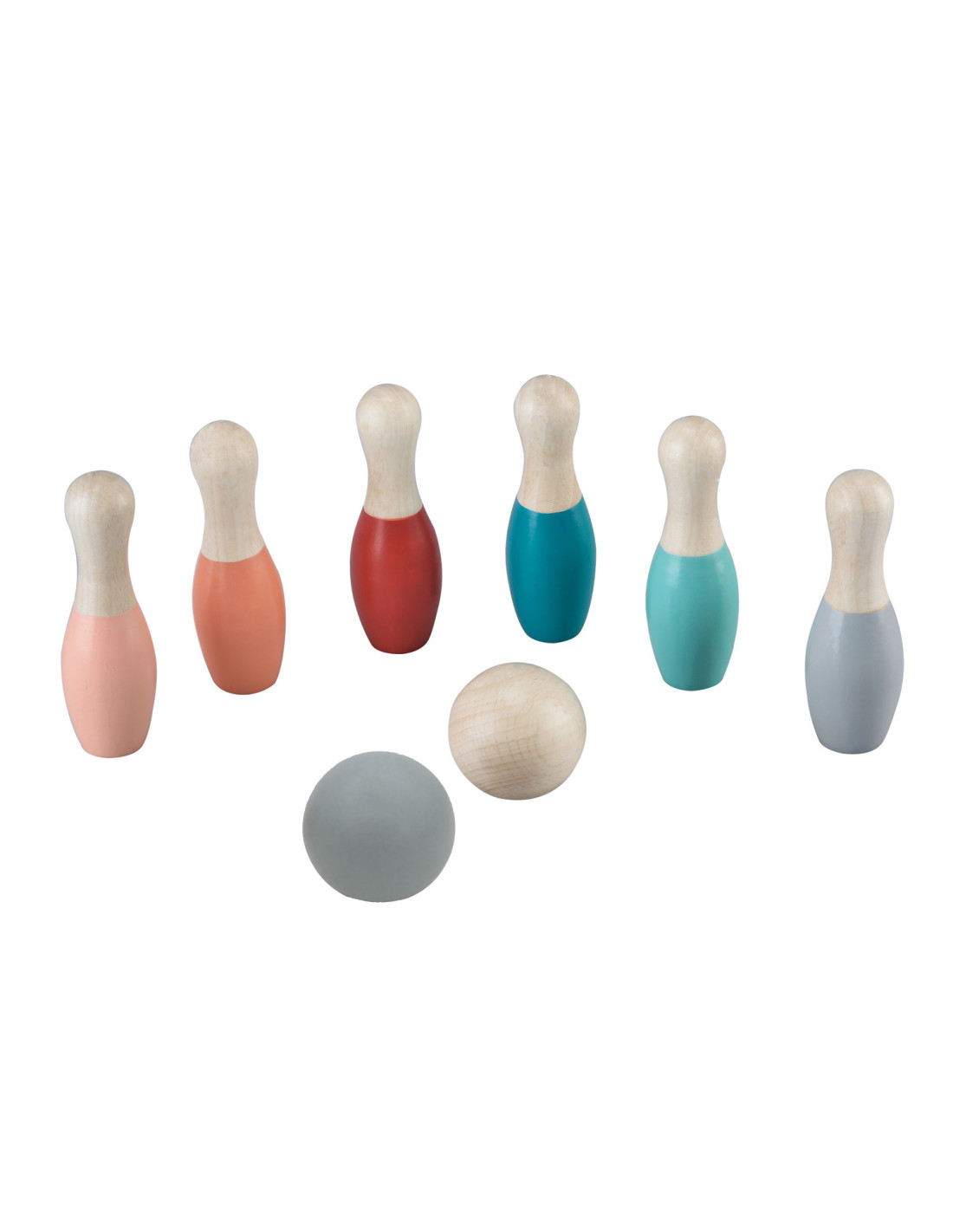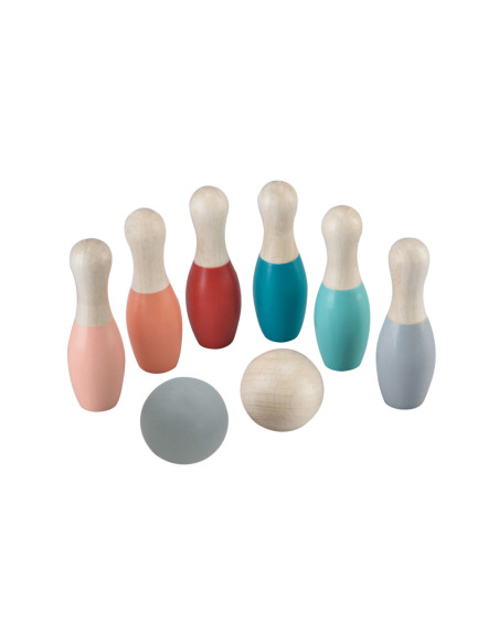 Bowlingset van hout. Rol de kegels om met de houten ballen. De kegels zijn aan de onderkant gedoopt in pastelkleuren verf.