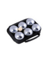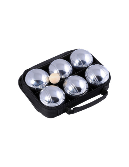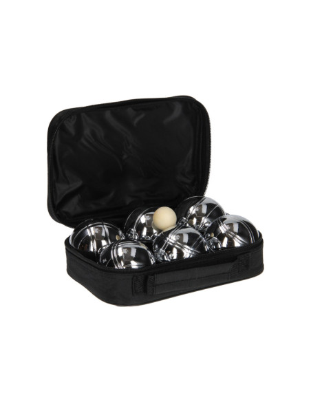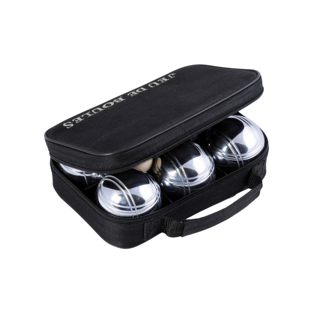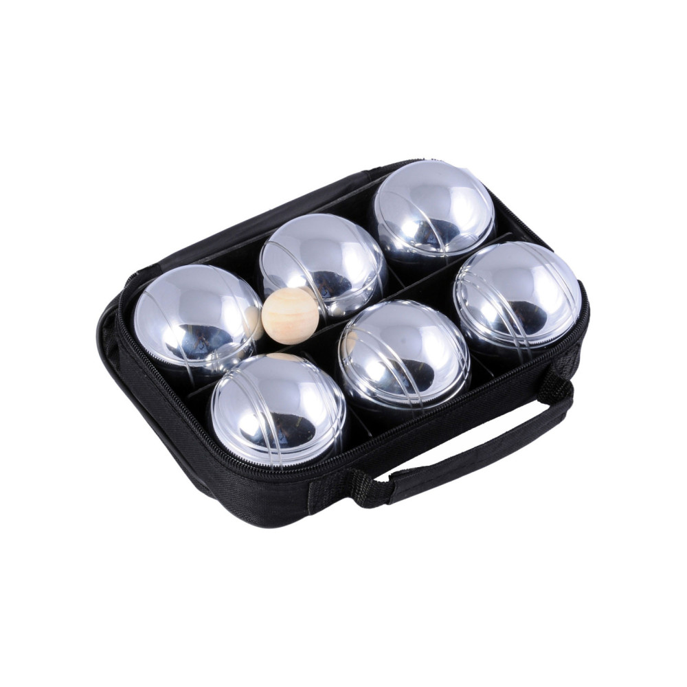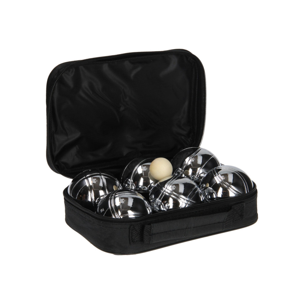 Stevige draagtas met daarin 6 chromen ballen en een houten balletje. Gooi het kleine houten balletje, de buut, zes tot tien meter van het beginpunt vandaan. Probeer daarna de stalen ballen zo dicht mogelijk bij dat balletje te gooien.