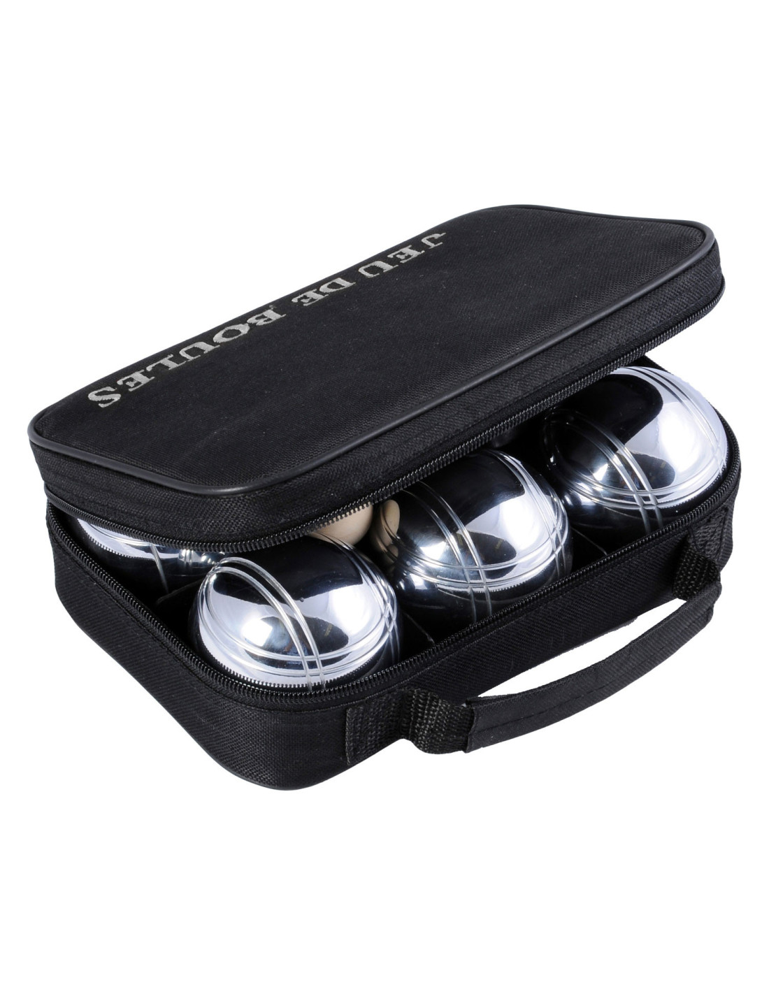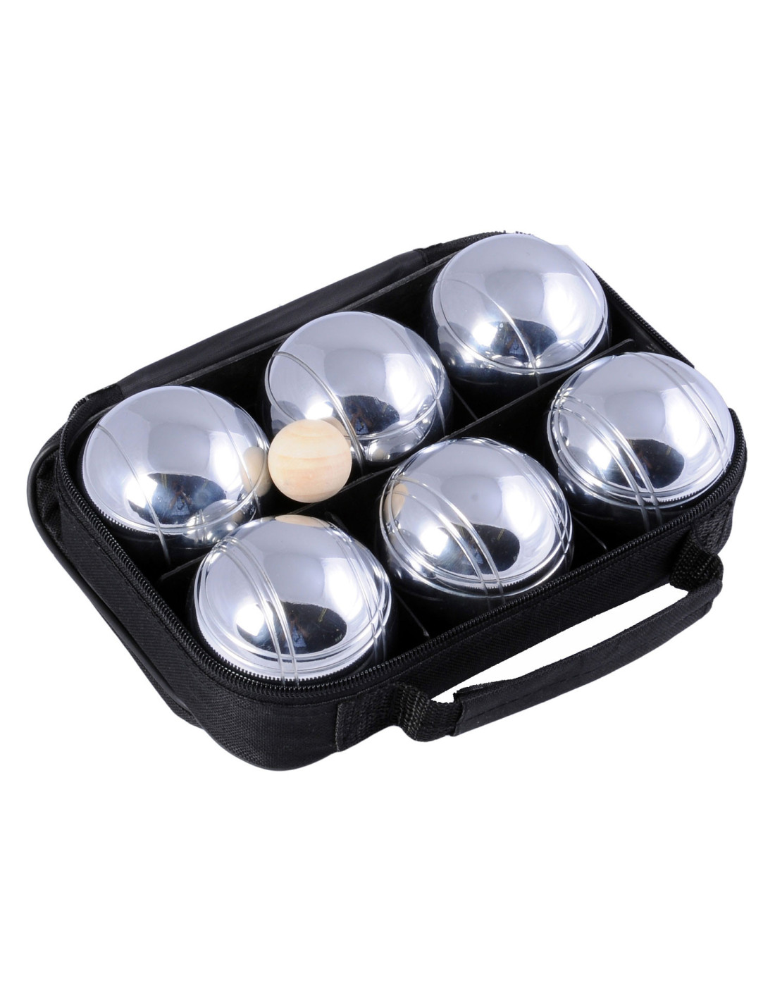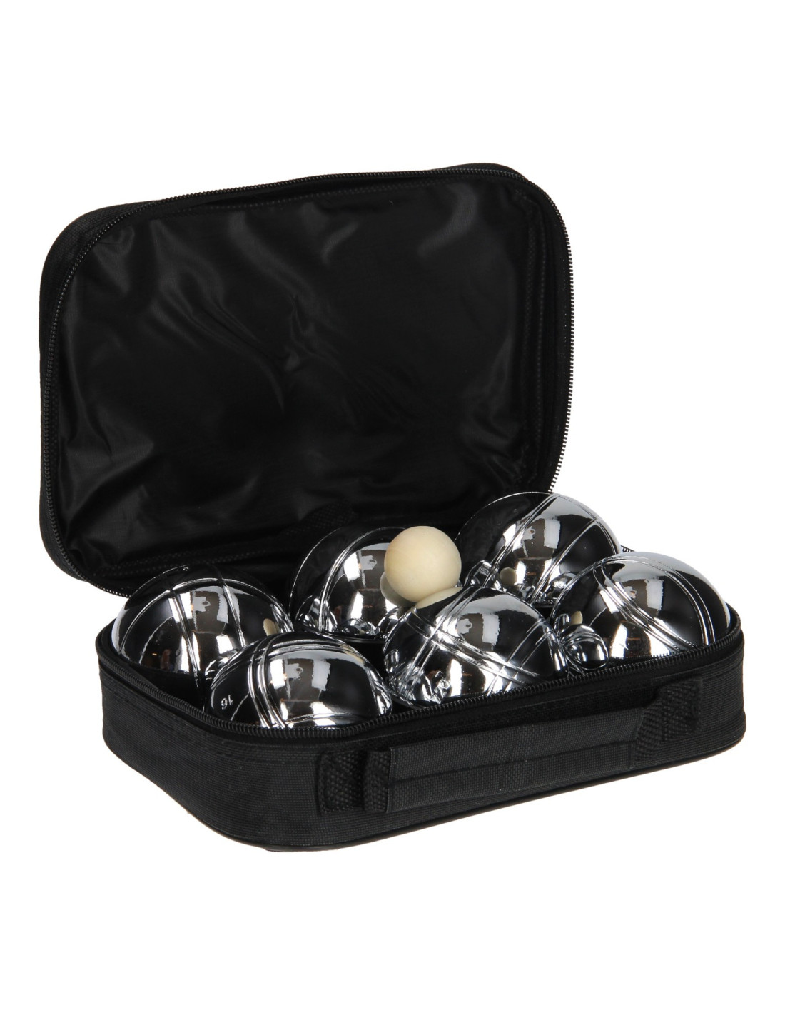Stevige draagtas met daarin 6 chromen ballen en een houten balletje. Gooi het kleine houten balletje, de buut, zes tot tien meter van het beginpunt vandaan. Probeer daarna de stalen ballen zo dicht mogelijk bij dat balletje te gooien.