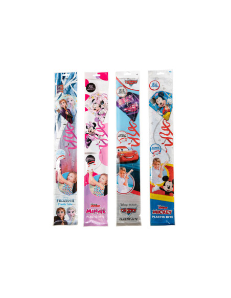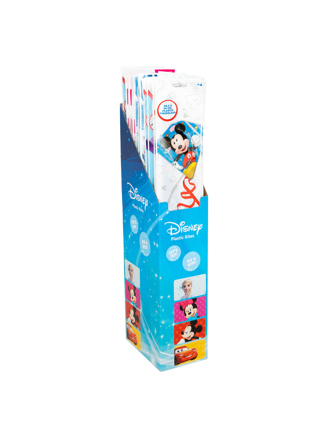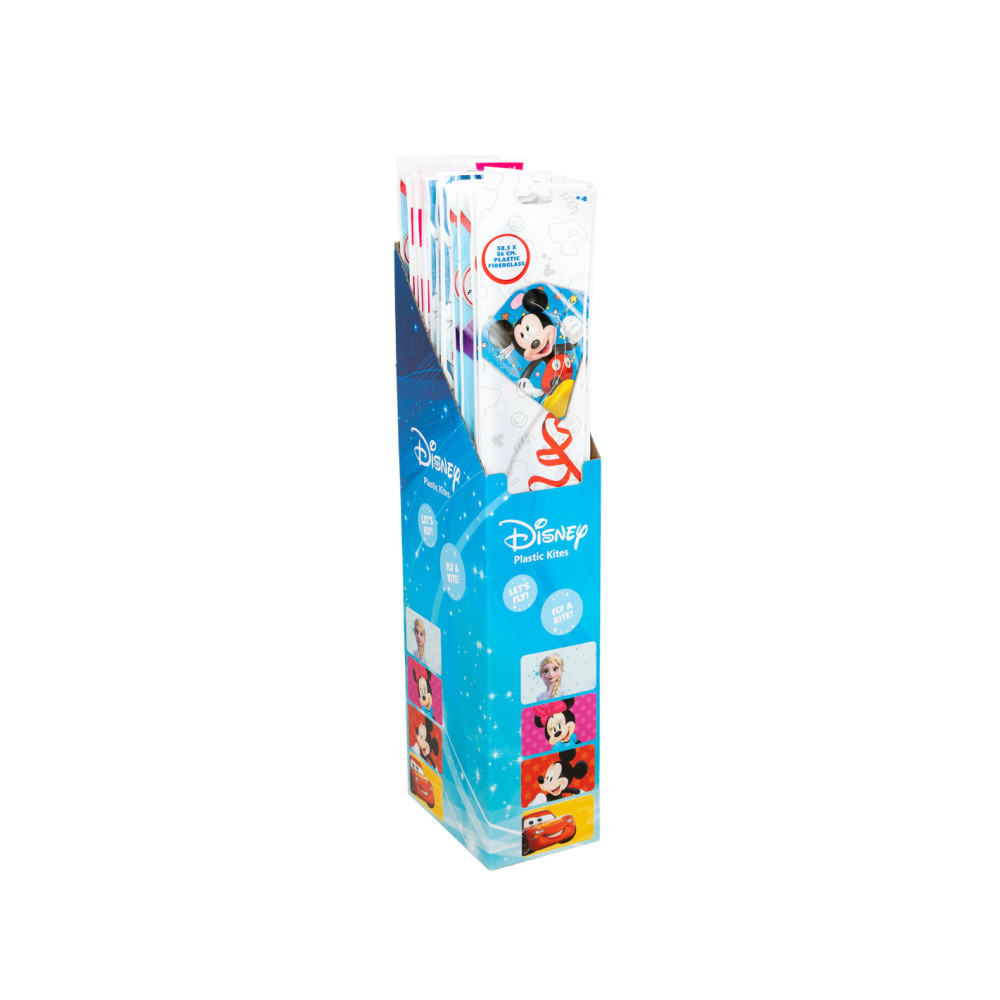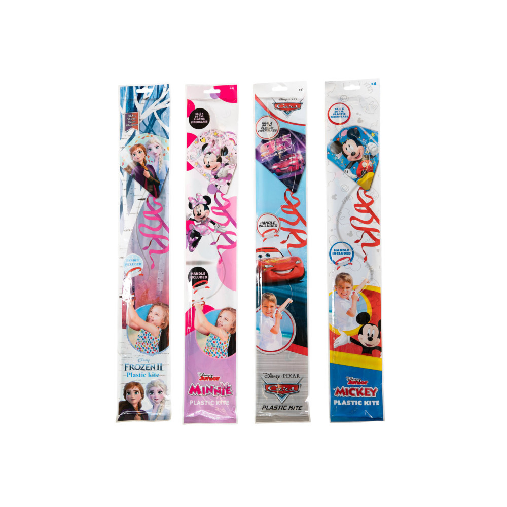 Verpakking met 24 plastic Eolo kindervliegers met afbeeldingen van diverse Disney-karakters. De vliegers hebben een stevig glasvezelframe dat snel en makkelijk te bevestigen is. Inclusief handvat, lijn en staart. Afmetingen: 56 x 58,5 centimeter. Adviesleeftijd: 4+