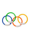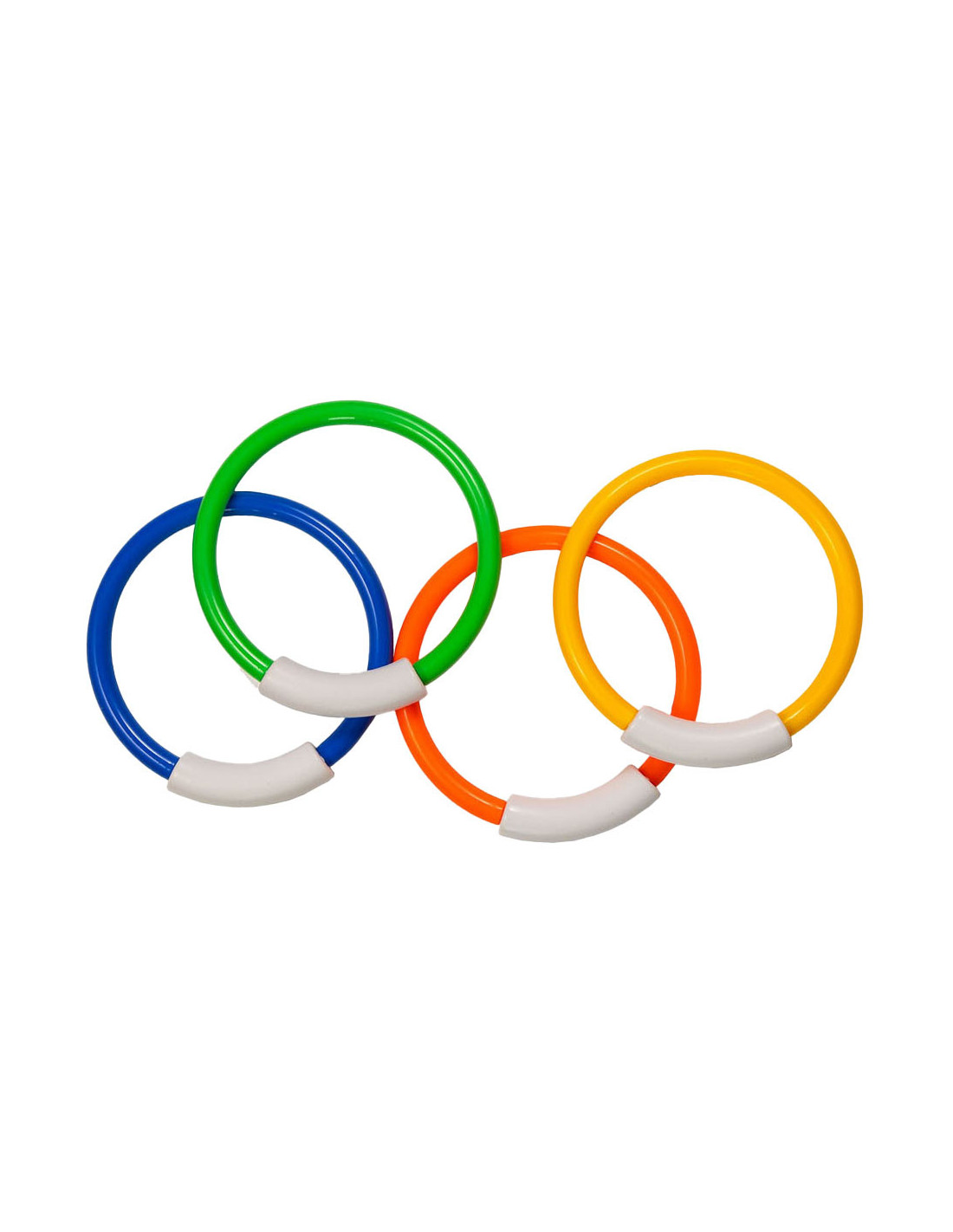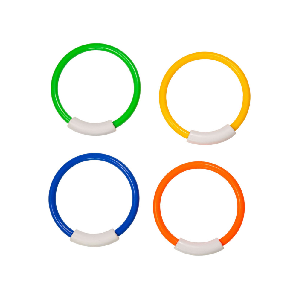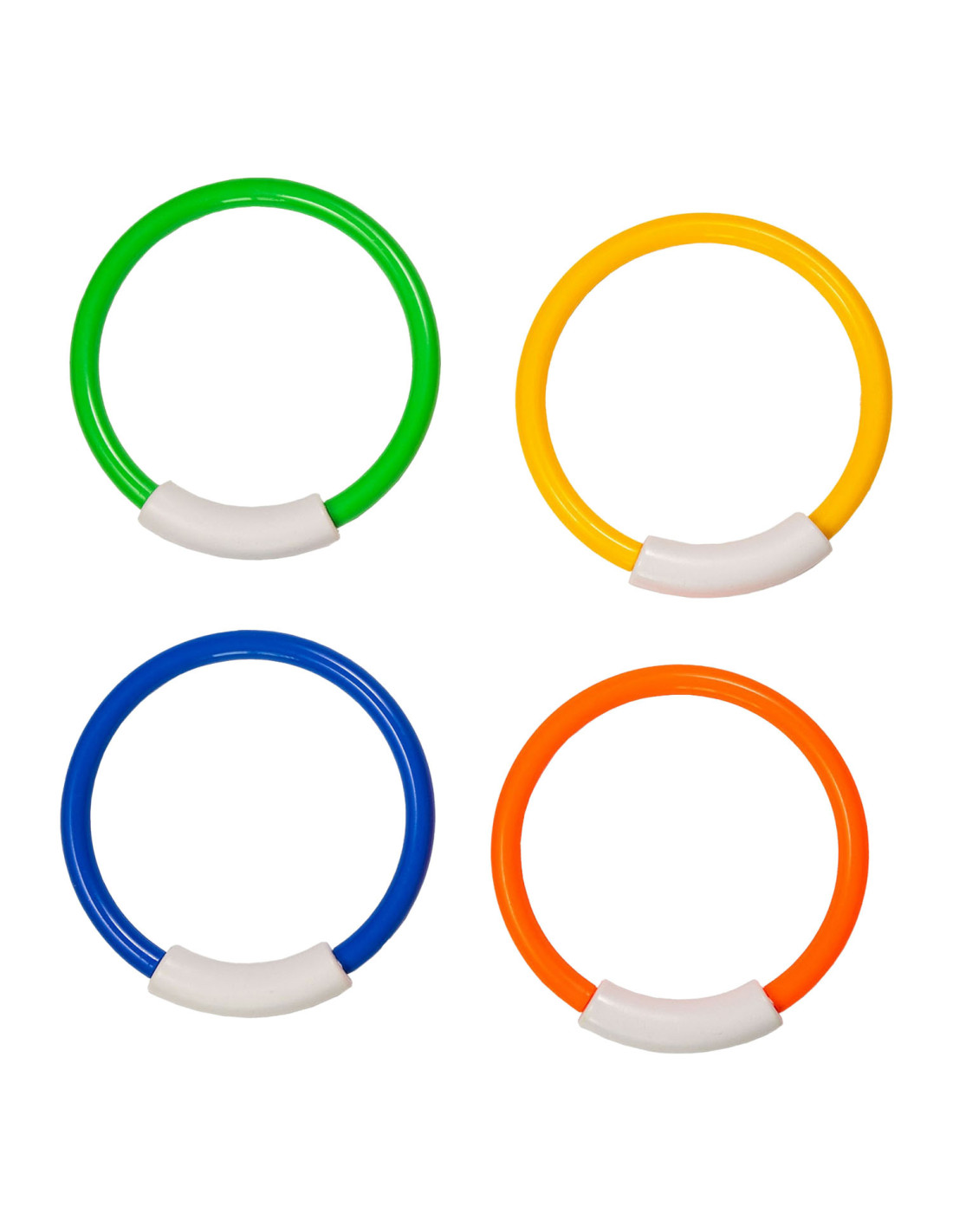 SportX set met 4 gekleurde duikringen. Gooi de ringen op de bodem en duik ze op! Heldere kleuren en eenvoudig vast te pakken. Diameter: 14 cm. Geschikt voor kinderen van 8 t/m 12 jaar. Wordt geleverd in mesh bag met headercard.