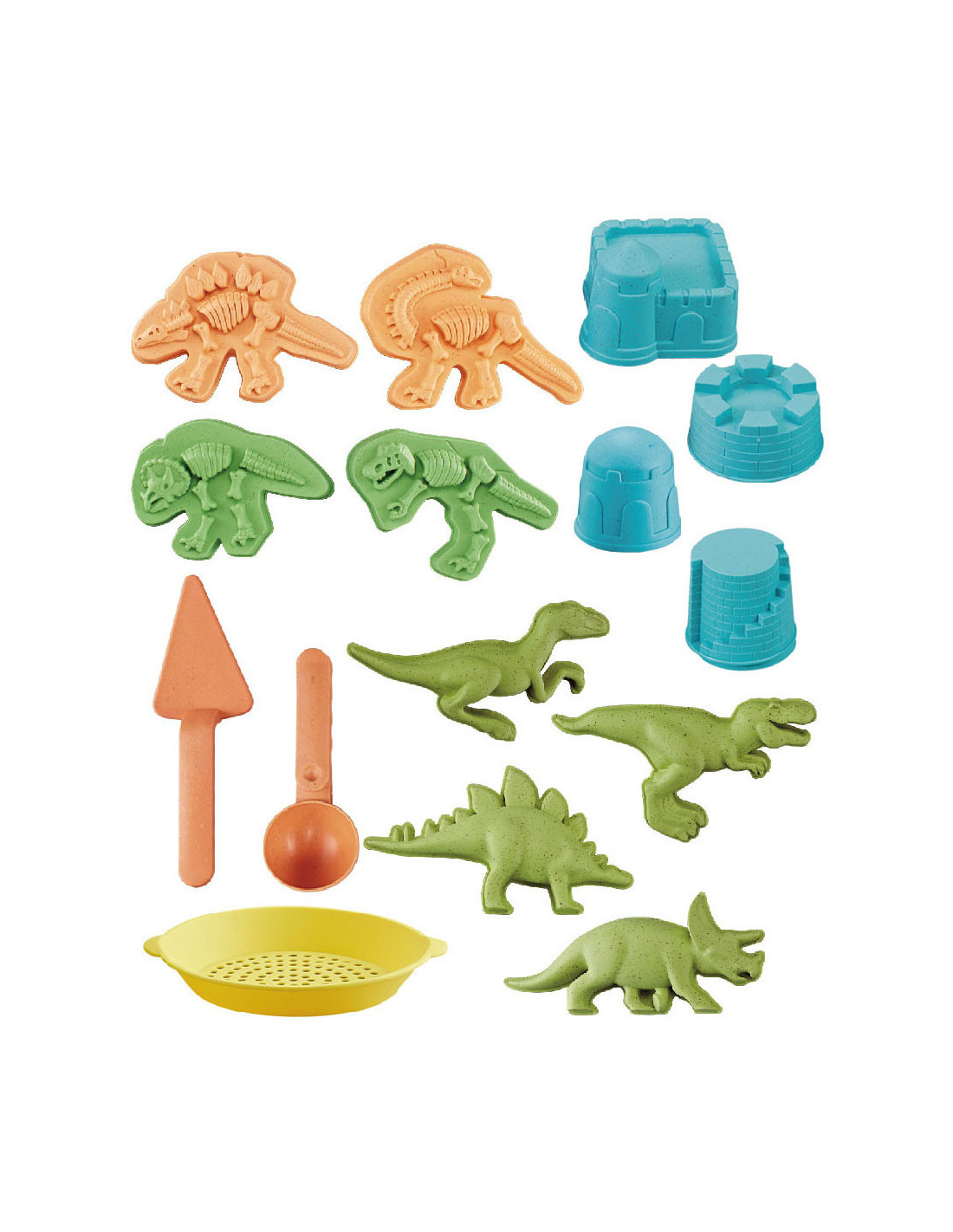 15-delige set zandbakspeelgoed van bioplastic. Inhoud: 12 zandvormen, twee schepjes en een zeef.