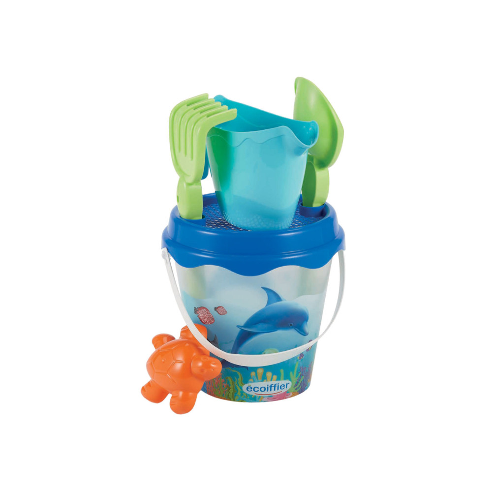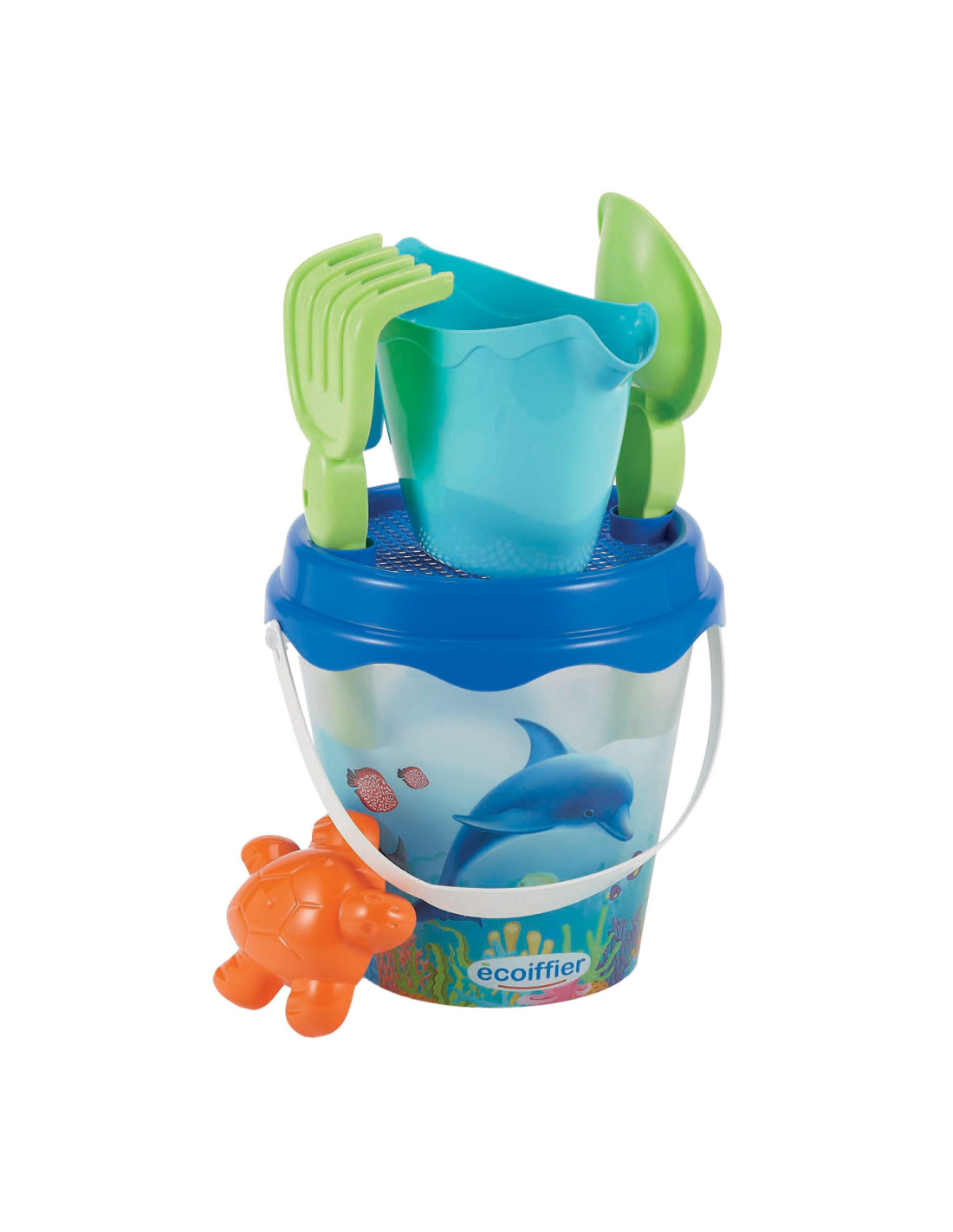 Emmerset dolfijn van 17 cm, bestaande uit 1 zeef, 1 gieter, 1 schep, 1 hark en 1 zandvorm.