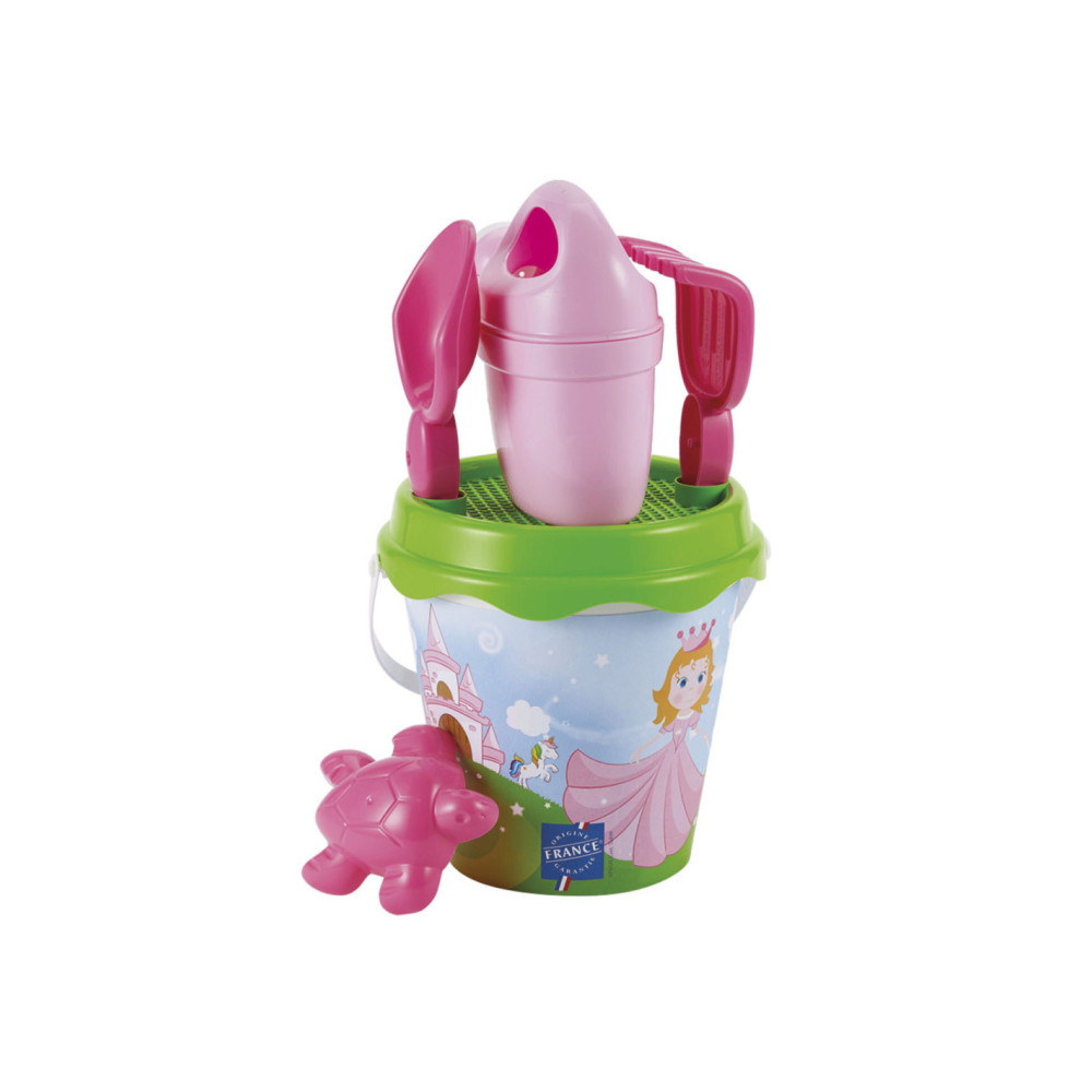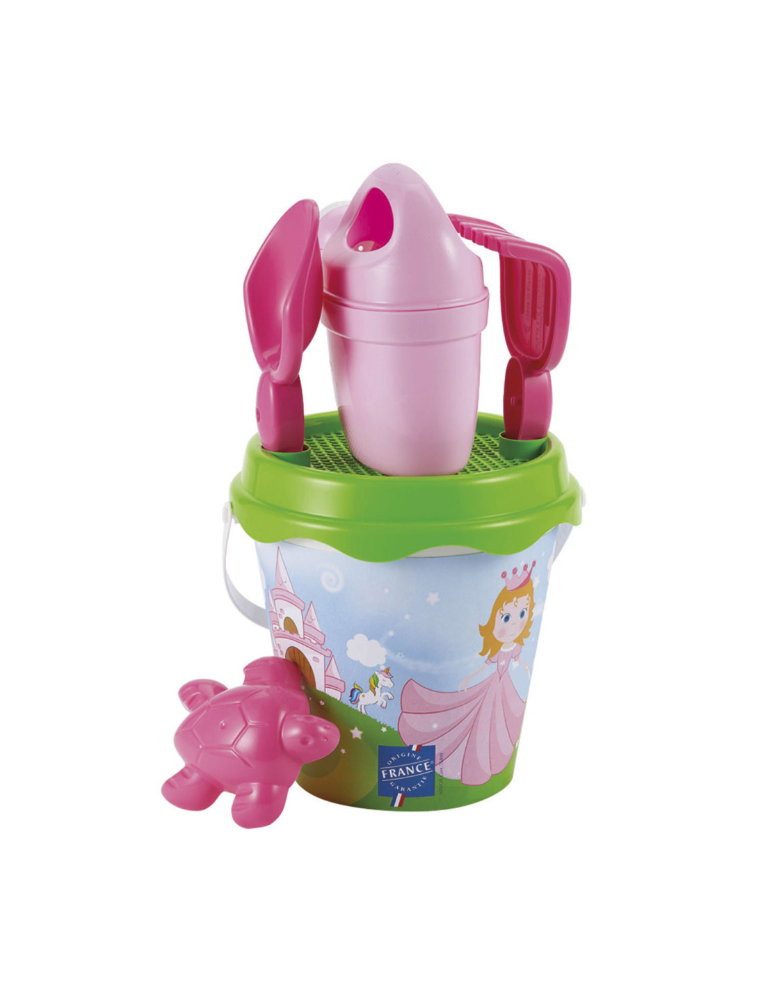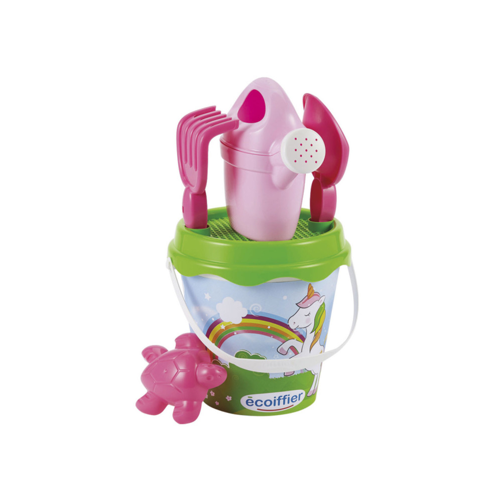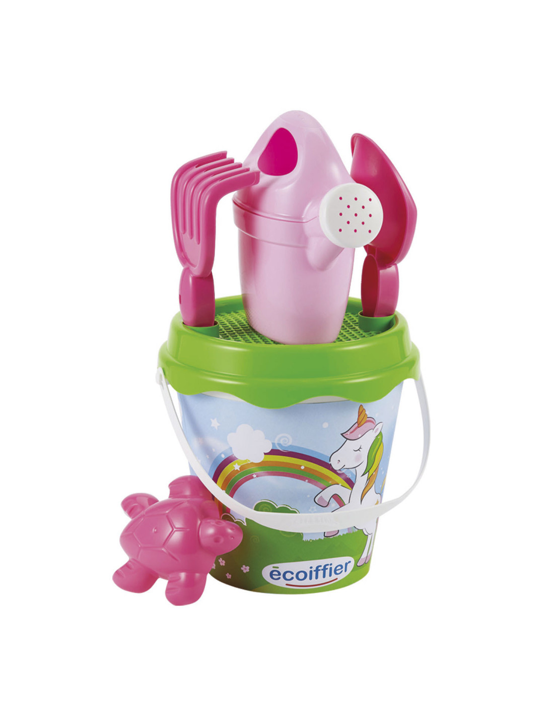 Dat wordt leuk spelen op het strand met de Ecoiffier Strandset Eenhoorn & Prinses. Op de emmer staat een mooie afbeelding van een prinses met haar kasteel en een eenhoorn. Bij de set hoort verder nog een gieter, een harkje, een schepje en een schildpad zandvormpje. De deksel van de emmer kan ook gebruikt worden als een zeefje.