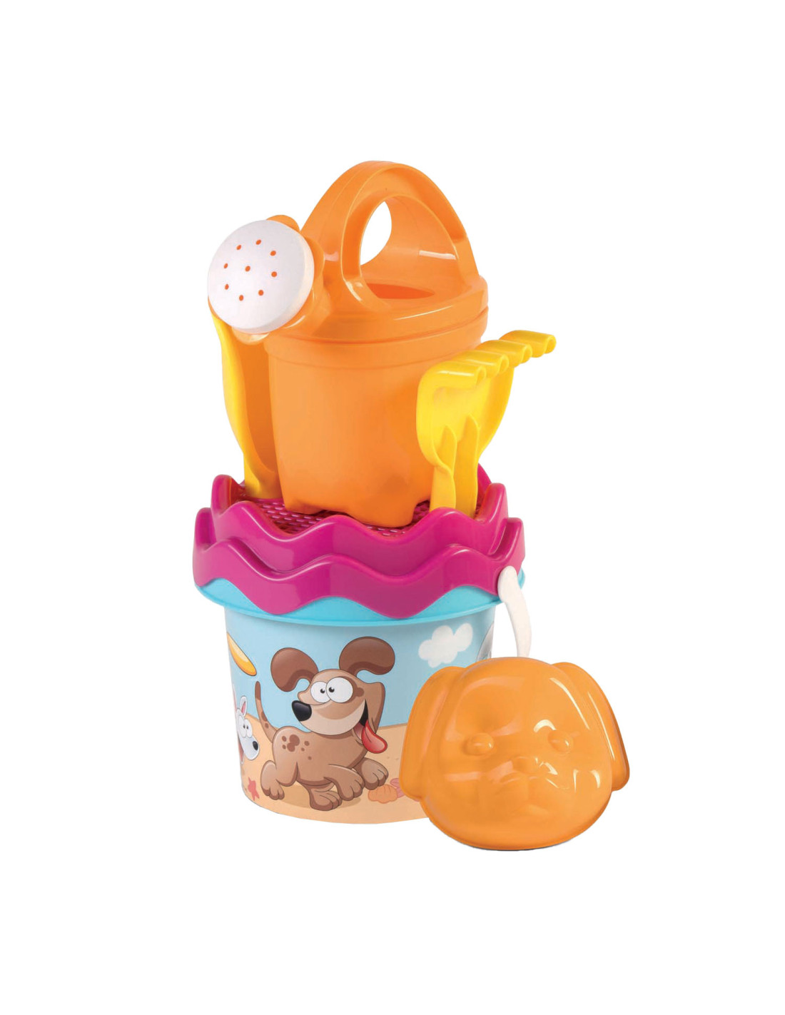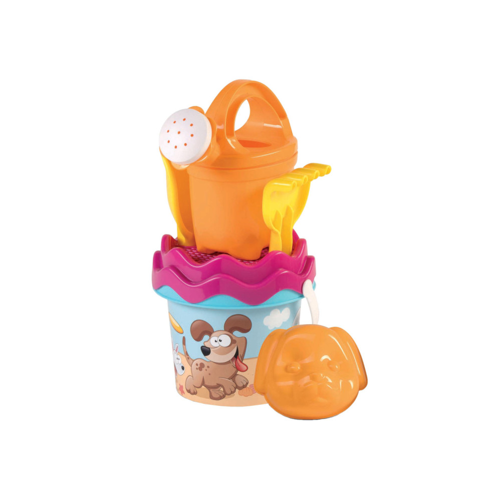 Setje met emmer, gieter, zeef, harkje en zandvormpje.