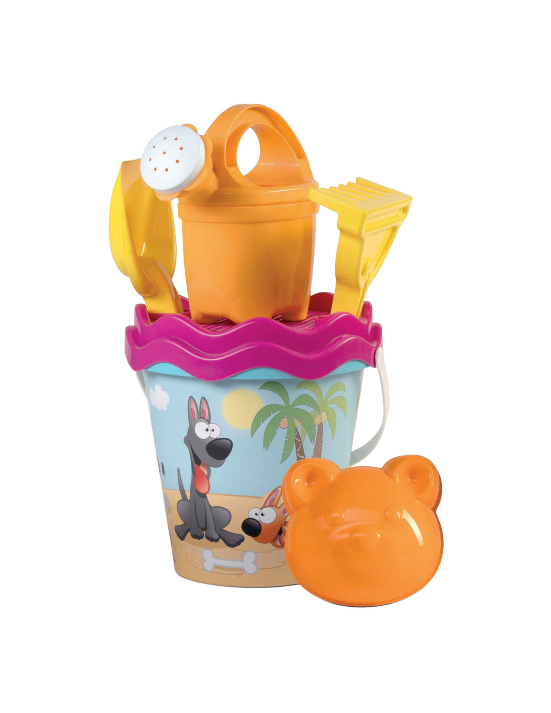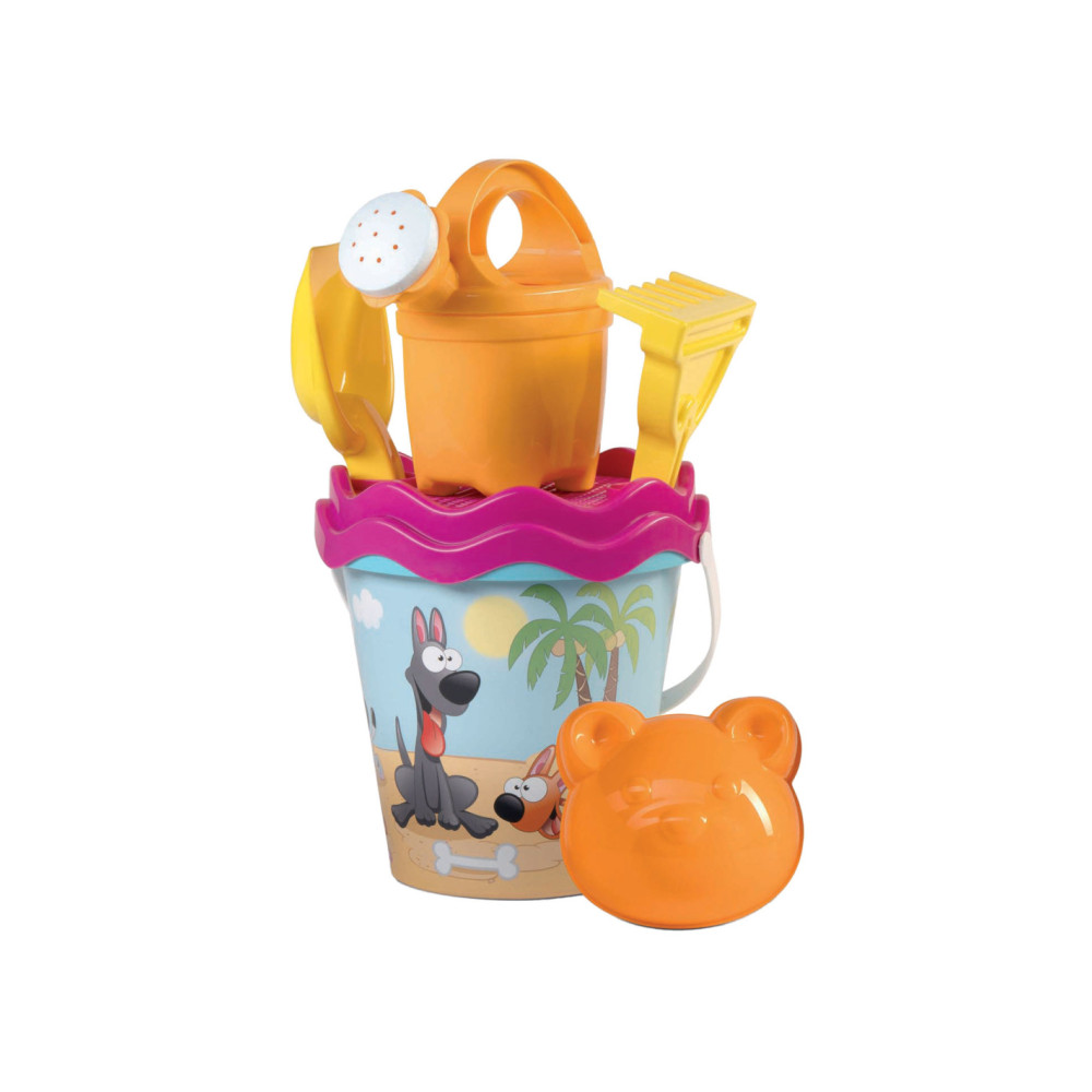 Set met emmertje, schepje, harkje, zeef en zandvormpje.