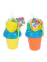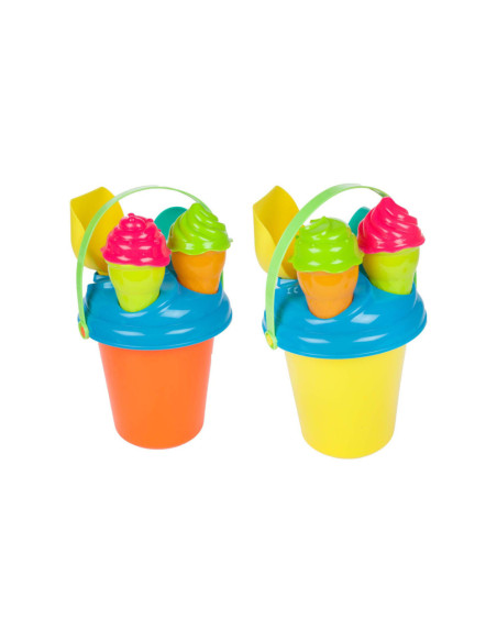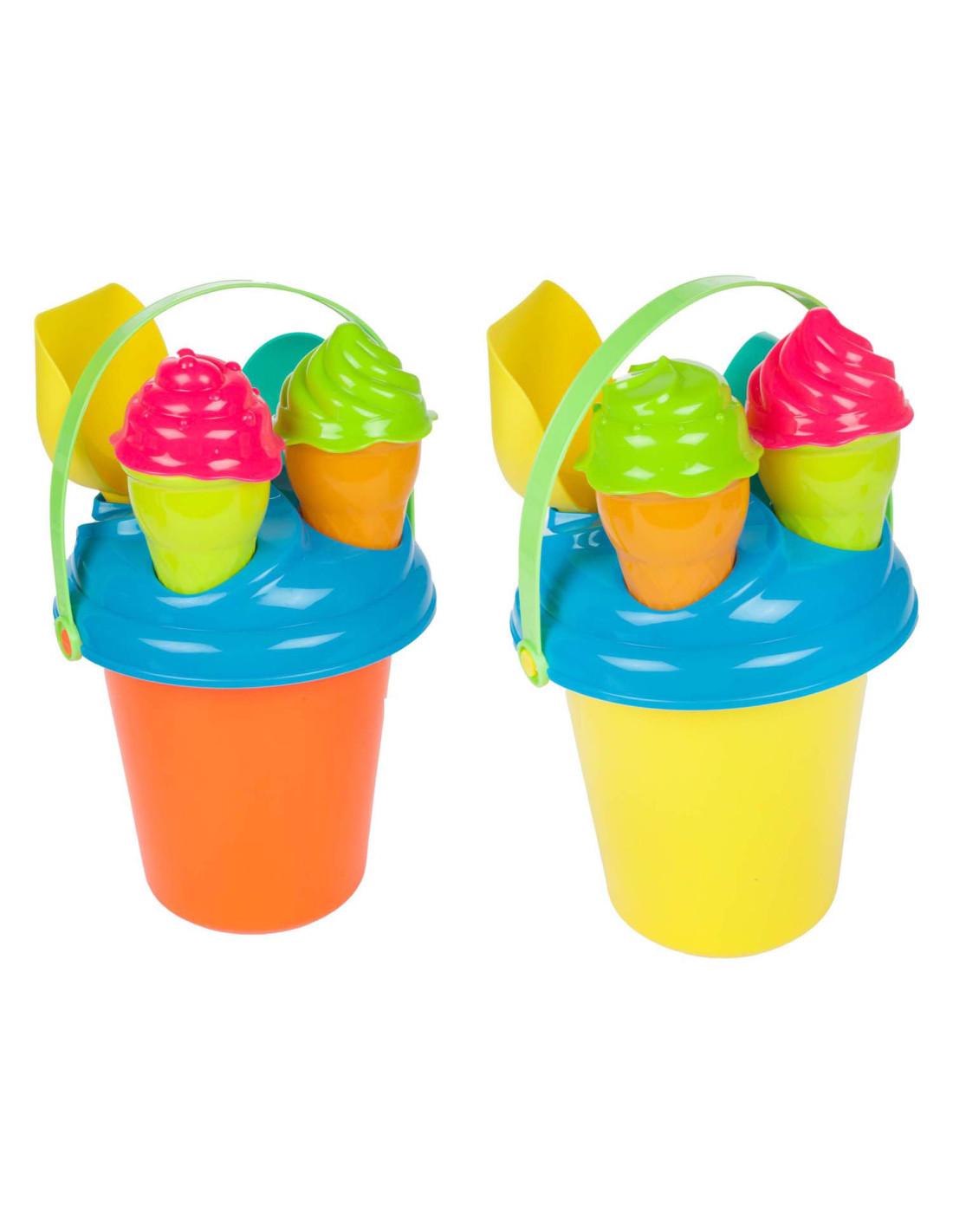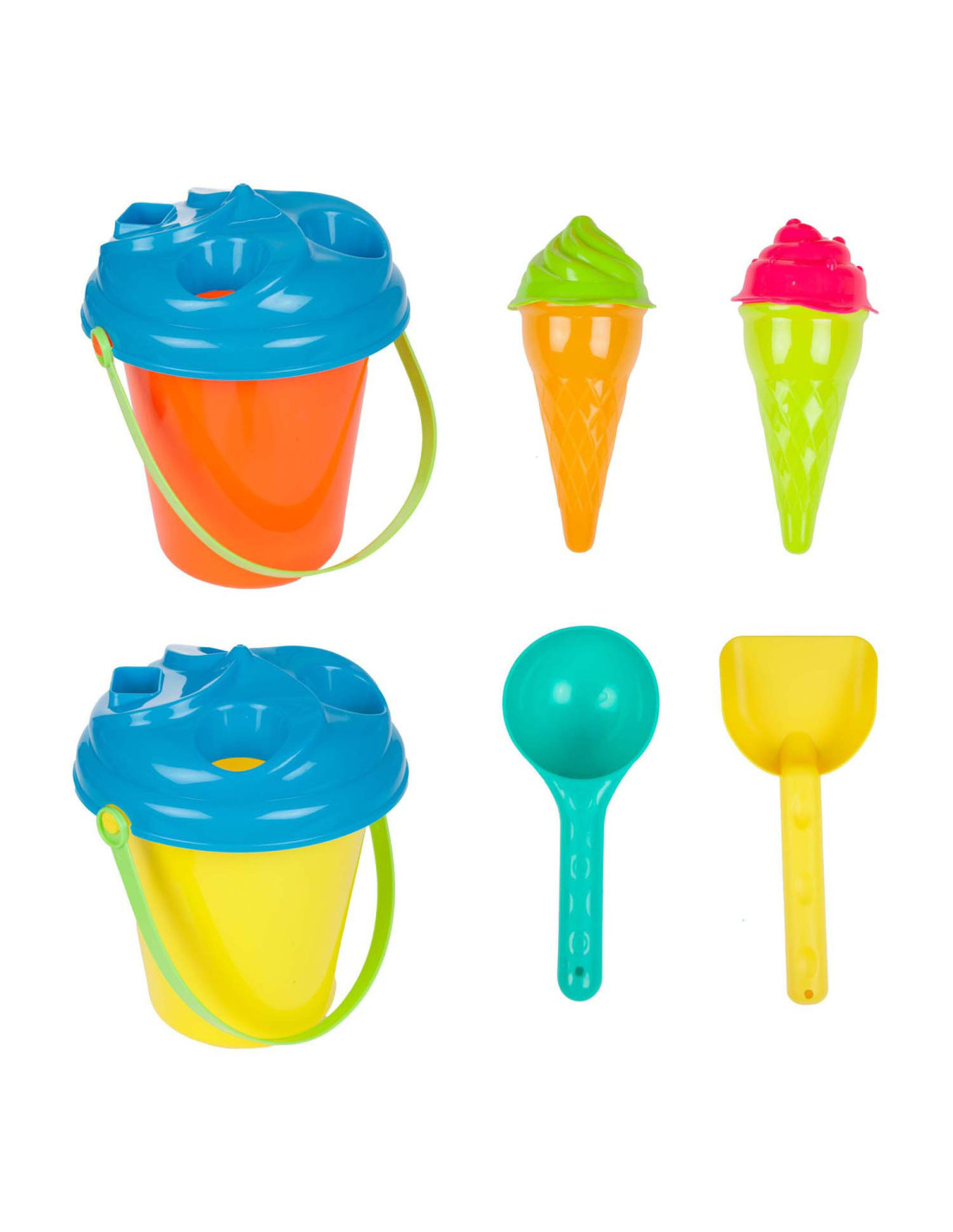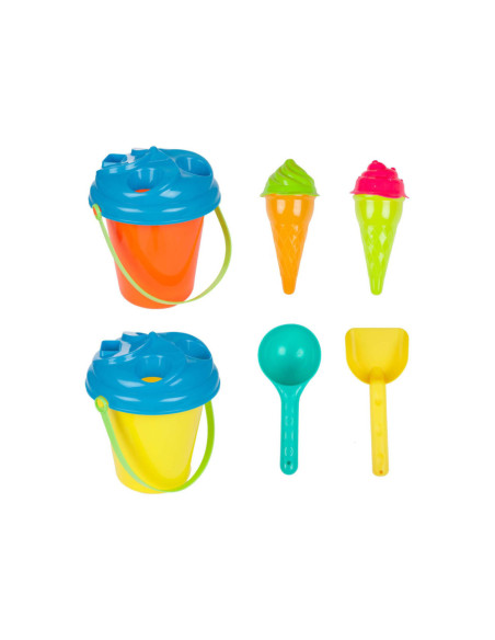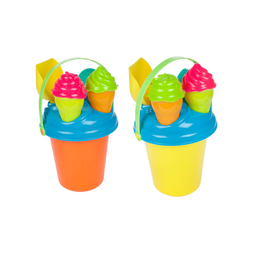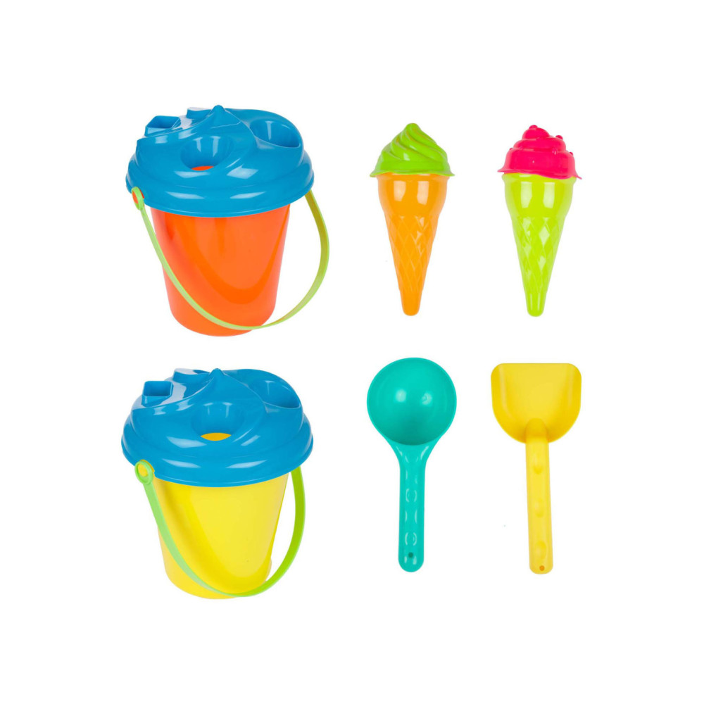 Kunststof strandset, 6dlg. Inhoud: 1 emmer, 1 deksel, 2 ijsjes, en 2 schepjes.