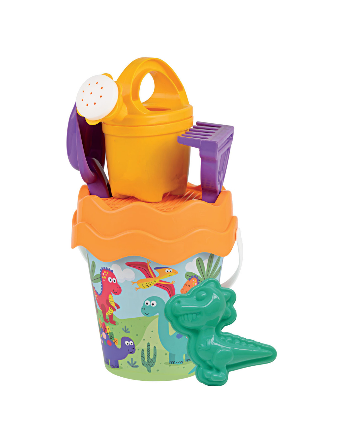 In deze set vind je alles wat een jonge ontdekkingsreiziger nodig heeft om zijn eigen dinowereld te creëren. De set bevat een emmer, zeef, hark, schep, zandvorm en zelfs een gieter - allemaal versierd met stoere dino-afbeeldingen.