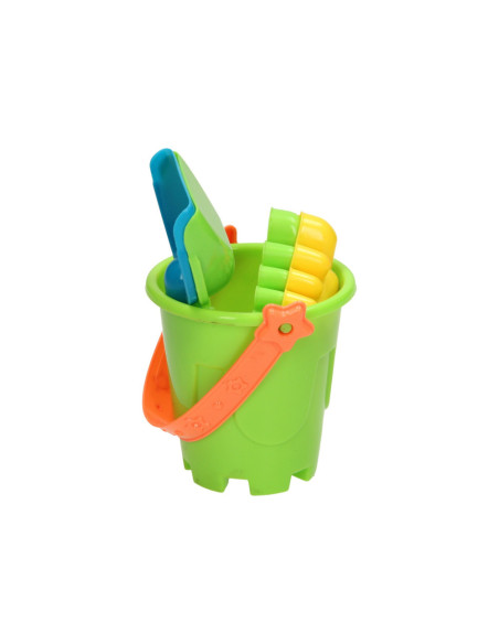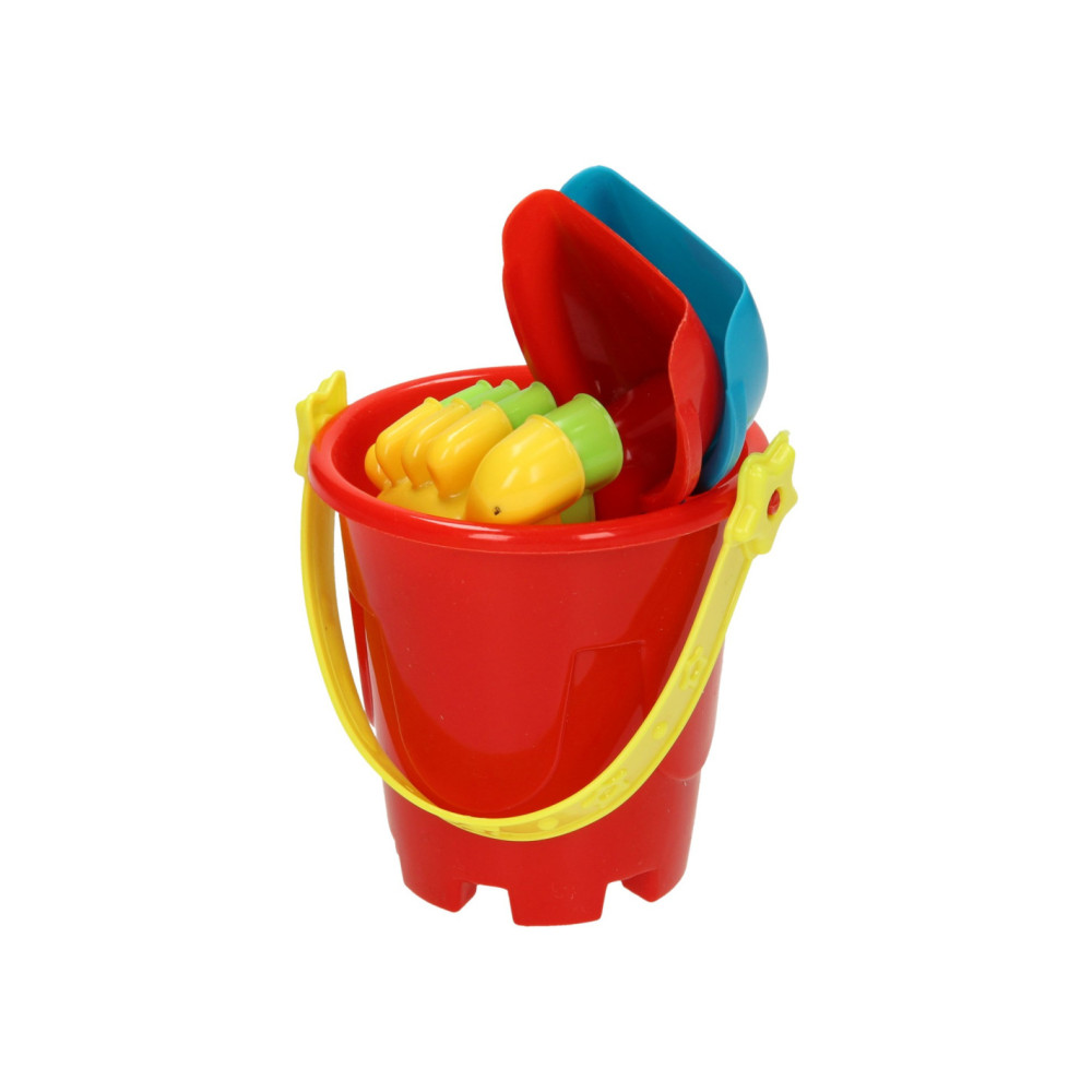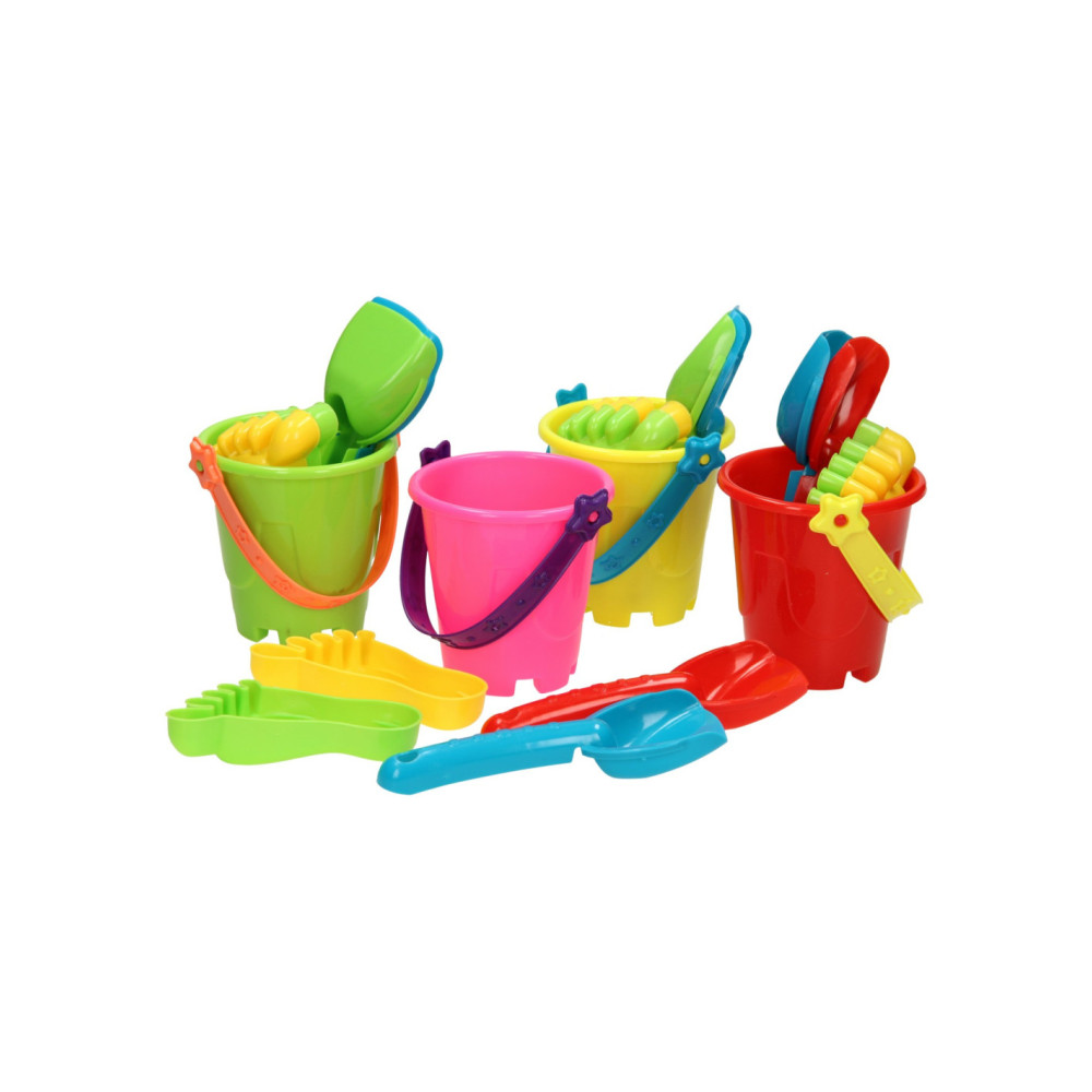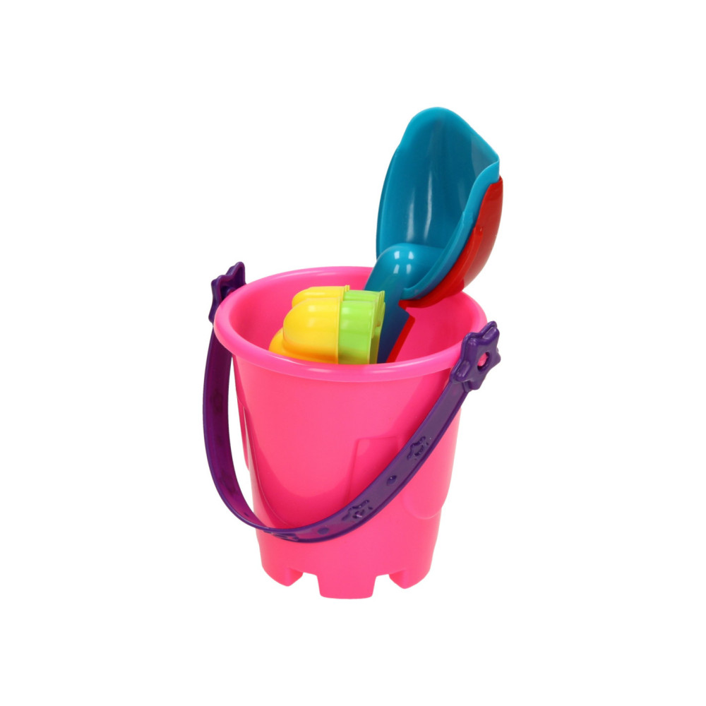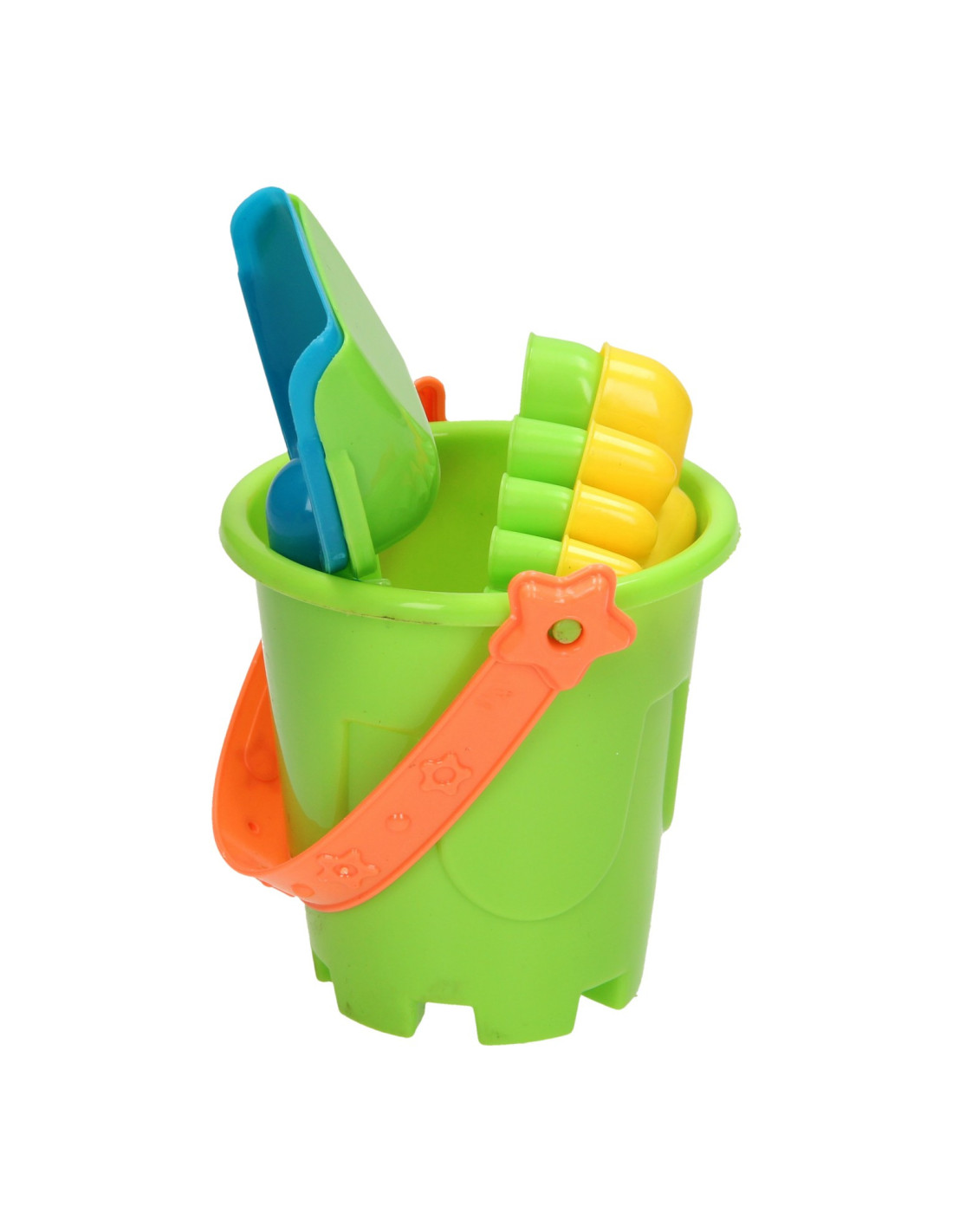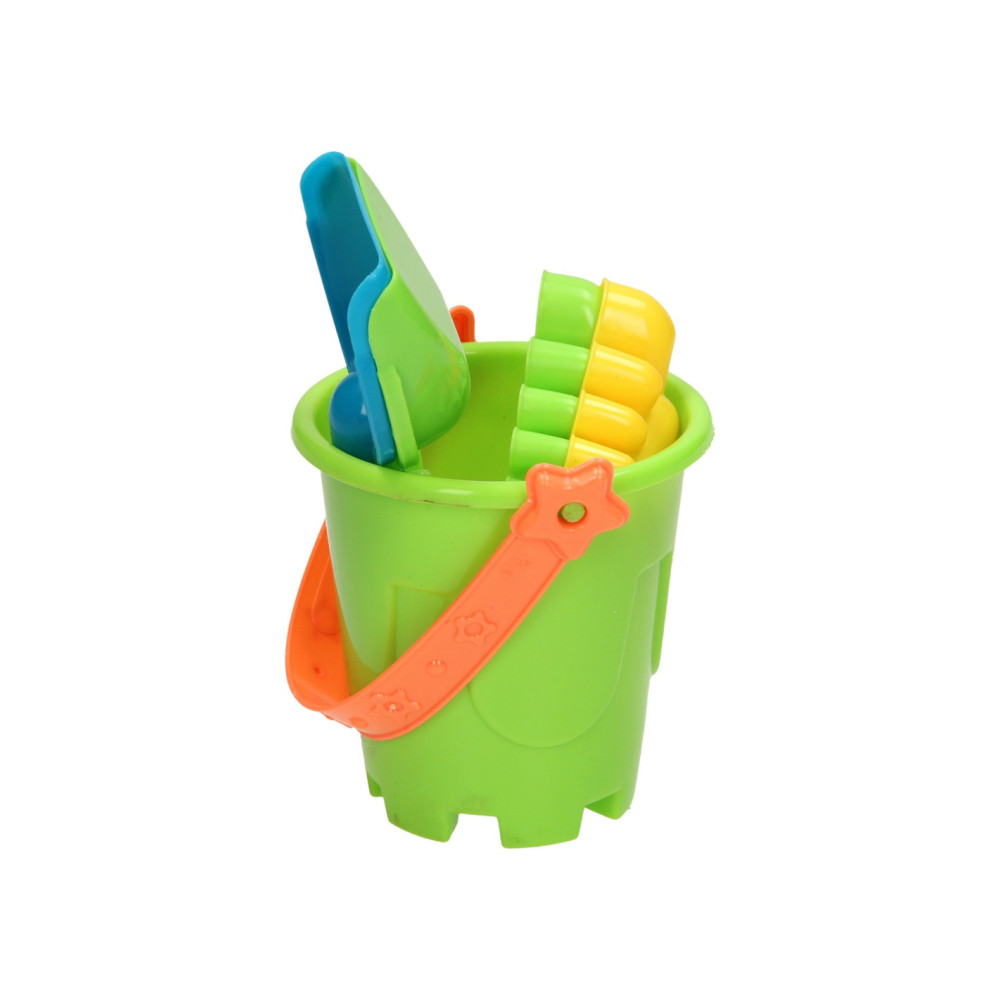 Dit kunststof strandsetje bevat een emmertje, twee schepjes en twee zandvormpjes in de vorm van voetjes. Leuk als uitdeelcadeautje en gemakkelijk mee te nemen door het kleine formaat.