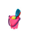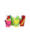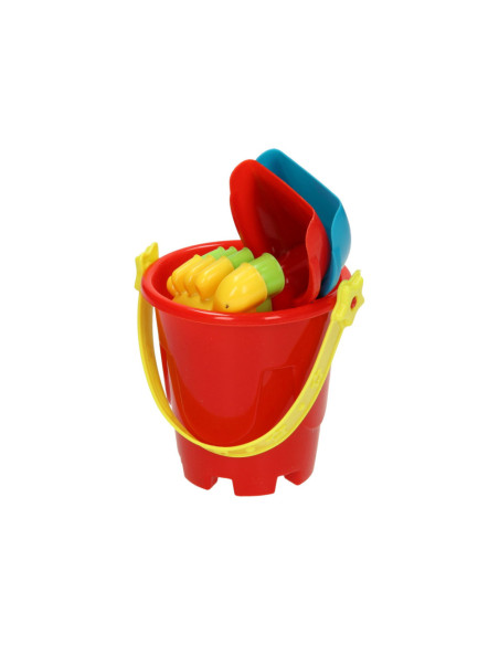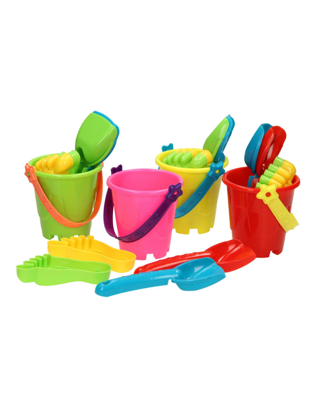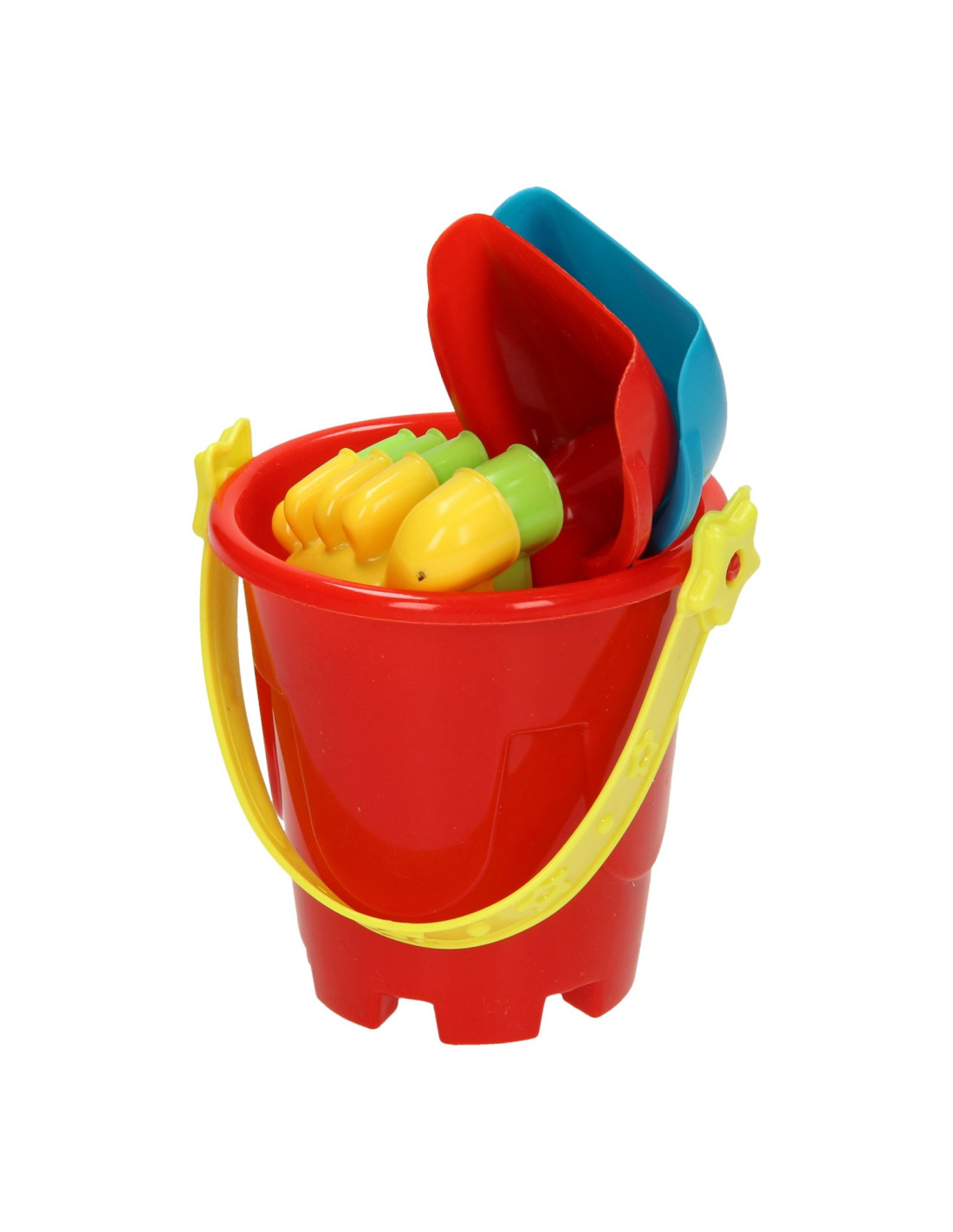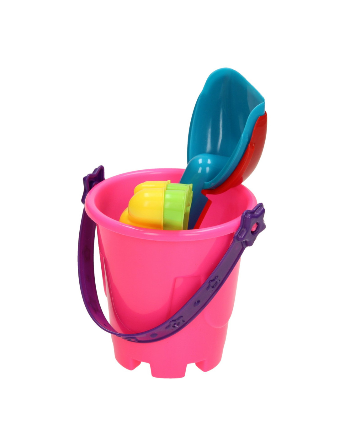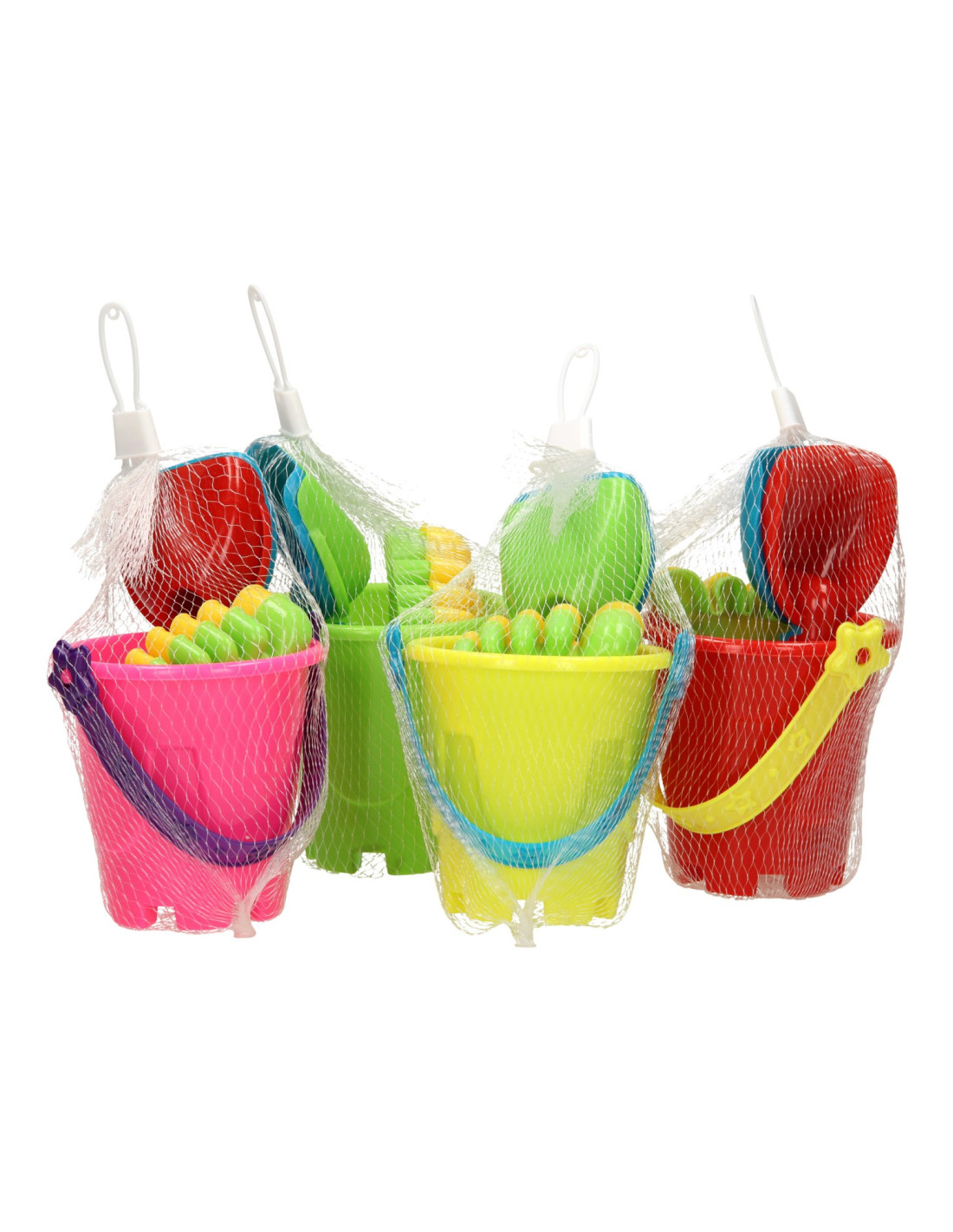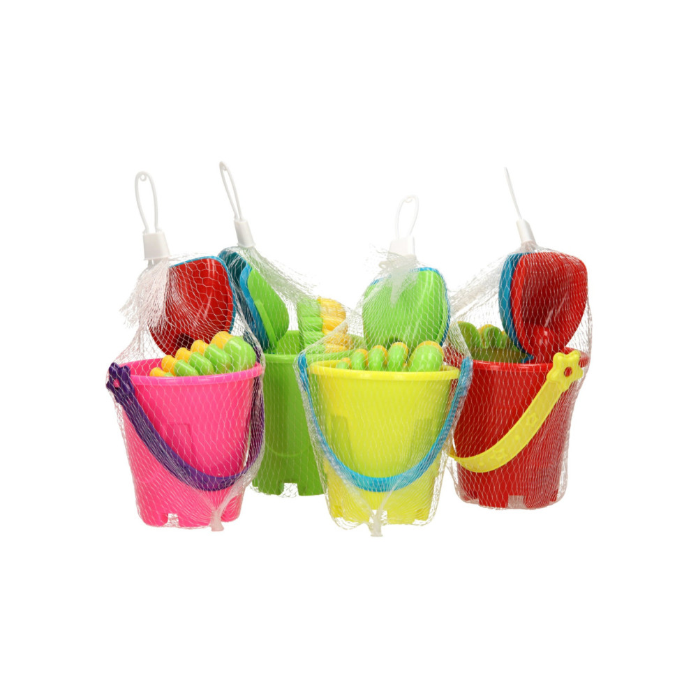 Dit kunststof strandsetje bevat een emmertje, twee schepjes en twee zandvormpjes in de vorm van voetjes. Leuk als uitdeelcadeautje en gemakkelijk mee te nemen door het kleine formaat.