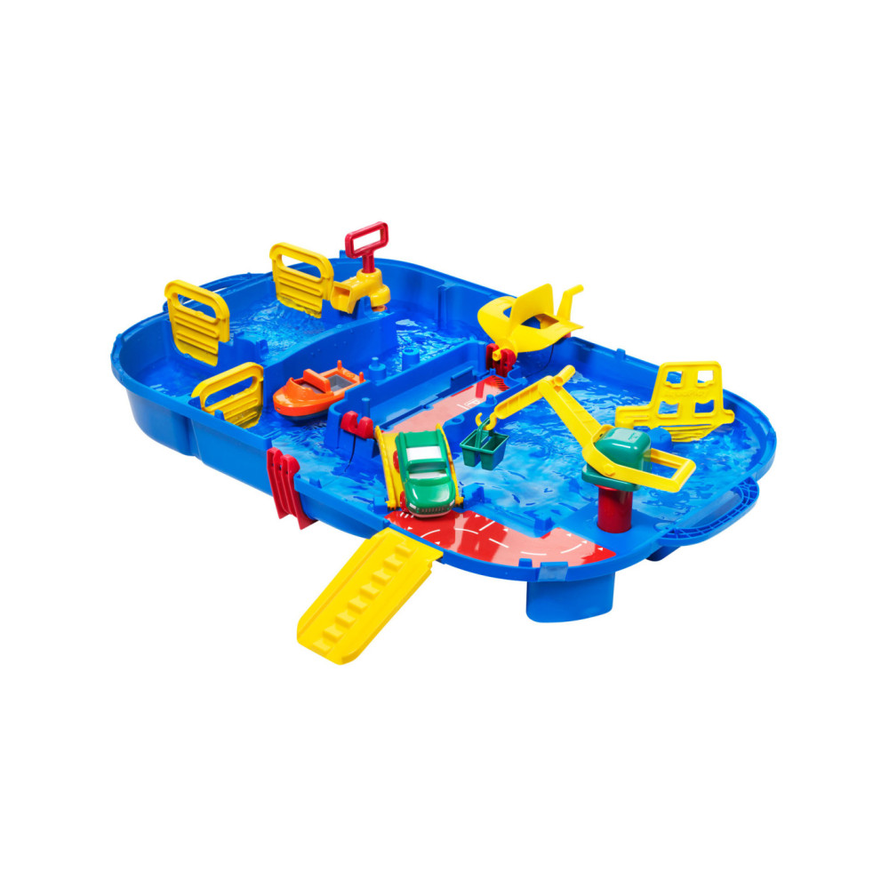 Neem je favoriete waterbaan mee op pad met deze Draagbare Aqualock 1616 van AquaPlay. Open de koffer, vul hem met water en het gespetter kan beginnen! Laat Wilma de nijlpaard de amfibische auto berijden. Pik een container op in de haven en rijd over de brug of verplaats je door de sluizen. Met een draai aan het waterrad beweeg je de voertuigen voort.