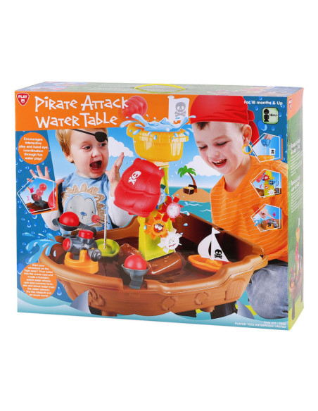 Begin het avontuur op volle zee! De Play Pirate Attack Watertafel stimuleert interactief spelen en hand-oogcoördinatie. Giet water in het kraaiennest en maak een fontein. Kijk hoe waterwielen draaien en stromingen ontstaan. Richt en schiet water uit het waterkanon. Vuur de katapult af en nog veel meer.