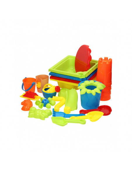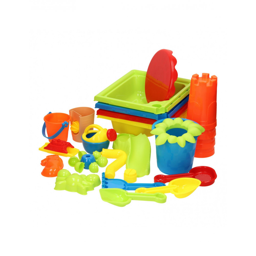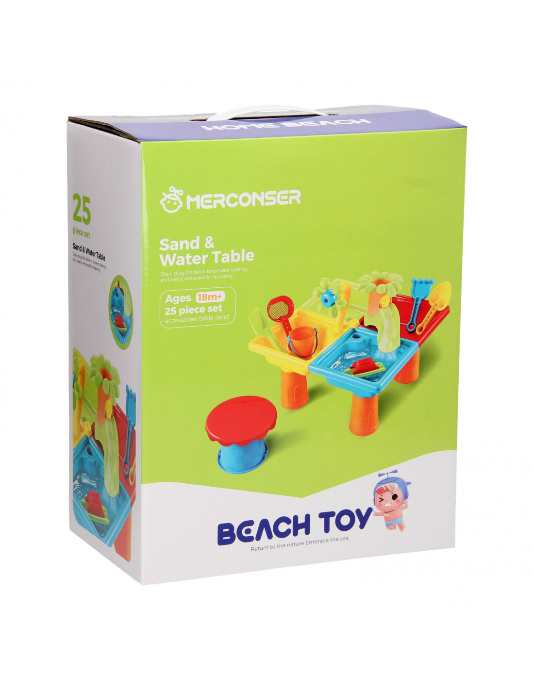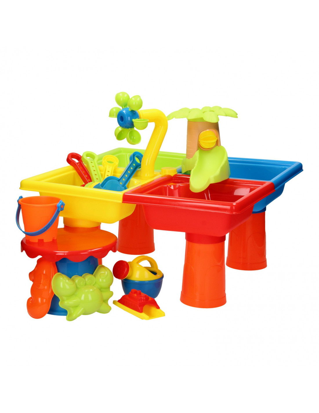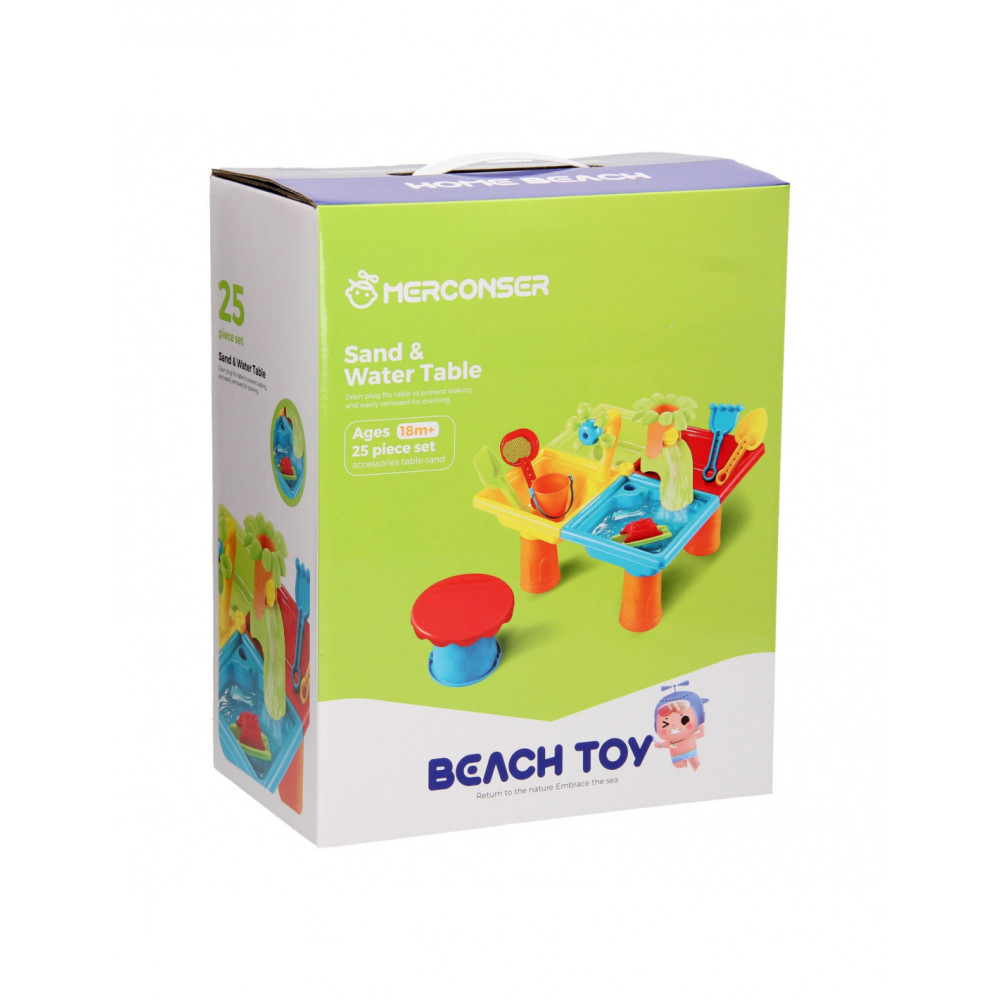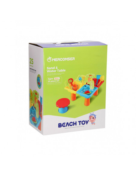 Met deze vrolijk gekleurde strandtafel kun je uren heerlijk kliederen. Vul de tafel met zand en water en de speelpret kan beginnen! De strandtafel heeft vier aparte vakken om te vullen met zand en water. De strandtafel is gemaakt van stevig kunststof. Inclusief 25 accessoires zoals een krukje, emmer, zeef, hark, schep, gieter en zandvormen.