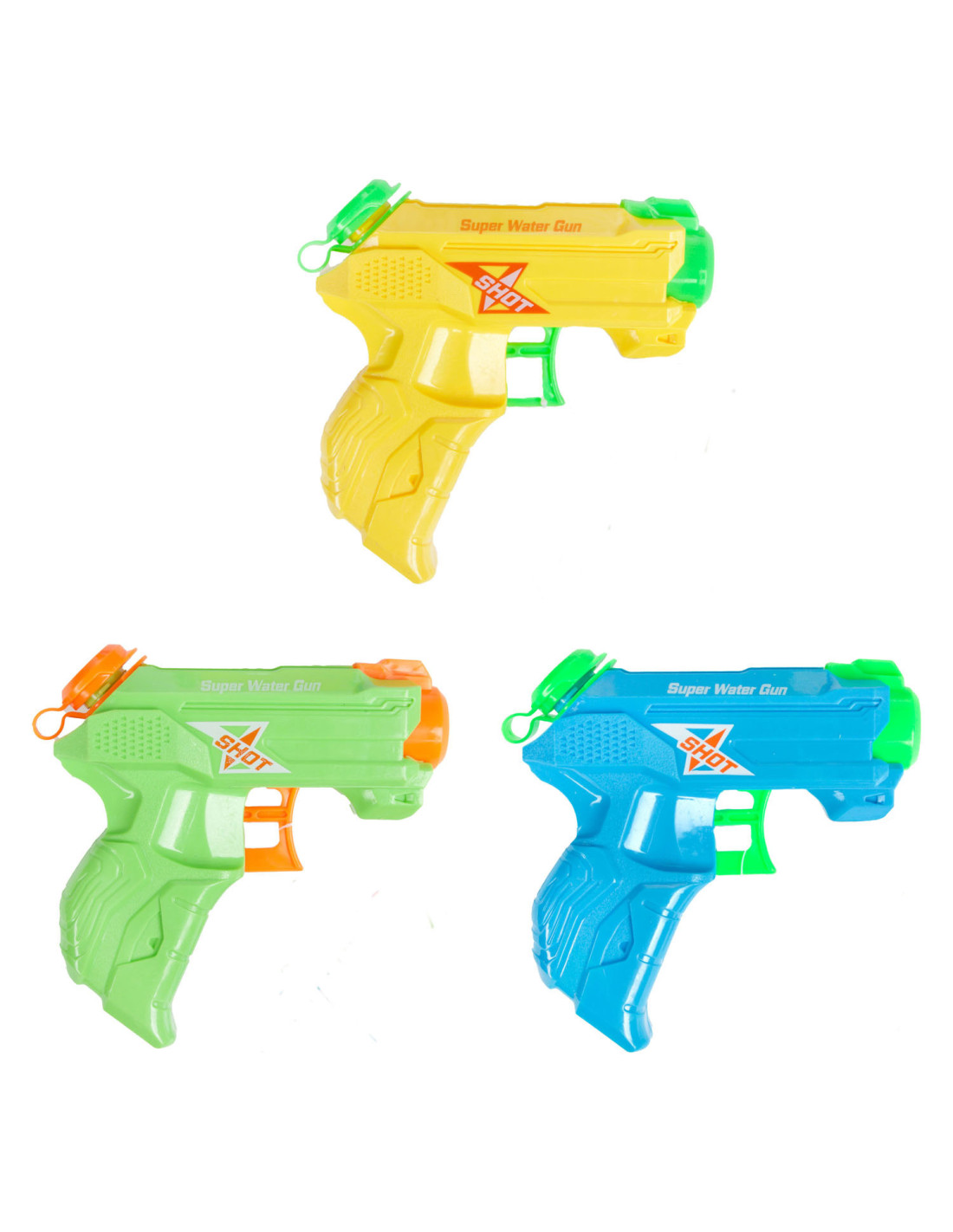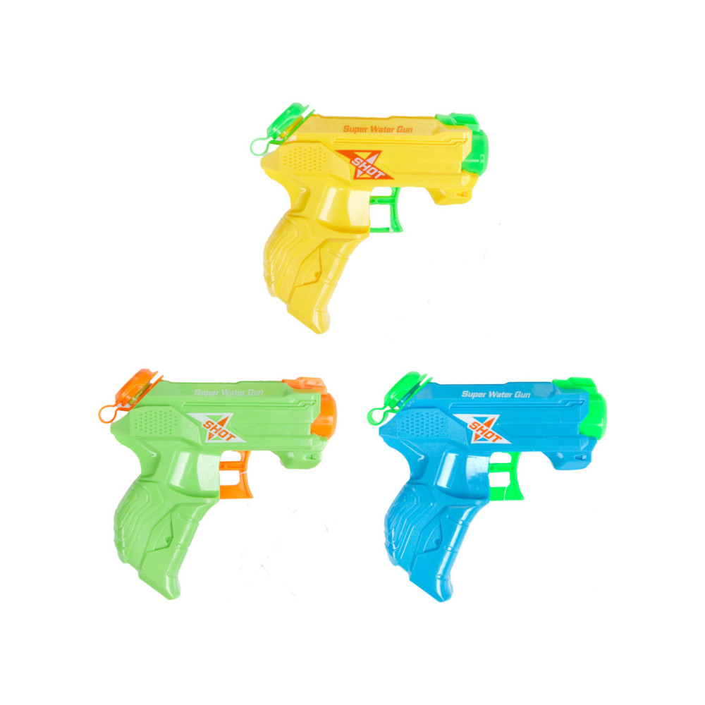 Mini waterpistool van 12 centimeter groot. Verkrijgbaar in geel, groen en blauw/
