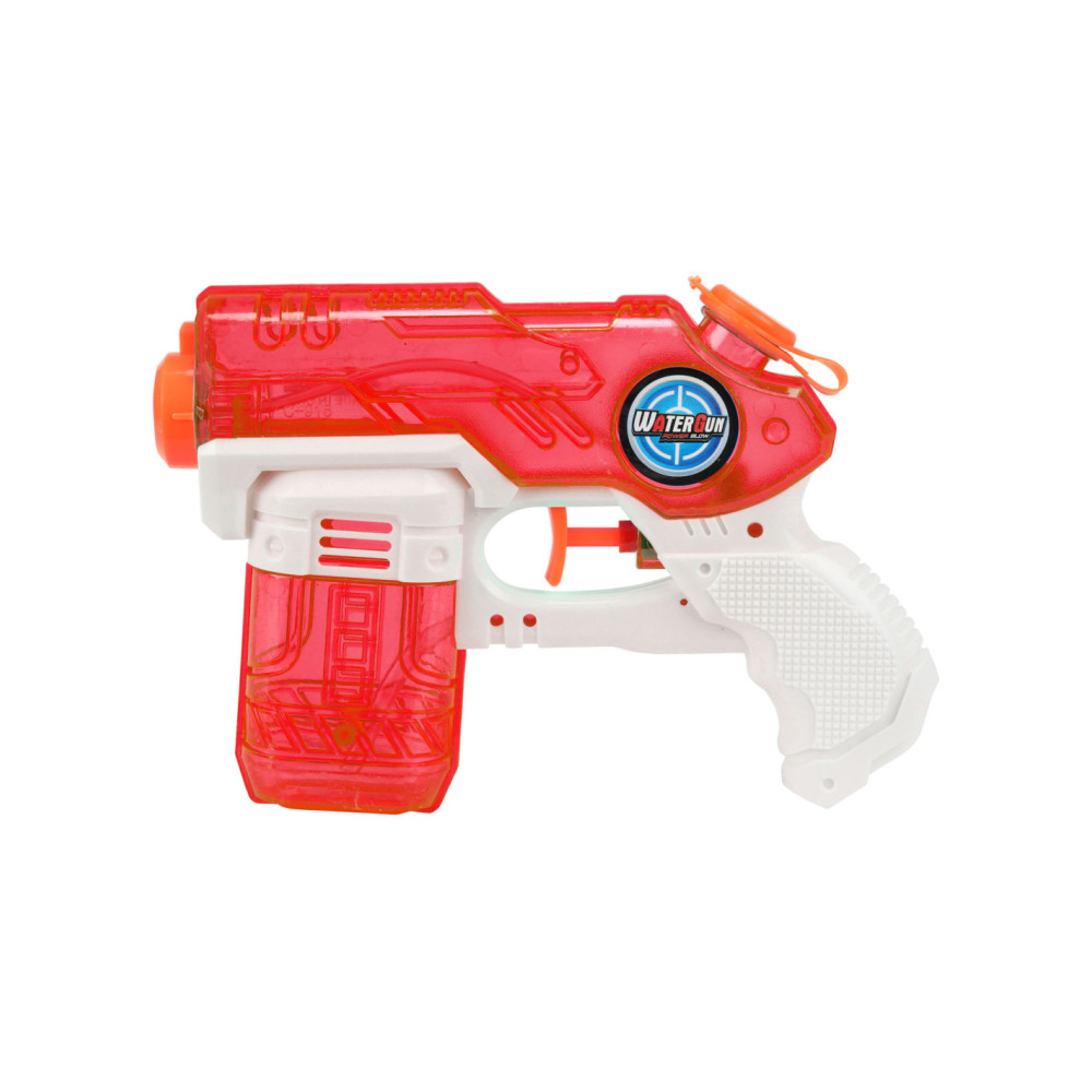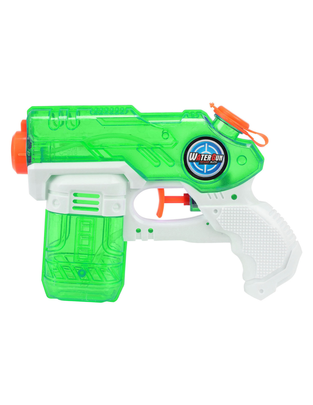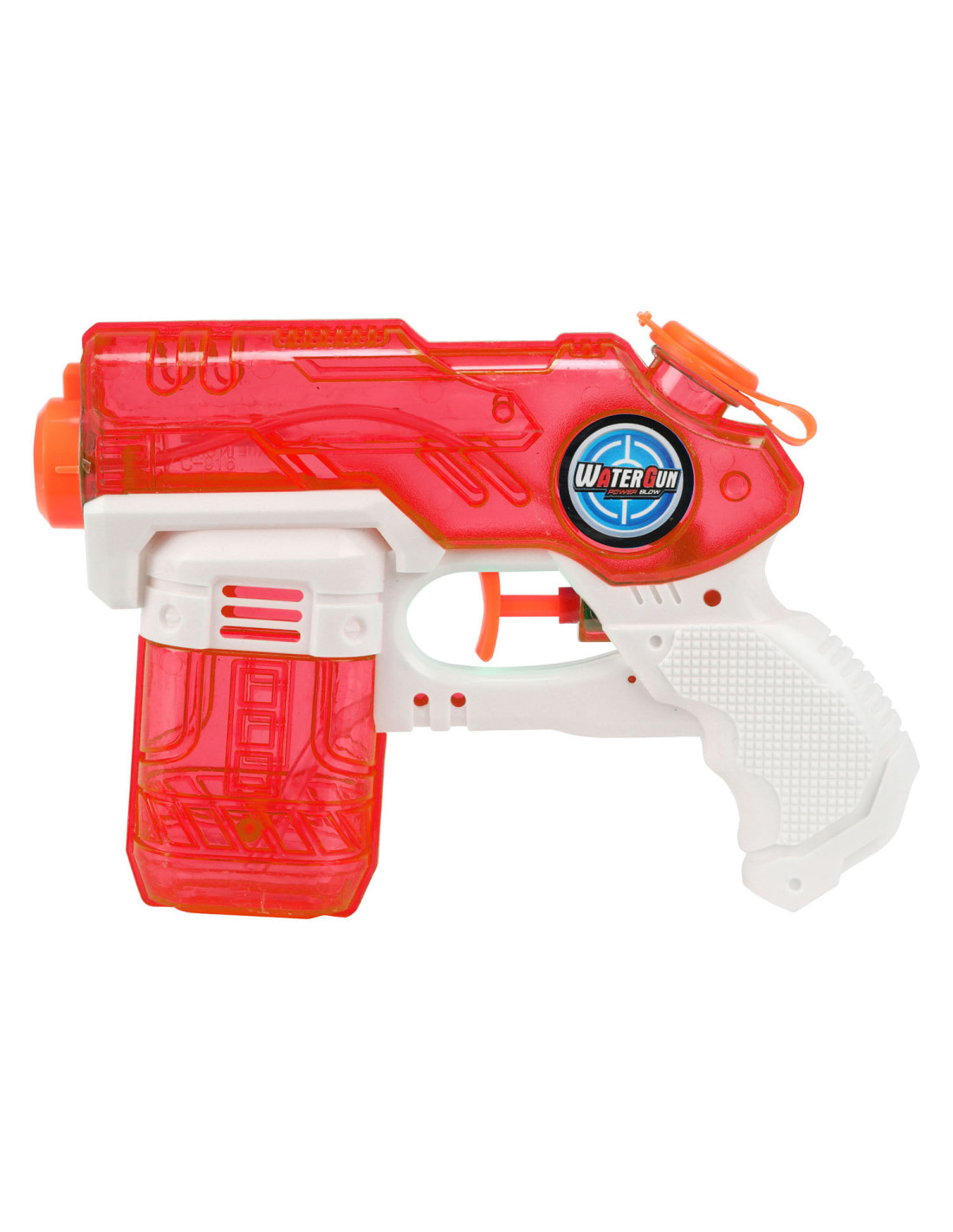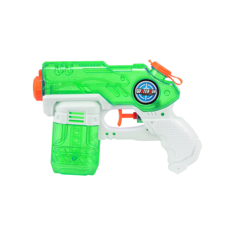 Semi-transparant waterpistool van 19 centimeter groot. Verkrijgbaar in groen, rood en blauw. Geschikt voor kinderen vanaf 3 jaar.