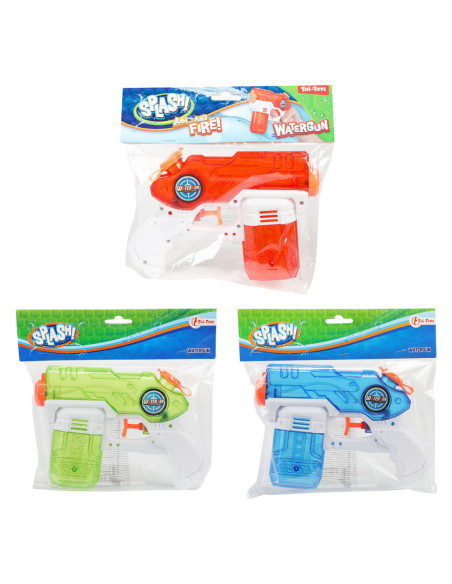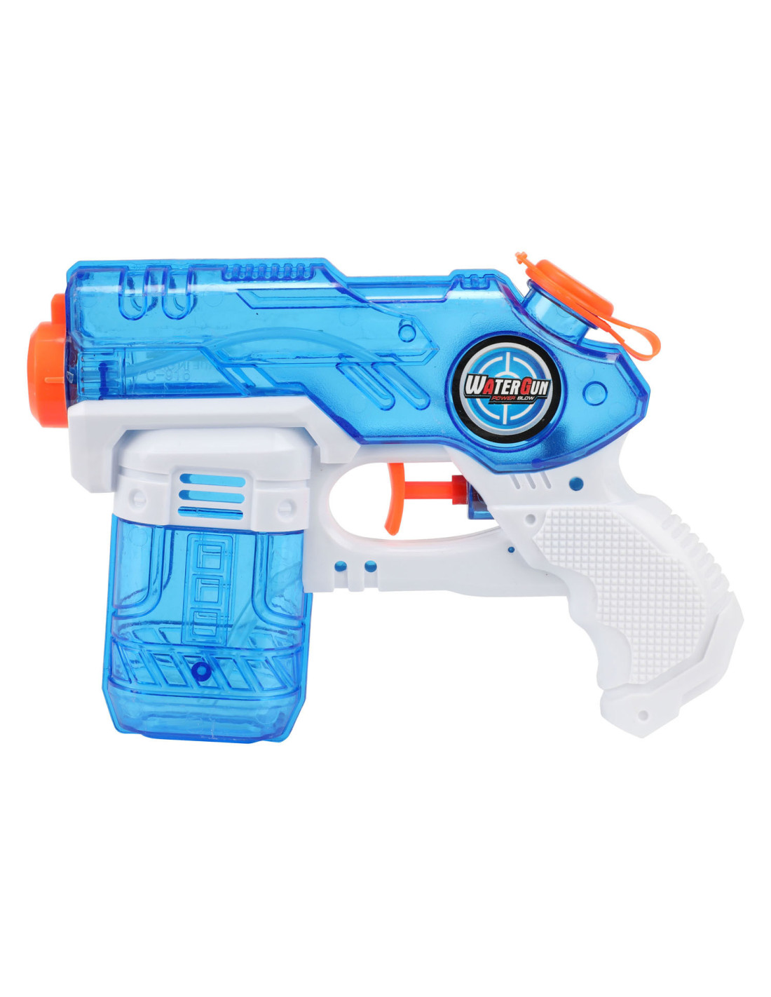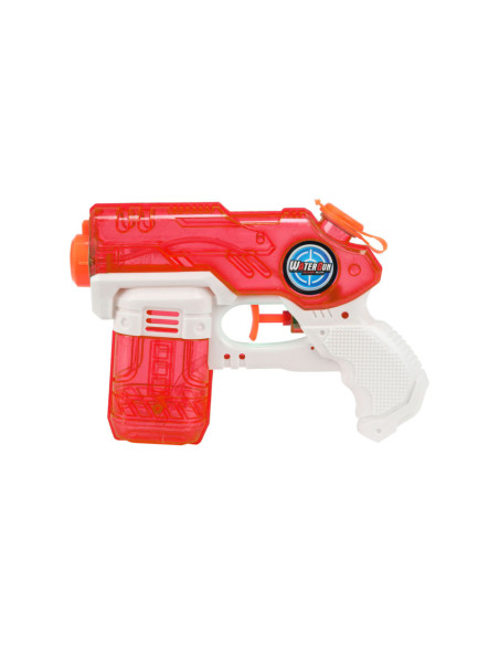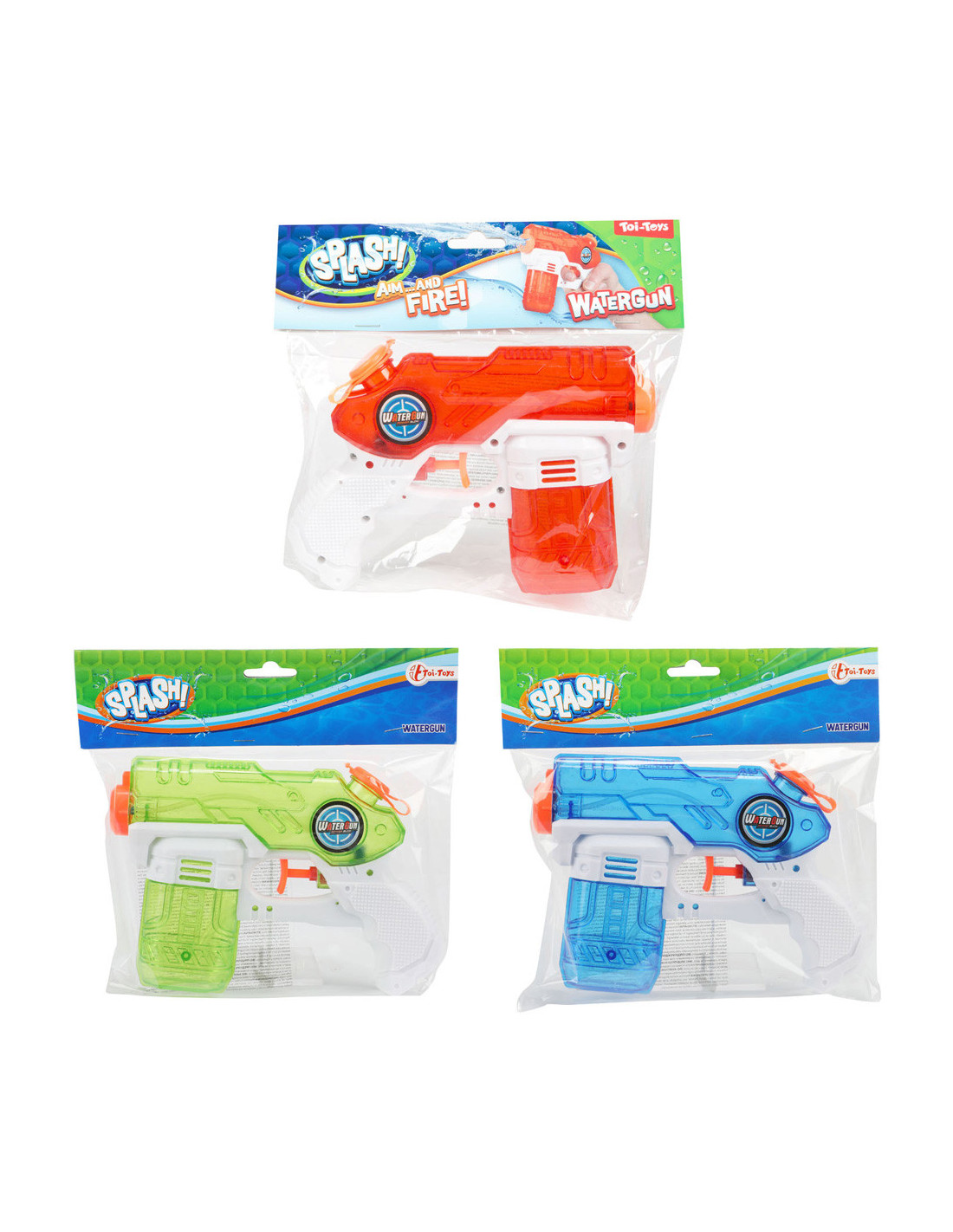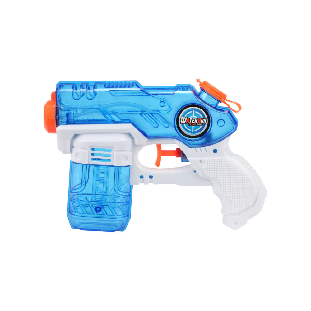 Semi-transparant waterpistool van 19 centimeter groot. Verkrijgbaar in groen, rood en blauw. Geschikt voor kinderen vanaf 3 jaar.