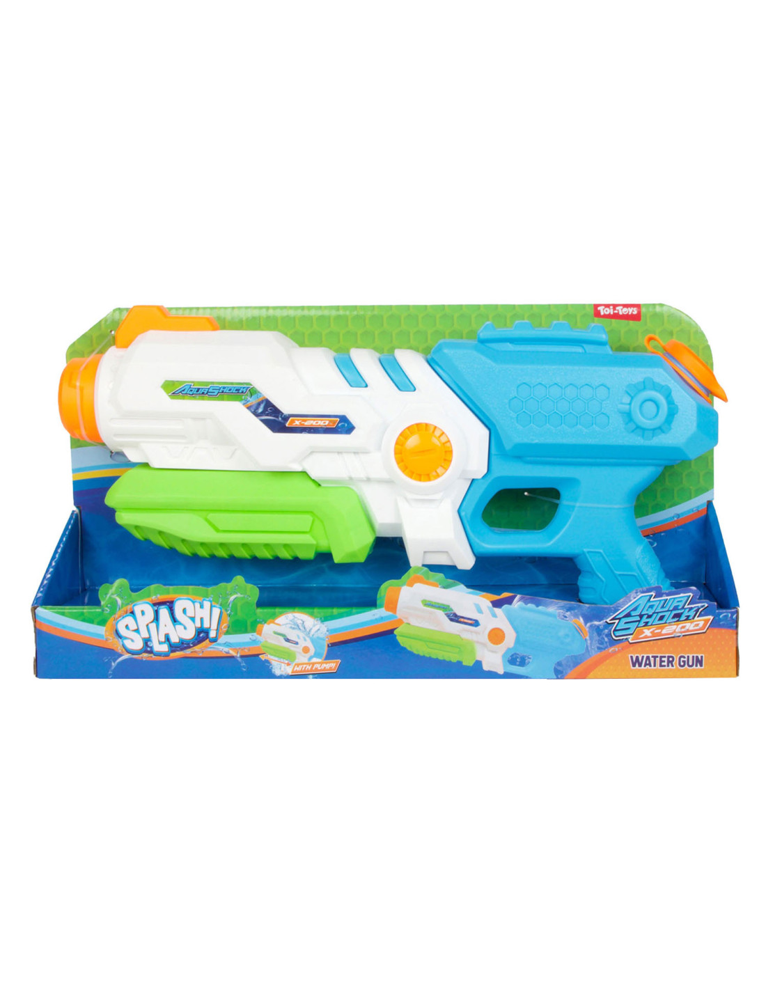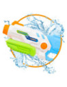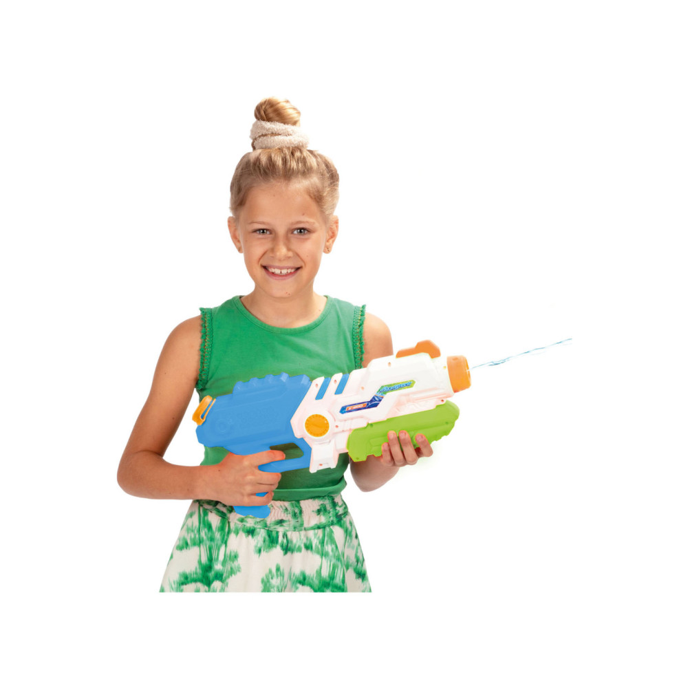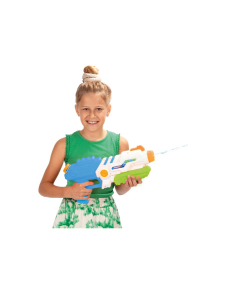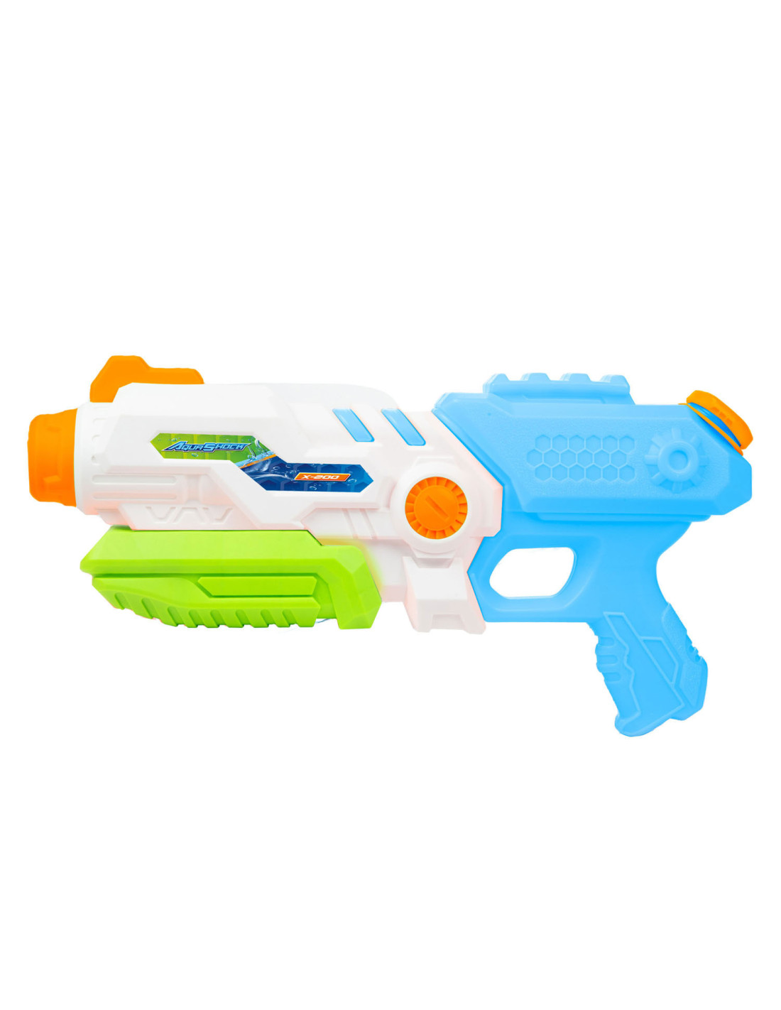 SPLASH Hexagon Waterpistool met een tankinhoud van 850 ml. Het waterpistool is wit met blauw, groen en oranje details en is ca. 41 centimeter lang.