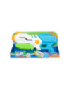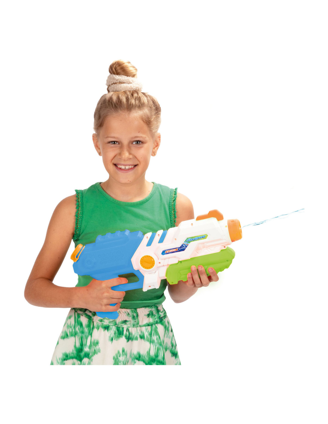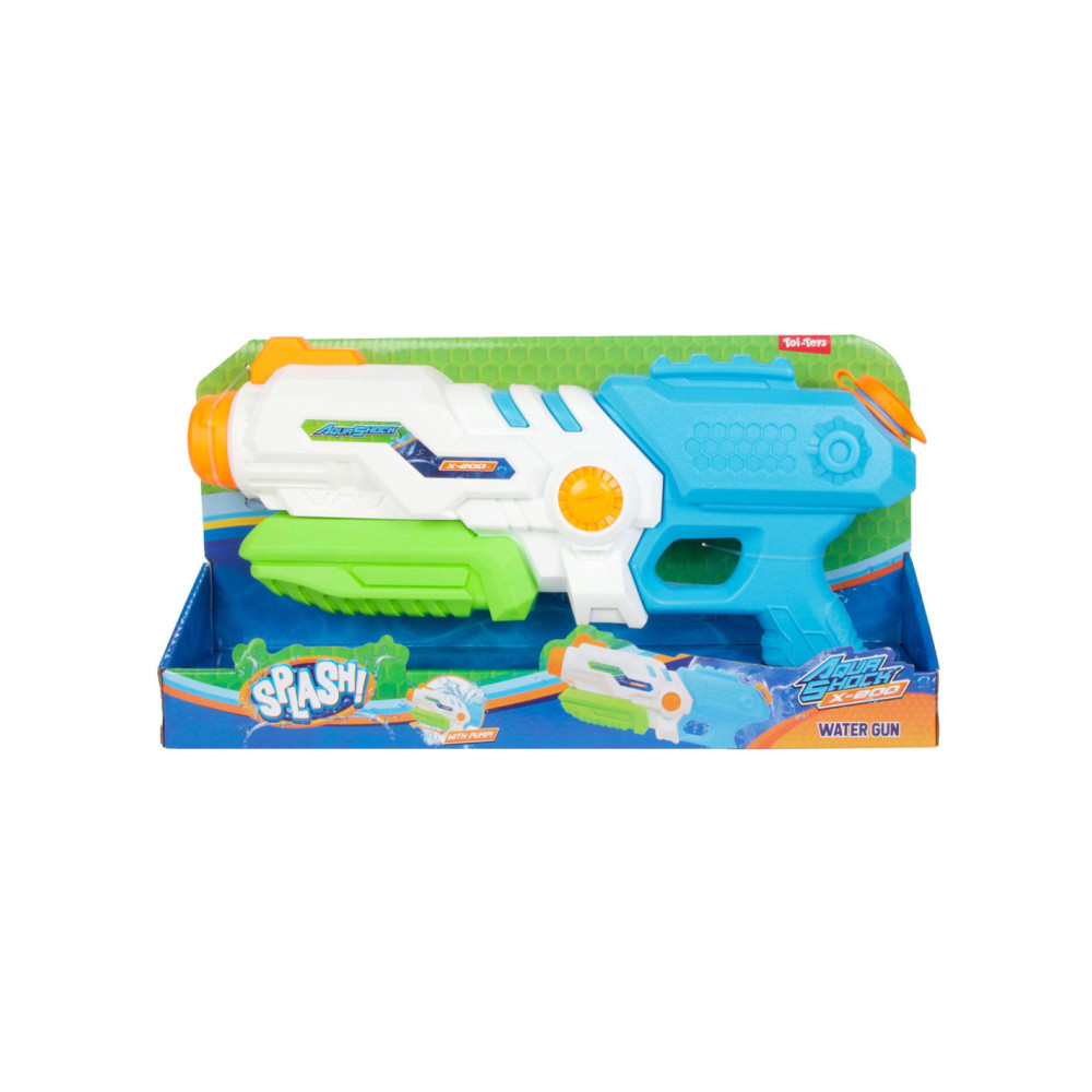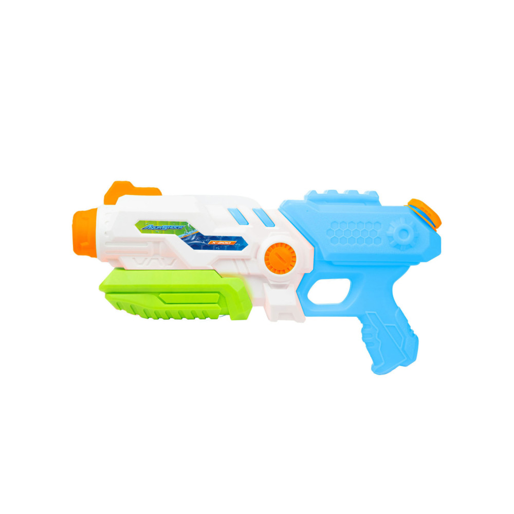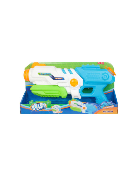 SPLASH Hexagon Waterpistool met een tankinhoud van 850 ml. Het waterpistool is wit met blauw, groen en oranje details en is ca. 41 centimeter lang.
