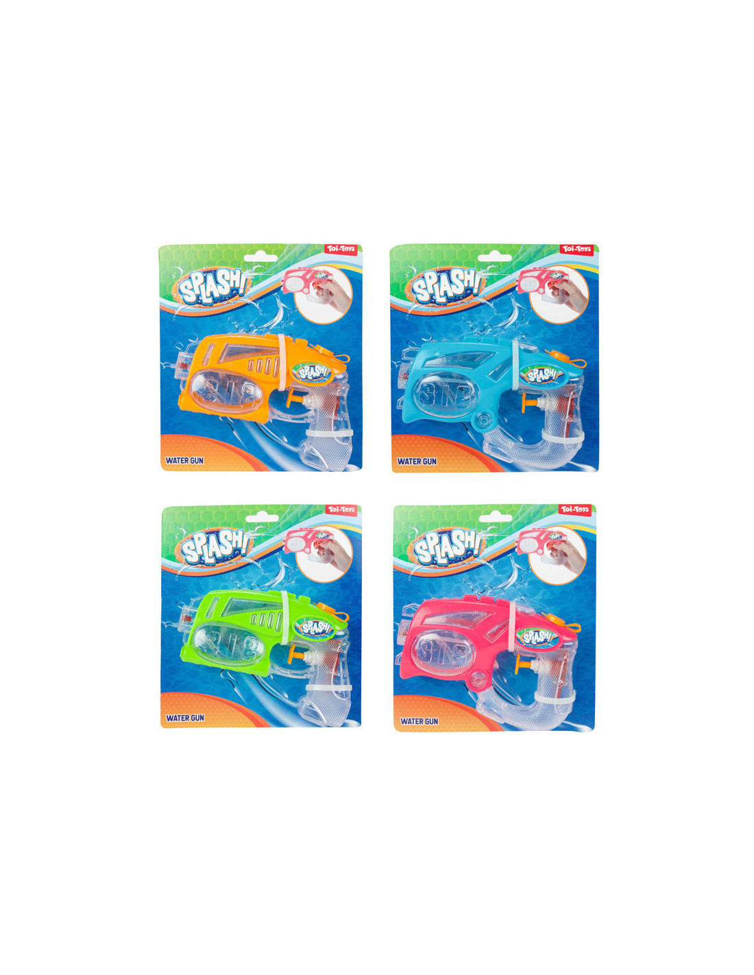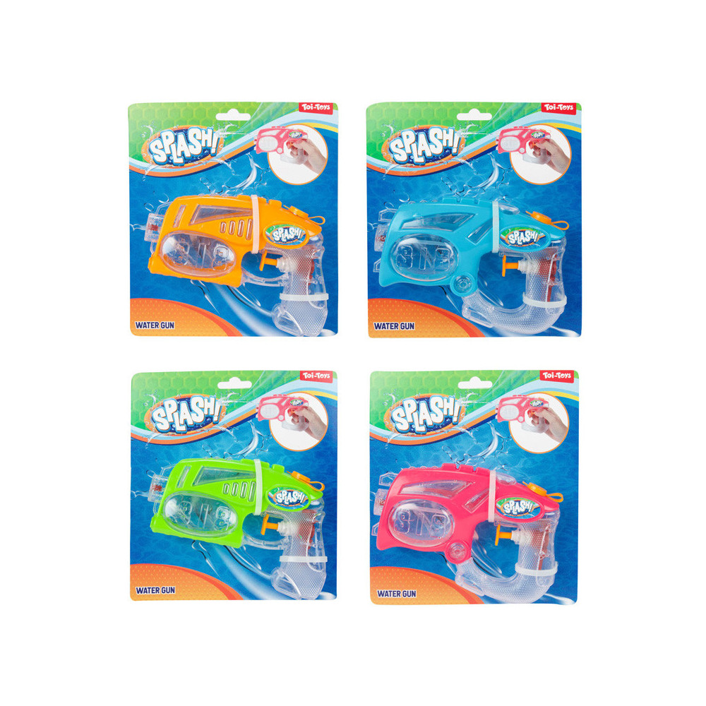 SPLASH waterpistool, deels transparant en deels in neonkleuren (groen, roze, blauw en oranje). Geschikt vanaf 3 jaar.