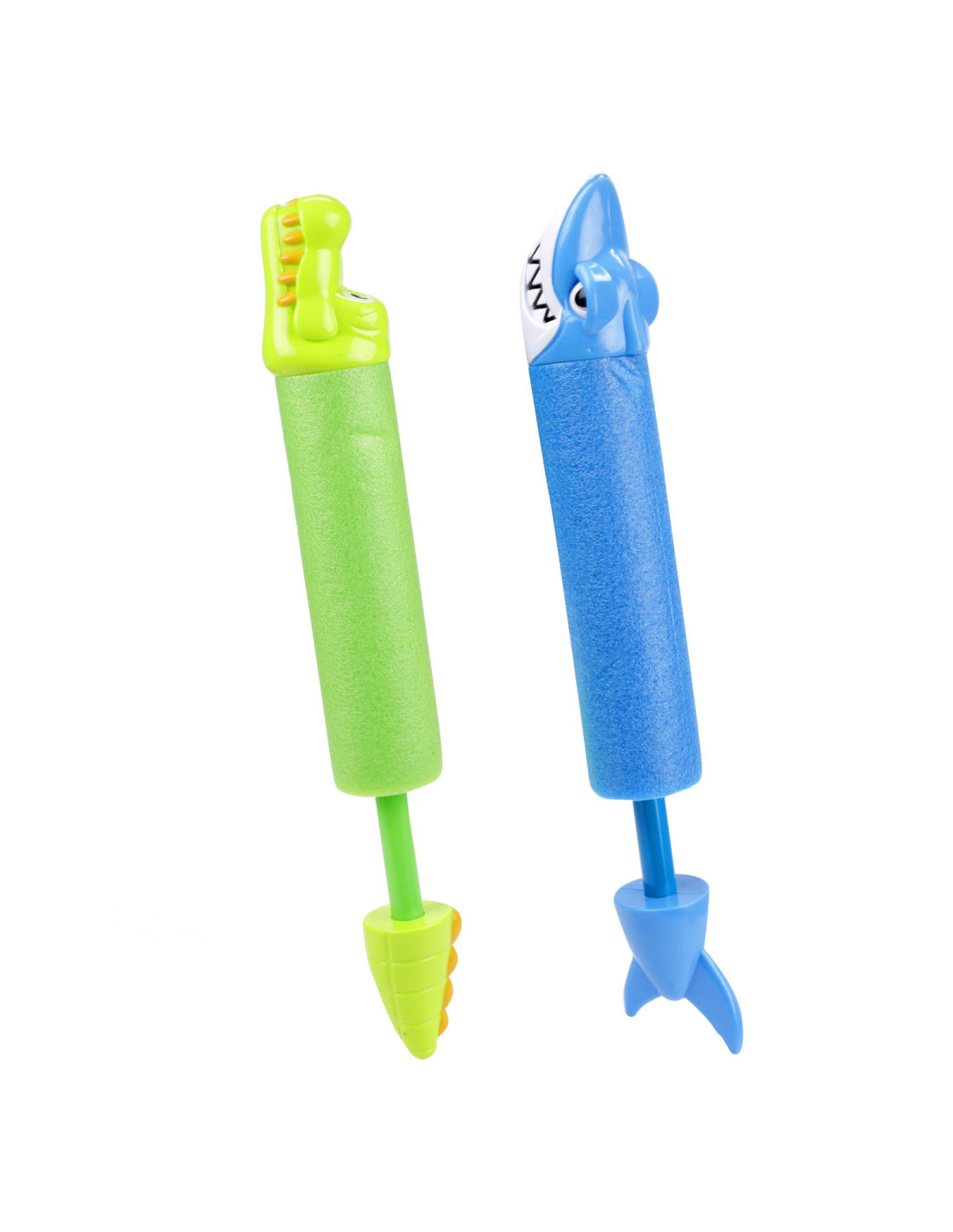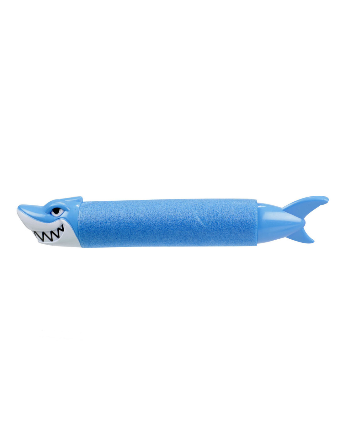 Foam waterspuiter met dierenkop en -staart (haai of krokodil). De waterspuiter is 32 centimeter lang en heeft een waterreservoir van 100 ml.