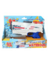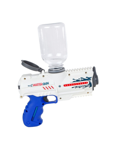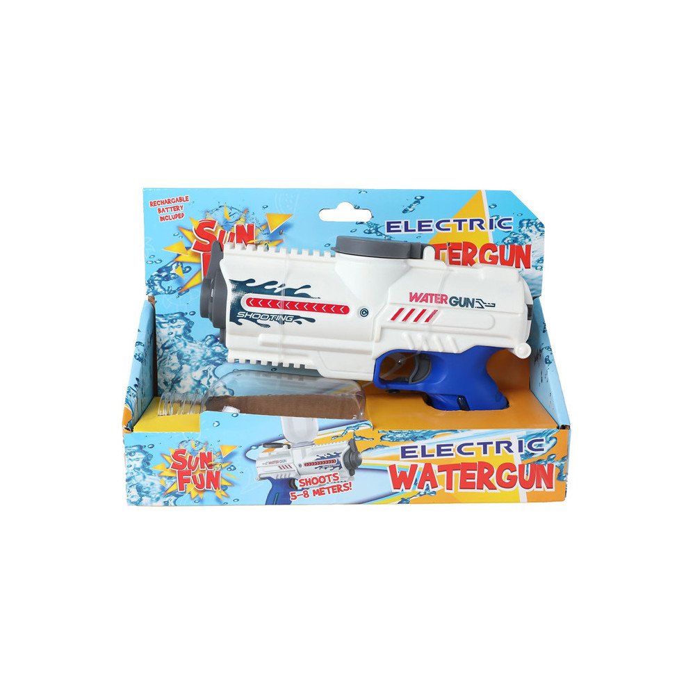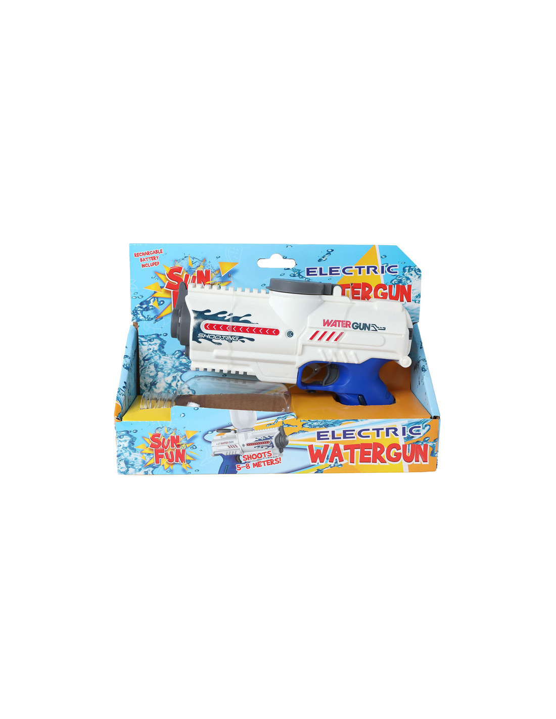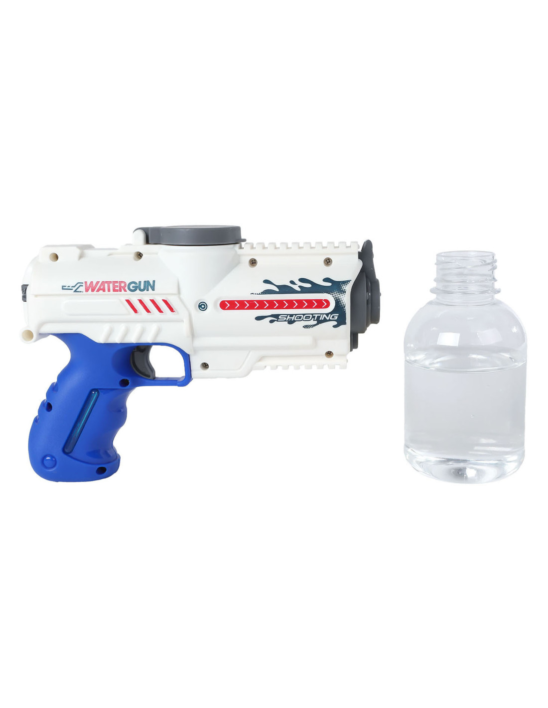 Sun Fun elektrisch waterpistool in wit en rood, met fles voor het vullen. Het waterpistool wordt geleverd met batterijensetje en is 18 centimeter groot.