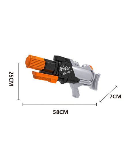Ga op zoek naar je vriendjes/vriendinnetjes en start een watergevecht met dit waterpistool in grijs/oranje tinten! Het waterpistool is 58 x 7 x 25 centimeter groot en geschikt voor kinderen vanaf 3 jaar.