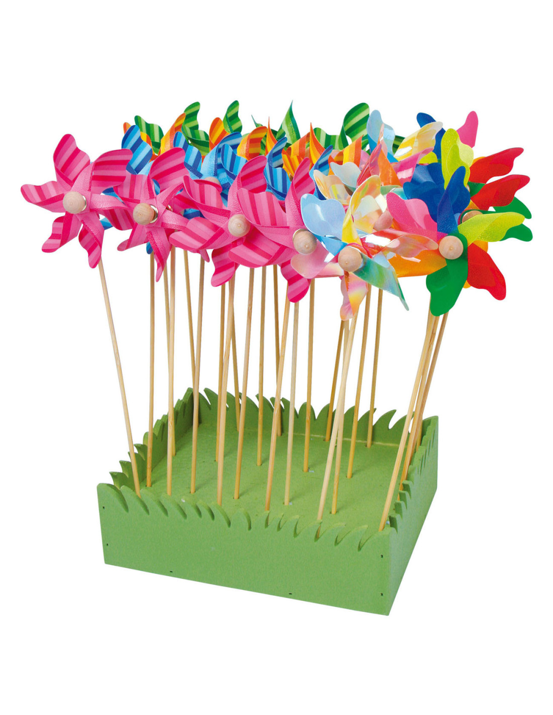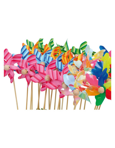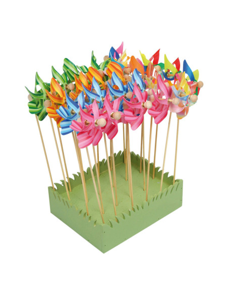 Deze kleine, gekleurde windmolens met houten handvat zijn een lust voor het oog in bloempotten, bloembedden en op vele andere plaatsen! Het multiplex frame met polystyreen inzet biedt ruimte voor 24 windmolens. Gelamineerd houten frame met polystyreen inzetstuk, ook geschikt voor decoratieve bloemen en vergelijkbare artikelen. Inhoud: 24 stuks.