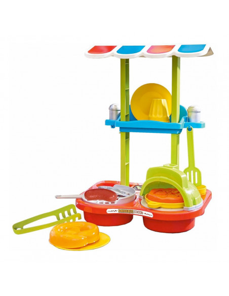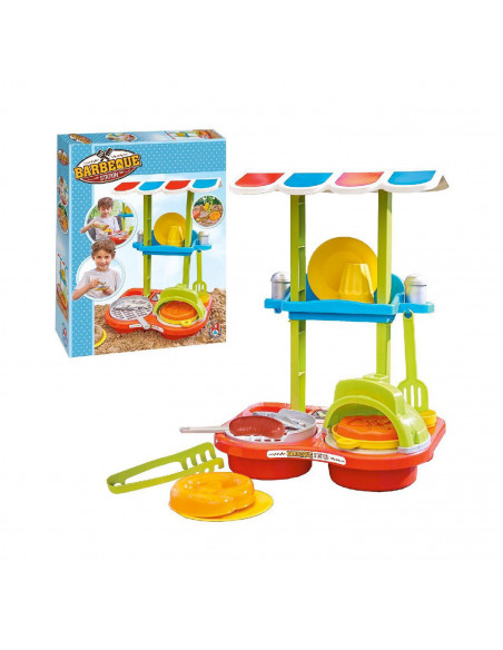 Met deze kleurrijke Barbecue Grill haal je direct het zomerse gevoel in huis! Dankzij de vrolijke kleuren en het zonnescherm brengt deze barbecue meteen een glimlach op ieders gezicht. Of je nu in de zandbak, op het strand of gewoon binnen met speelzand speelt, met dit barbecue station creëer je een echt vakantiegevoel.