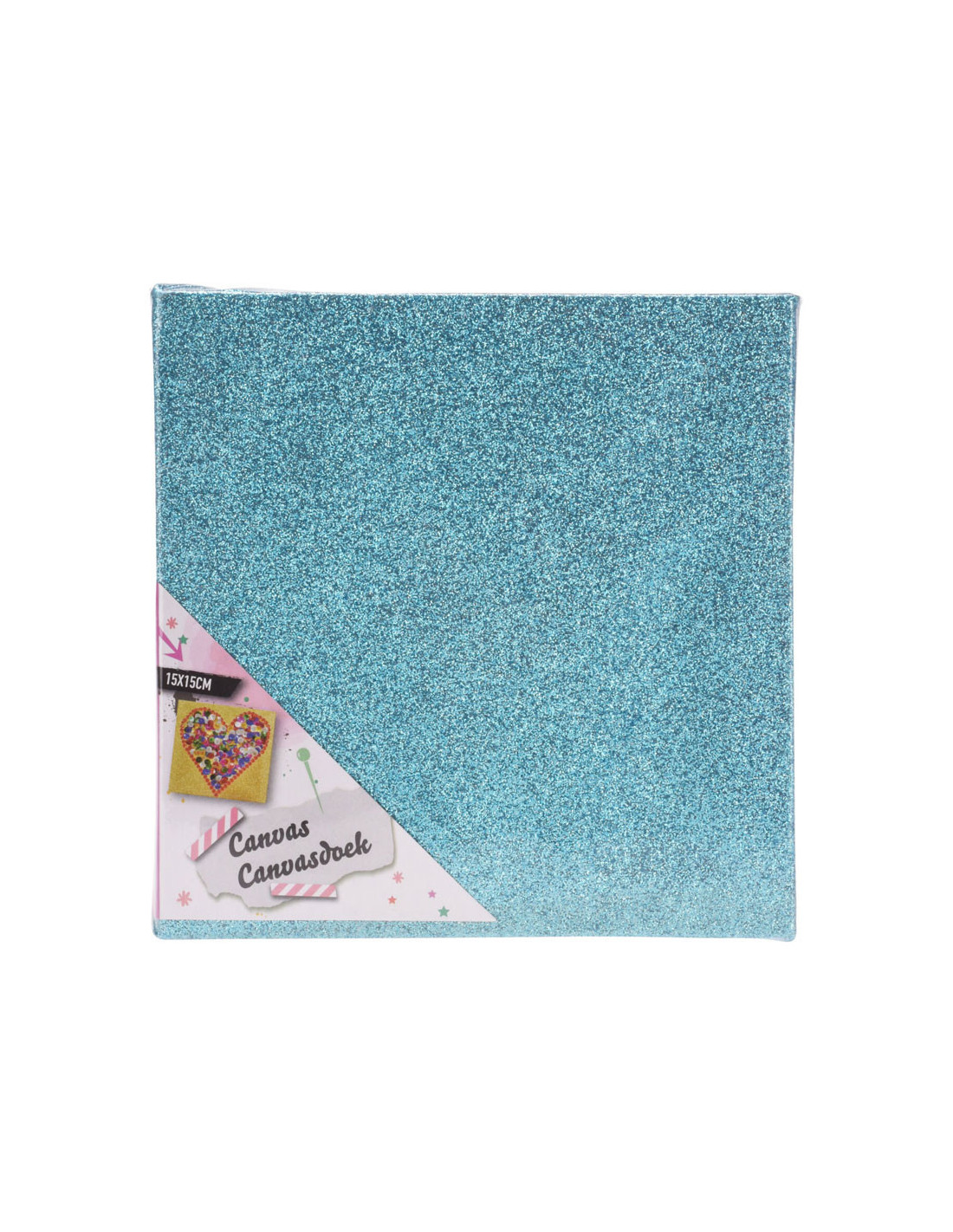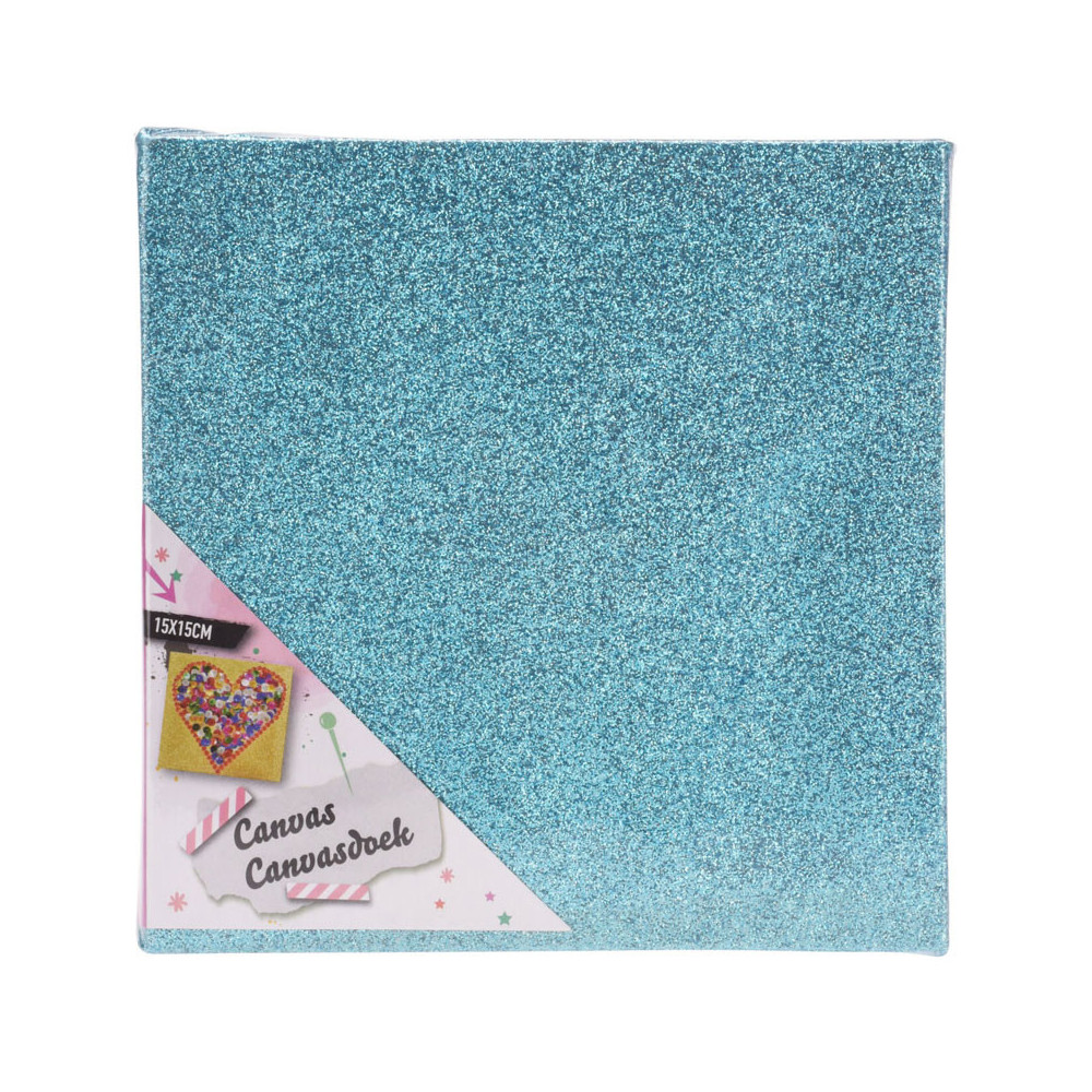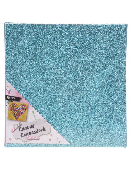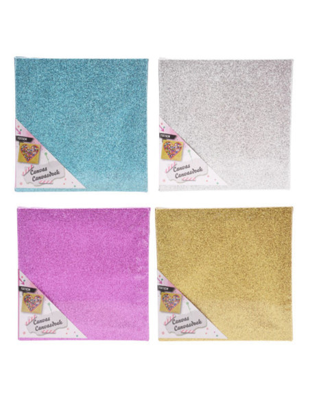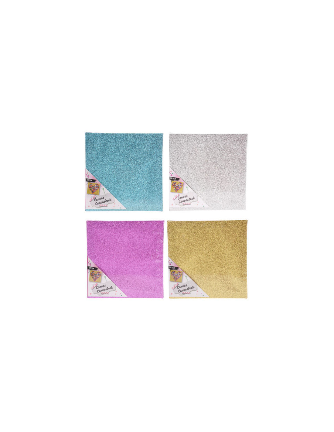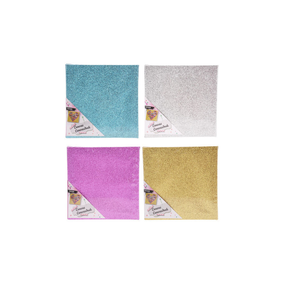 Set van 12 glitter canvasdoeken in blauw, roze, zilver en goud. De doeken zijn 15 x 15 centimeter groot en geschikt om mee te knutselen.